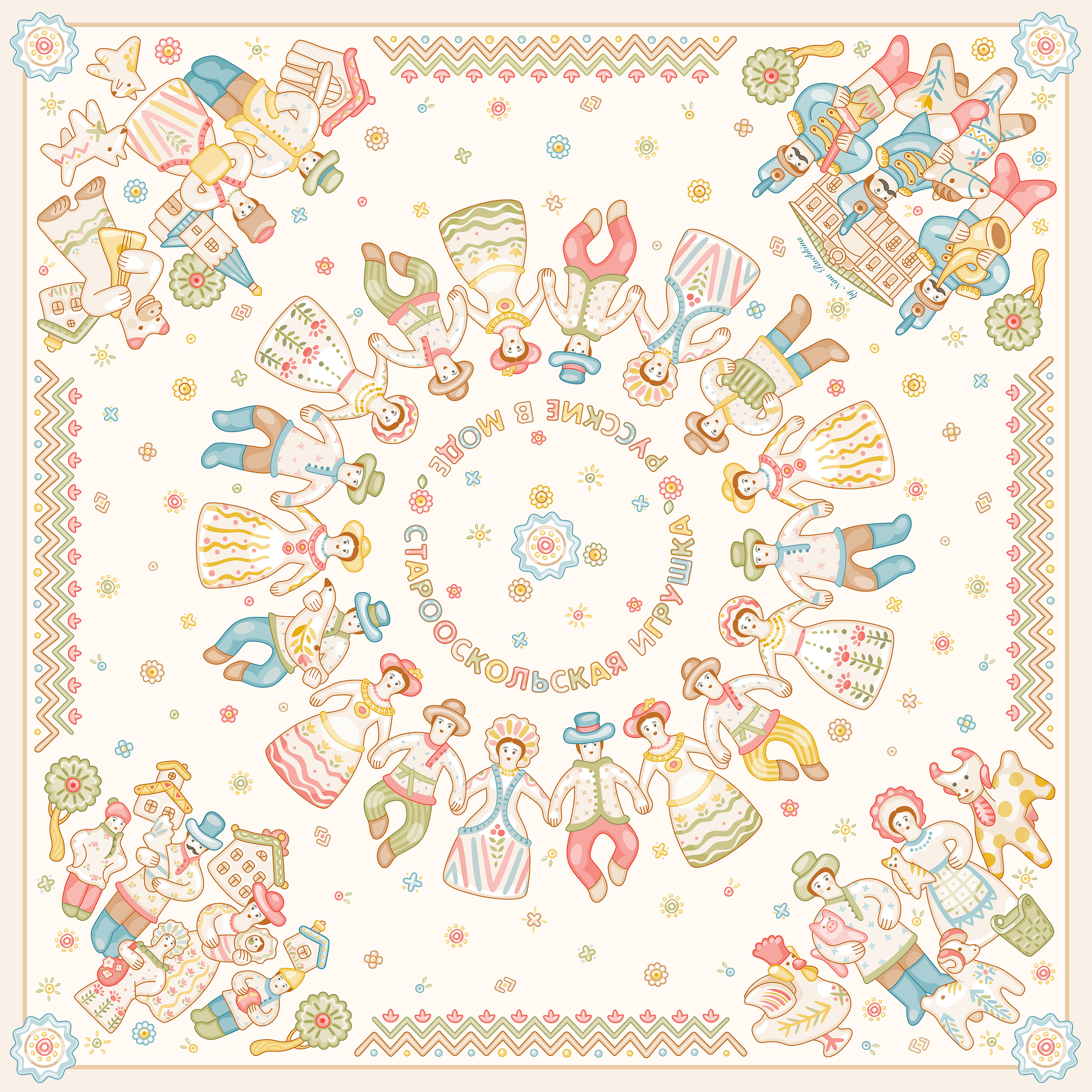Нежный и воздушный изящный платок «Старооскольская игрушка» воплощает панораму прекрасных фигурок, выполненных в потомственных канонах лепки Оскольского края. Это бело-глиняные расписные образы барышень и кавалеров, крепких семей, затейливых зверей и зданий, фигурки бравых воинов, поражающих великолепием амуниции. Центральная композиция представляет хоровод пляски «Пересек», связанной с танцевальной культурой Белгородской земли.