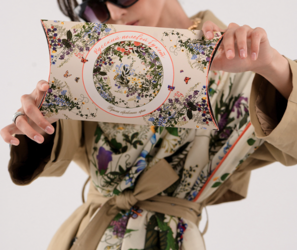 Конечно, шаль «Русский полевой букет» — это и дорогой сердцу подарок, и памятный сувенир, который уместен по любому случаю. Дизайнер Нина Ручкина и художник Ксениия Ковражкина образно-метафорически отразили в композиции притягательность и благостность России, одним из символов которой традиционно считается русский полевой букет. Каждое изделие помещено в фирменную упаковку, что бы усилить приятные впечатления.