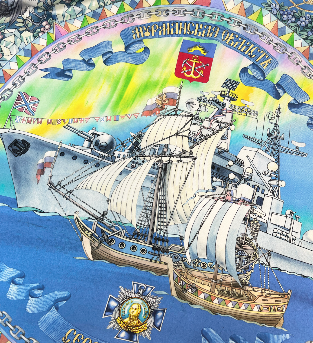 Платок посвящен славе форпоста российской Арктики и Северного флота — Мурманской области. «Город на Мурмане» или Мурманск — ныне Город-Герой и один из самых значимых портов России, поражающий богатством истории и природы. Мурманск — это крупнейший в мире город, расположенный за Северным полярным кругом.