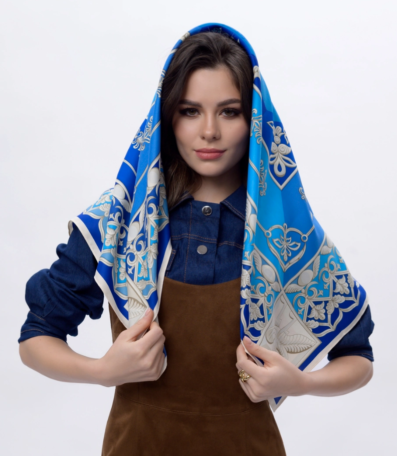 Платок «Собор Василия Блаженного» — воплощает один из самых значимых памятников древнерусской архитектуры, знаменитый на весь мир духовный символ Москвы и России. Этот уникальный ансамбль состоит из 11 церквей, где Восточная церковь посвящена основному догмату христианской веры — Святой Троице.
