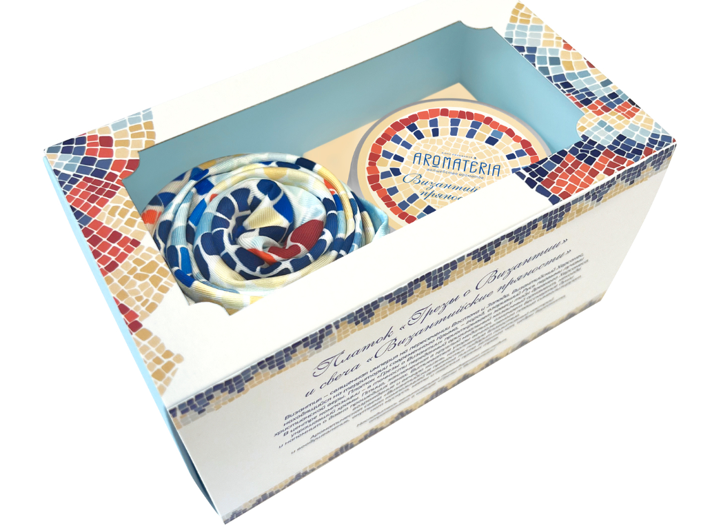 Набор: платок «Грезы о Византии» и свеча «Византийские пряности» в подарочной коробке. Византия — священная империя на пересечении Востока и Запада. В центре композиции платка — в точности переданный оригинальный мозаичный орнамент, некогда украшавший храмы древнего византийского города Херсонеса, расположенного на территории современного Крыма. Ароматическая свеча «Византийские пряности» подарит позитивный настрой и воодушевление, окутывая композицией терпких и пряных аккордов.