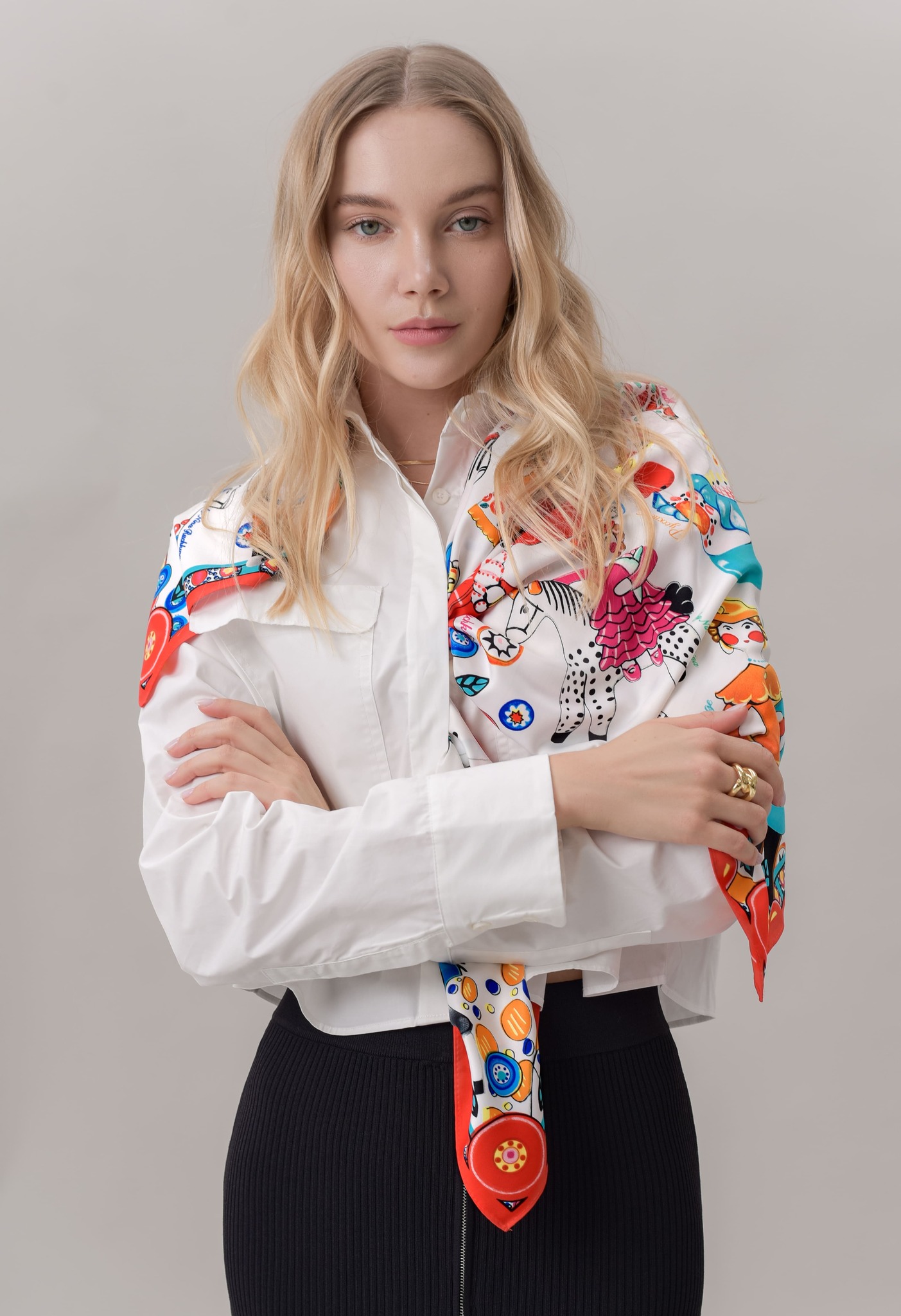 Аксессуар отлично подойдет как преподавателю, так и студентке. Платок хорошо сочетается с блузами и рубашками белого цвета, с любыми другими базовыми вещами. Может носится как бандана или стать украшением сумки.