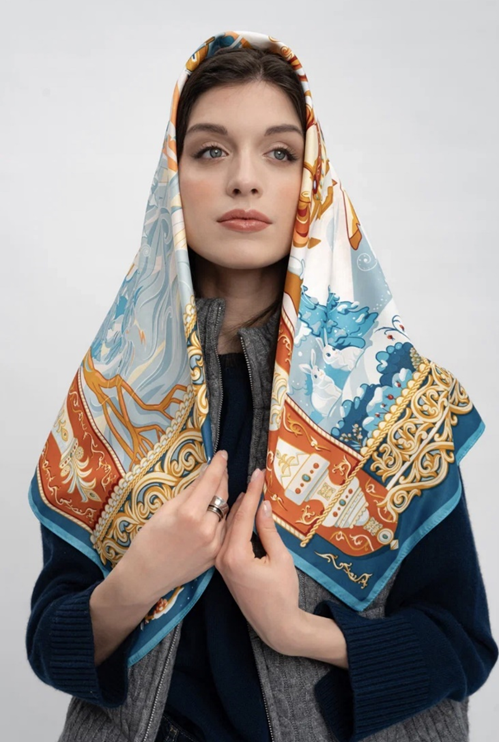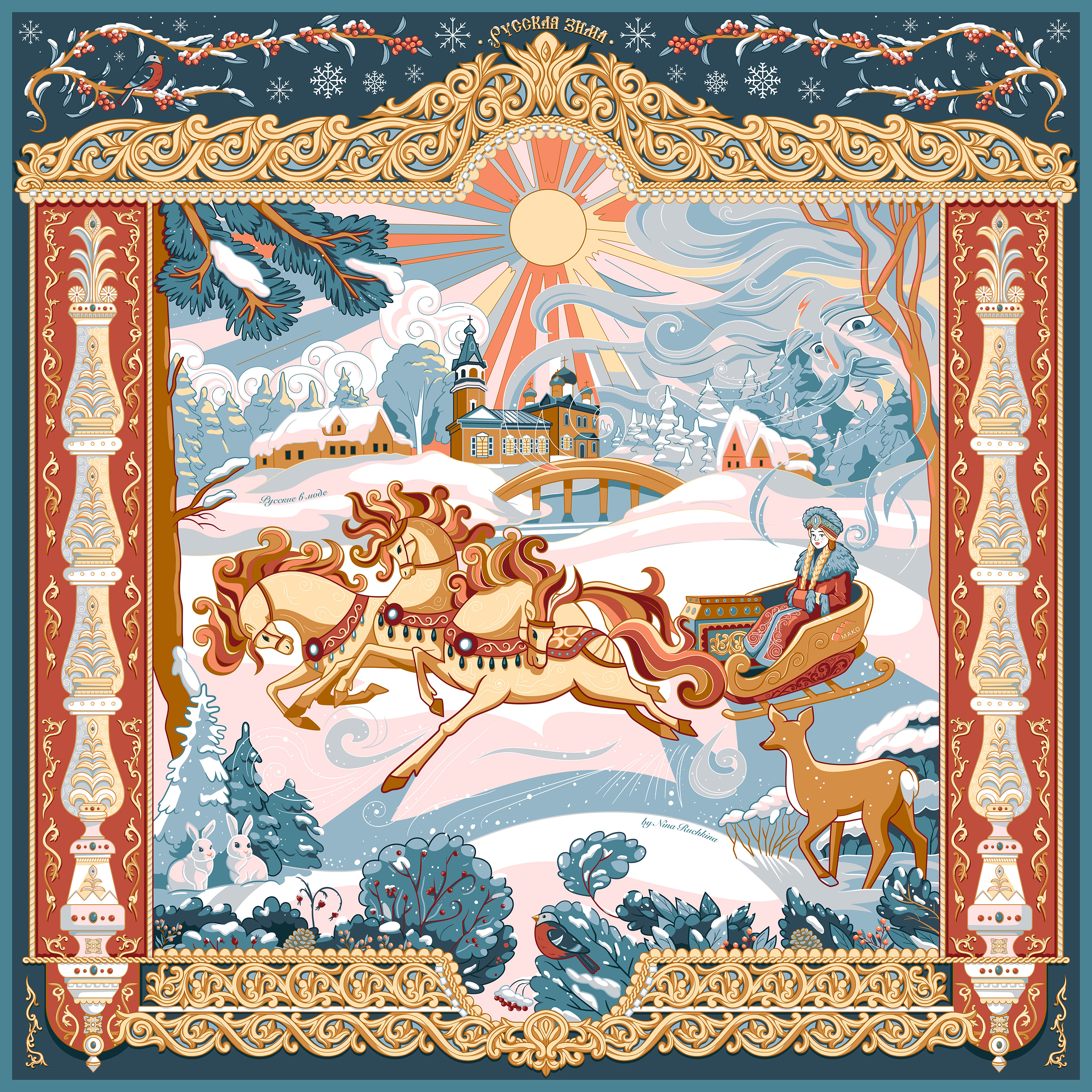 Дизайнер Нина Ручкина поделилась с аудиторией историей создания аксессуара: «Для России зима — особый сезон, имеющий исключительное место в культуре. Зимушка-зима, как ласково называли ее на Руси, в нашем национальном сознании сопряжена с понятиями народности, единения, жизненной силы и огня —” Тепло ли тебе, девица? Тепло ли тебе, красная? — Тепло, Морозушко, тепло, батюшка”. Или, например, строки поэта А.С. Пушкина: “Но бури севера не вредны русской розе. / Как жарко поцелуй пылает на морозе! / Как дева русская свежа в пыли снегов!". В русской литературе символика зимы амбивалентна — это и метафора забвения, но и образ чистоты и обновления, время сурового холода, но и время сплочённости, прорыва; зима придаёт жизни давность, олицетворяет завершение, но и несёт собой рождественское чудо, надежду. Строки о зиме поэта современности Анны Ревякиной тонко передают эти особенности русского мировидения:” Зимы чистописание про всех, / однажды нас с тобой укроет снег, / и на изнанке синеватых век / проступят цифры старых телефонов". Отечественные сказы и легенды изобилуют зимними сюжетами и мотивами, некоторые из которых мы изобразили на платке “Русская зима”».