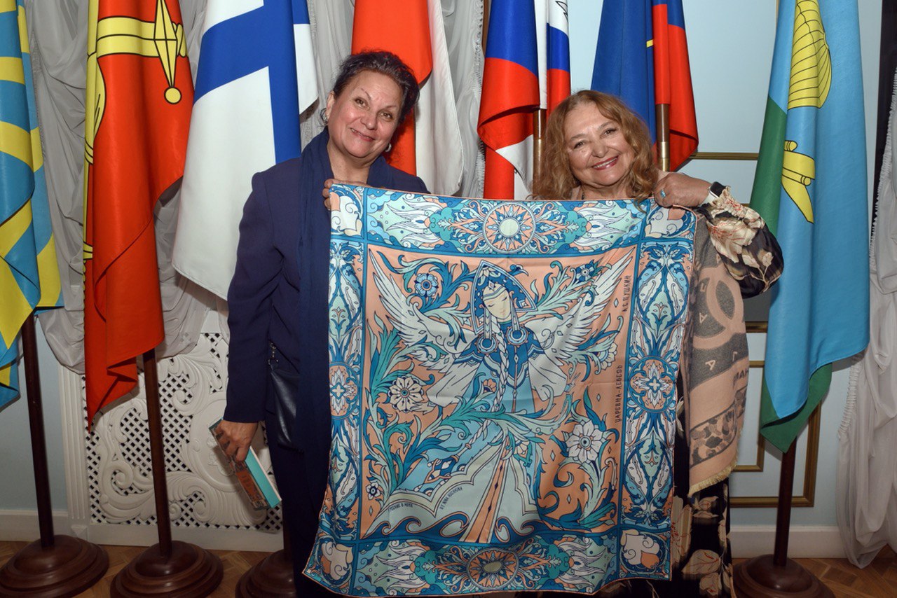 Татьяна Бабина и Наталье Бондарчук, Председатель жюри кинофестиваля "Святой Владимир" . Платок "Царевна Лебедь" бренда "Русские в моде"