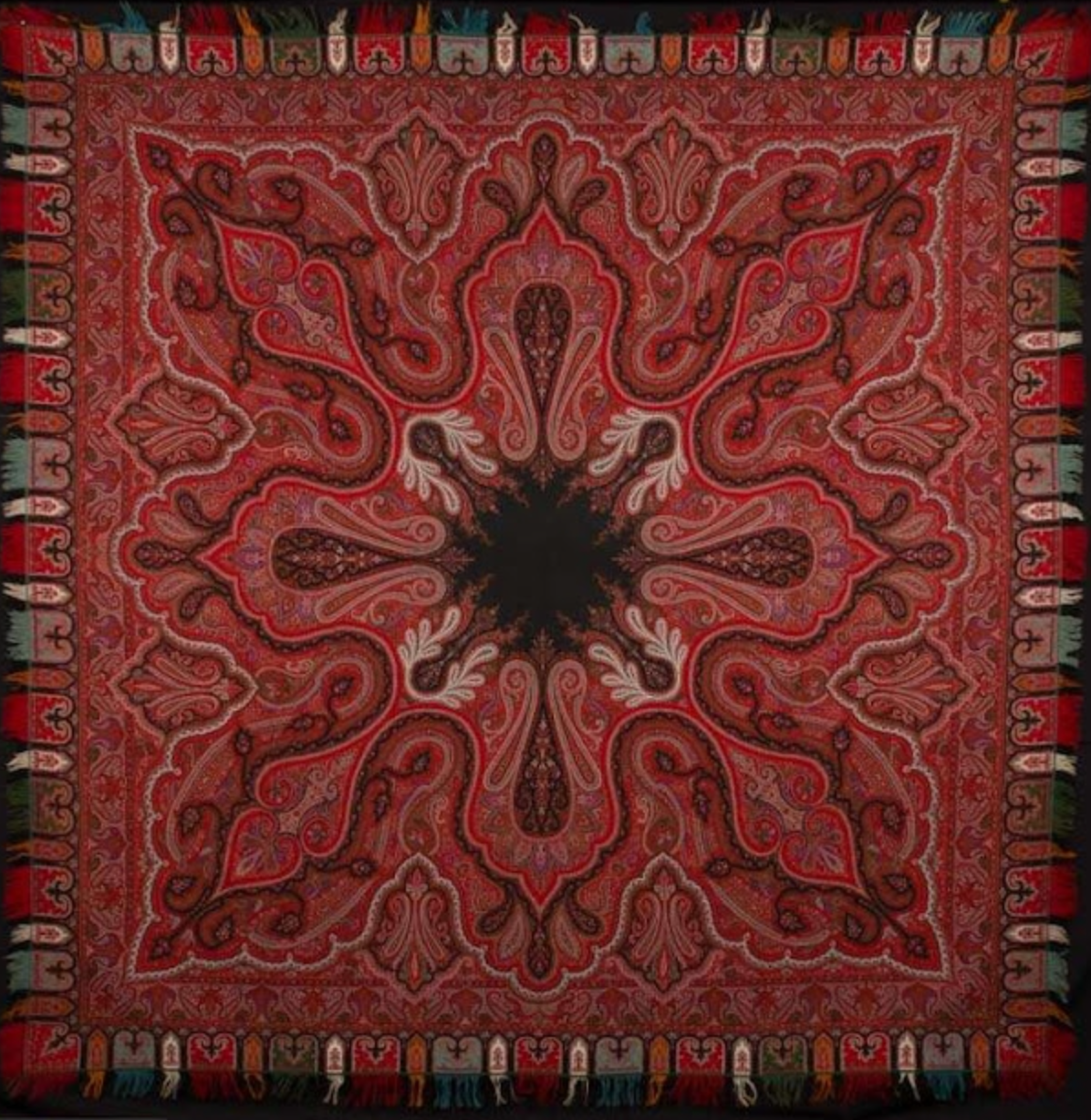Шаль, 1820-е, Россия. Шерсть, двустороннее ткачество. Кайма на одной из "колокольцевских" шалей, где восточный "огурец", если присмотреться, состоит из таких нам знакомых, уже ставших классическими, "русских" цветочков