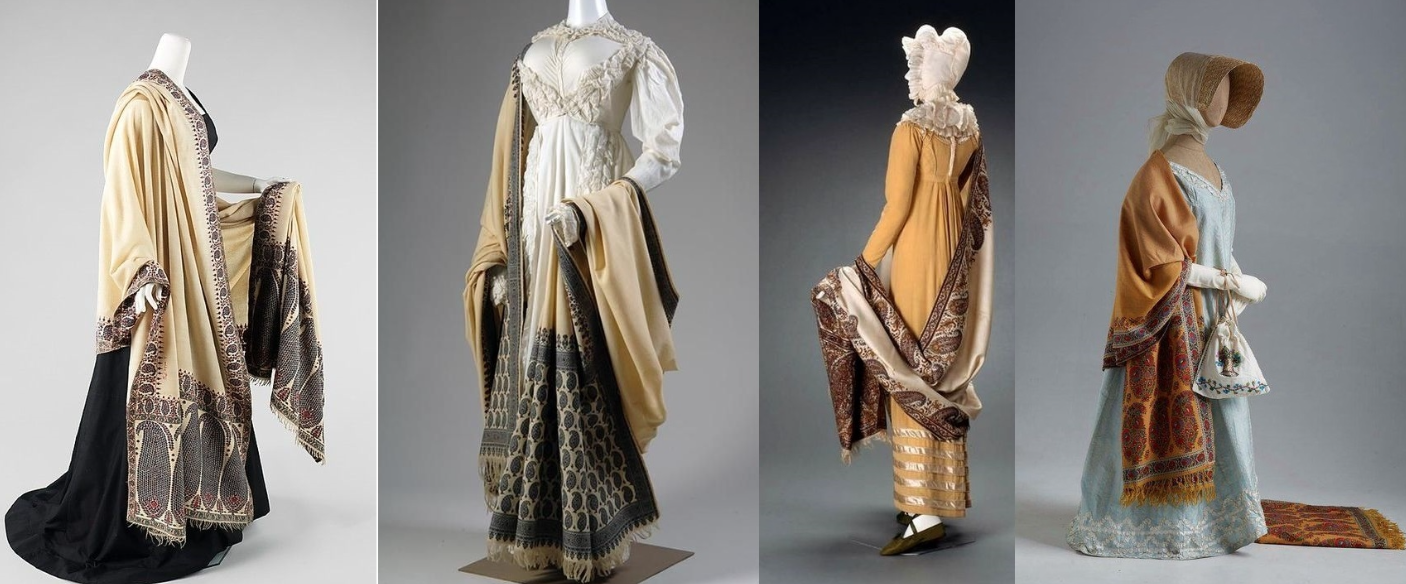 Мода на шали возникла во Франции в связи с наполеоновскими походами в Египет и затем распространилась на многие европейские страны, в которых в ответ на спрос открывались собственные местные производства.