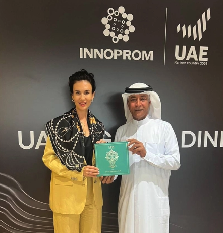 Дизайнер Нина Ручкина дарит дипломатический сувенир-платок "Уральские арабески" представителю департамента культуры ОАЭ К. Буамаиму на международной выставке ИННОПРОМ-2024
