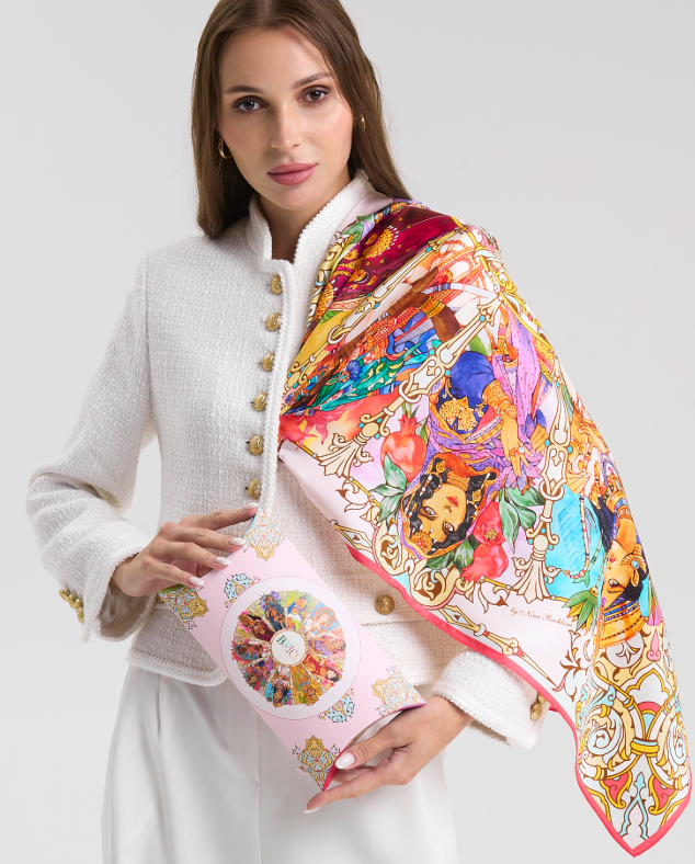 Платок "Уральские арабески" создан в качестве дипломатического сувенира к международной выставке ИННОПРОМ-2024. Концепция дизайна адресована диалогу культур России и ОАЭ. Полотно объединяет магию Востока и сакральную мифологию Урала, региона России.