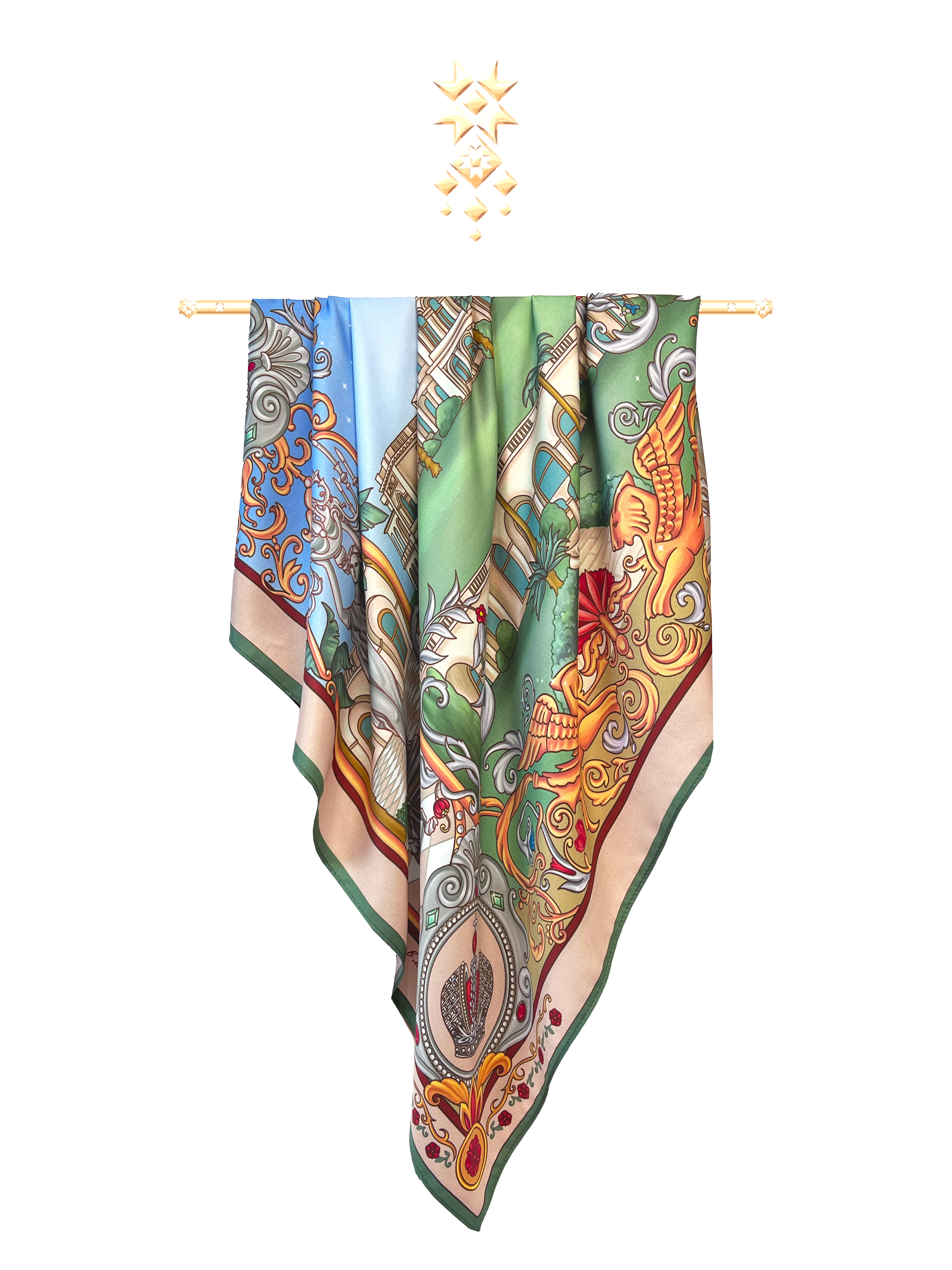 Над дизайном платка работали: Нина Ручкина, Валерия Разумова, Серафима Атаянц.