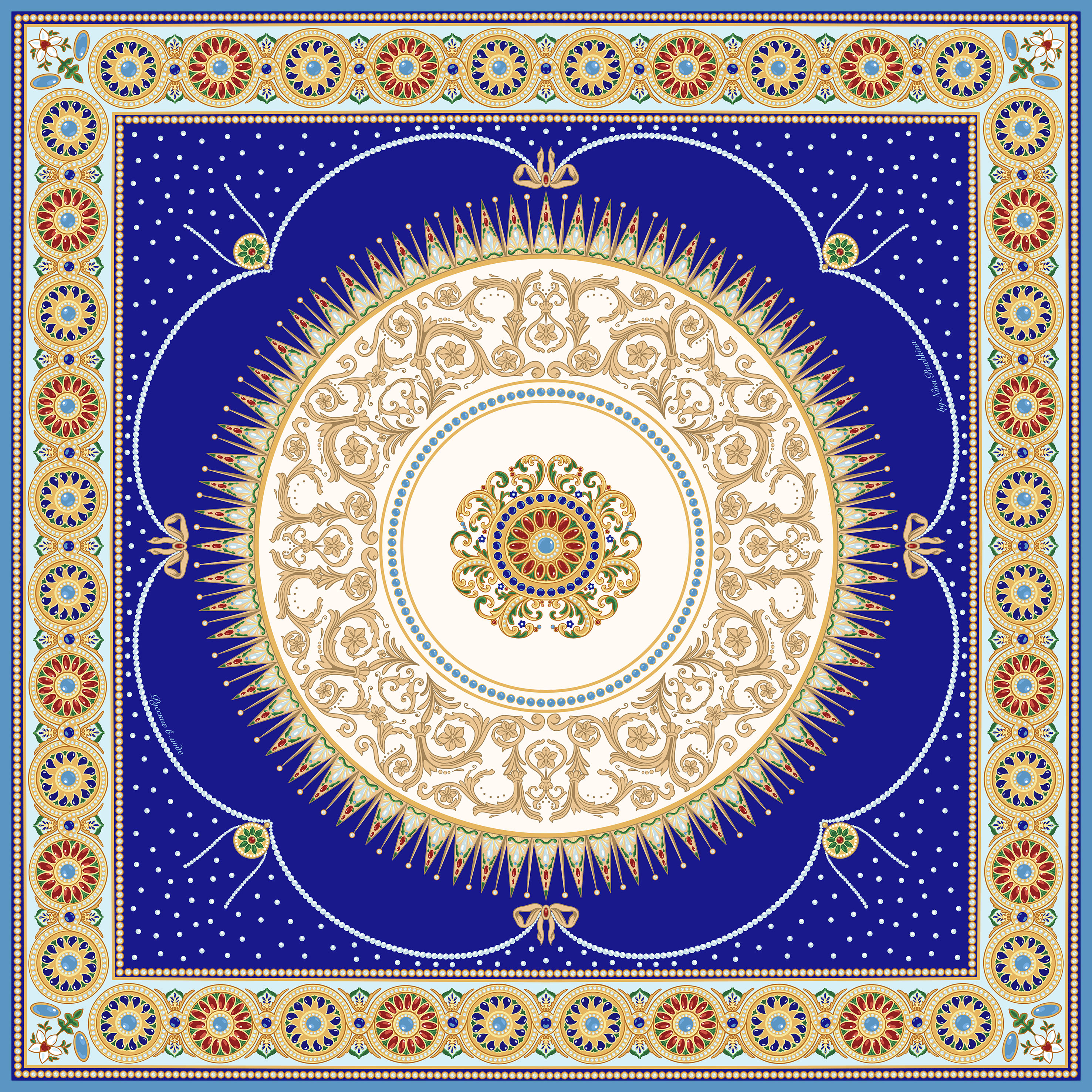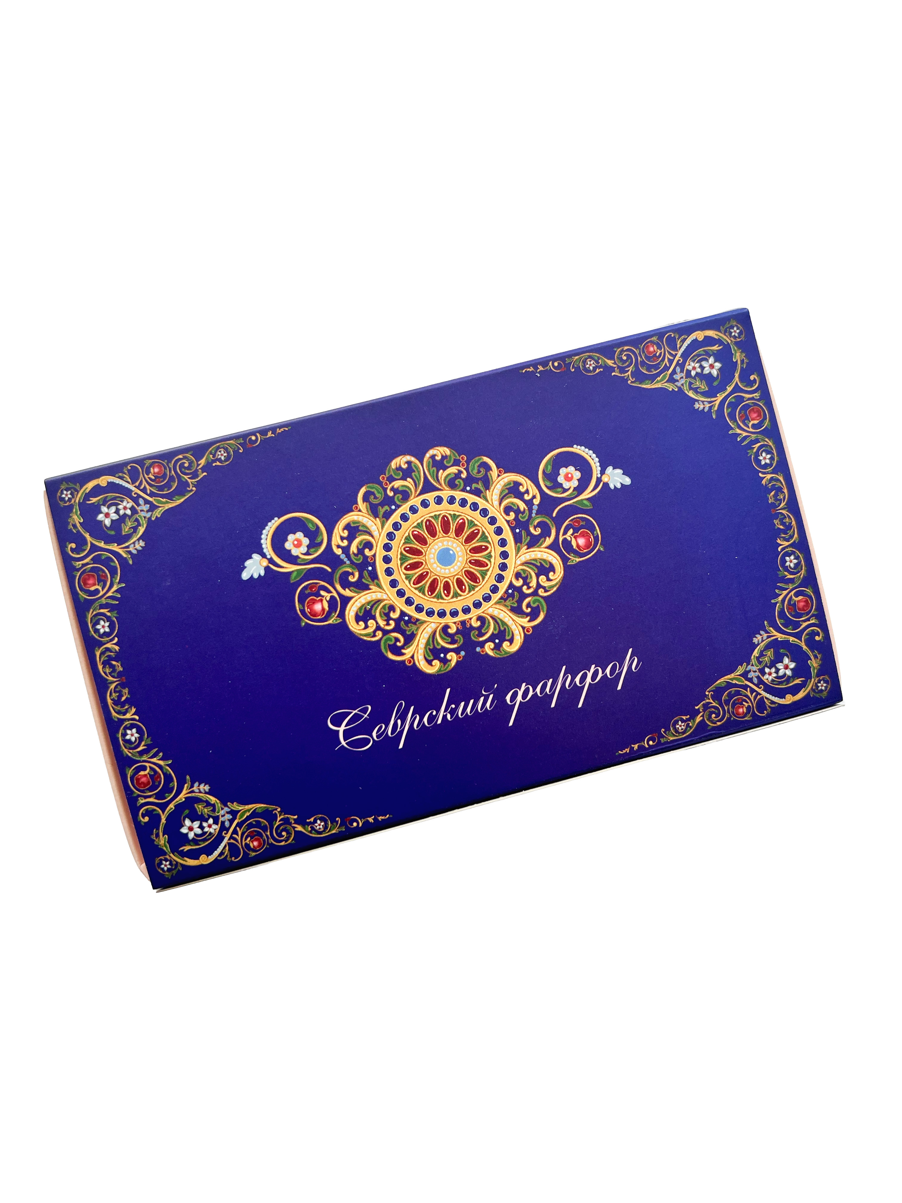 В центре полотна размещен изящный медальон, повторяющий оригинальный рисунок севрского фарфора, выполненного в ювелирной технике накладных эмалей и словно украшенного россыпью драгоценных камней. Цветовой строй воспроизводит парадную эстетику дворцового фарфора, где глубокий королевский синий в сочетании с золочёным орнаментом образуют гармоничное звучание.