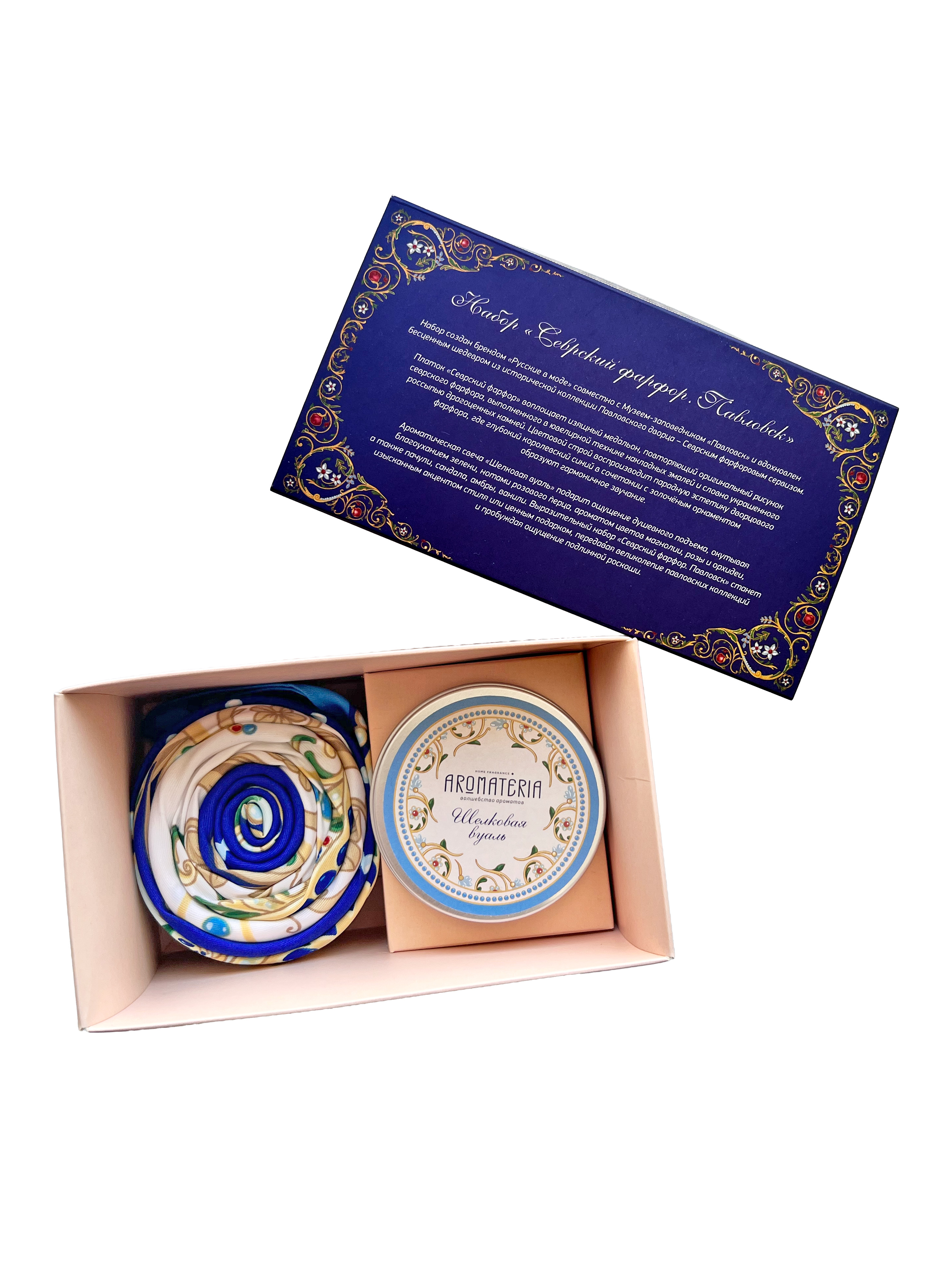 Набор состоит из платка «Севрский фарфор» от бренда «Русские в моде» и ароматической свечи «Шелковая вуаль» от «AROMATERIA».