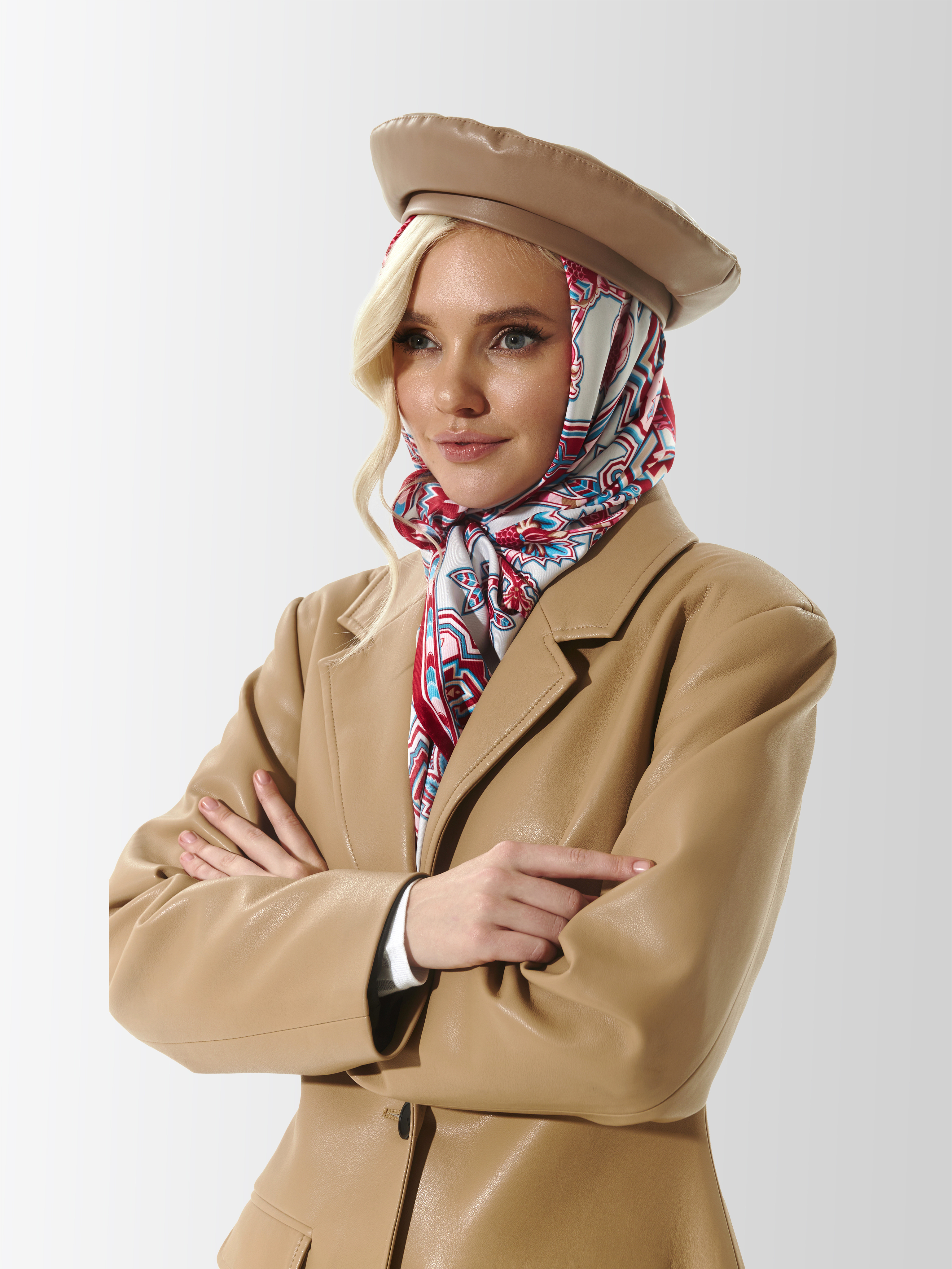 С него началось моё знакомство с продукцией Дома " Русские в моде". "Кавказский скакун " - это брызги свежего гранатового сока, яркие искорки южных морей, это наш нарядный триколор. Очень эффектен своей графичностью, темпераментом, молодостью. Меня порадовал жемчужно-серый фон, он практически всегда выигрышней к лицу. Уральские швеи порадовали качеством машинной обработки края. Буду хотеть теперь этот колорит в натуральном составе, пока его нет на сайте. Спасибо за платочек, дорогие, и спасибо за популяризацию платочной темы!