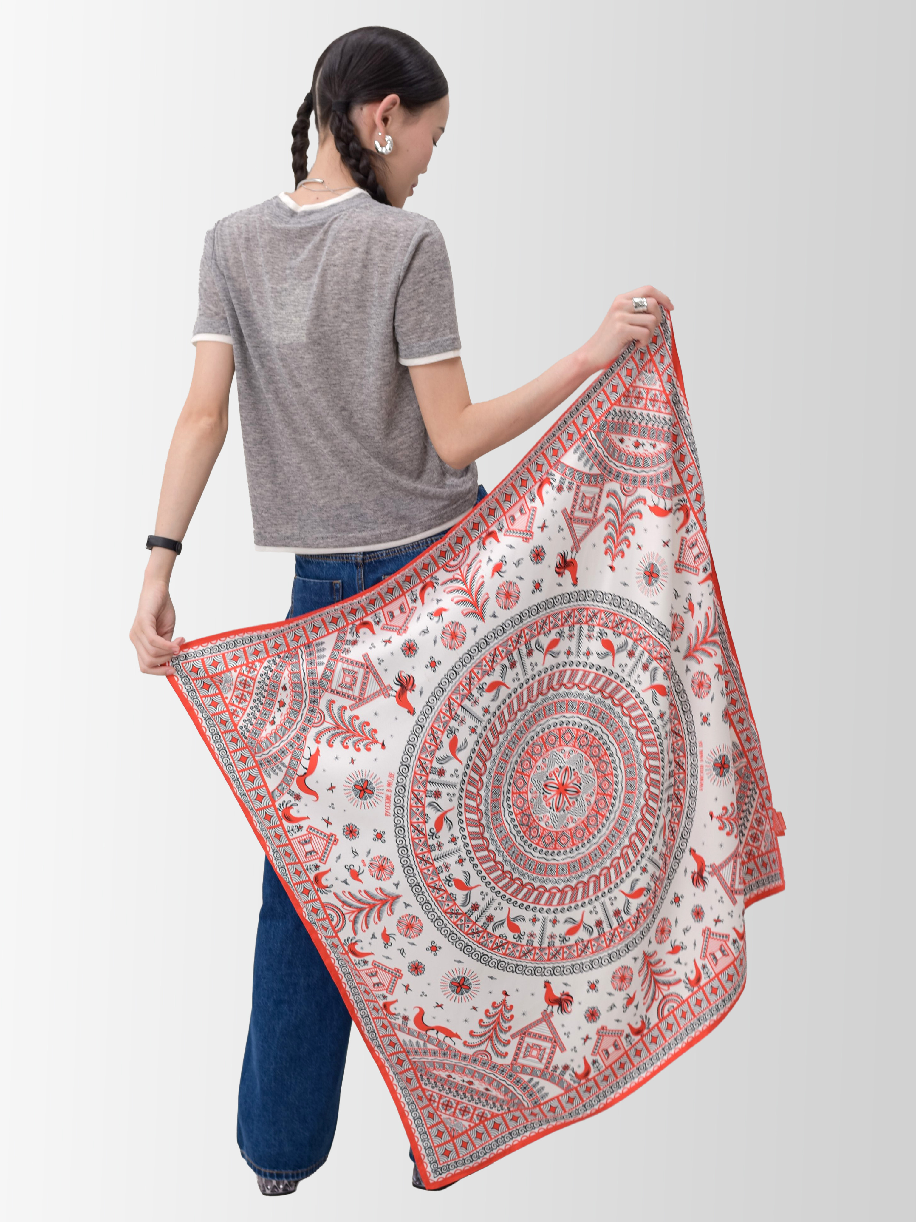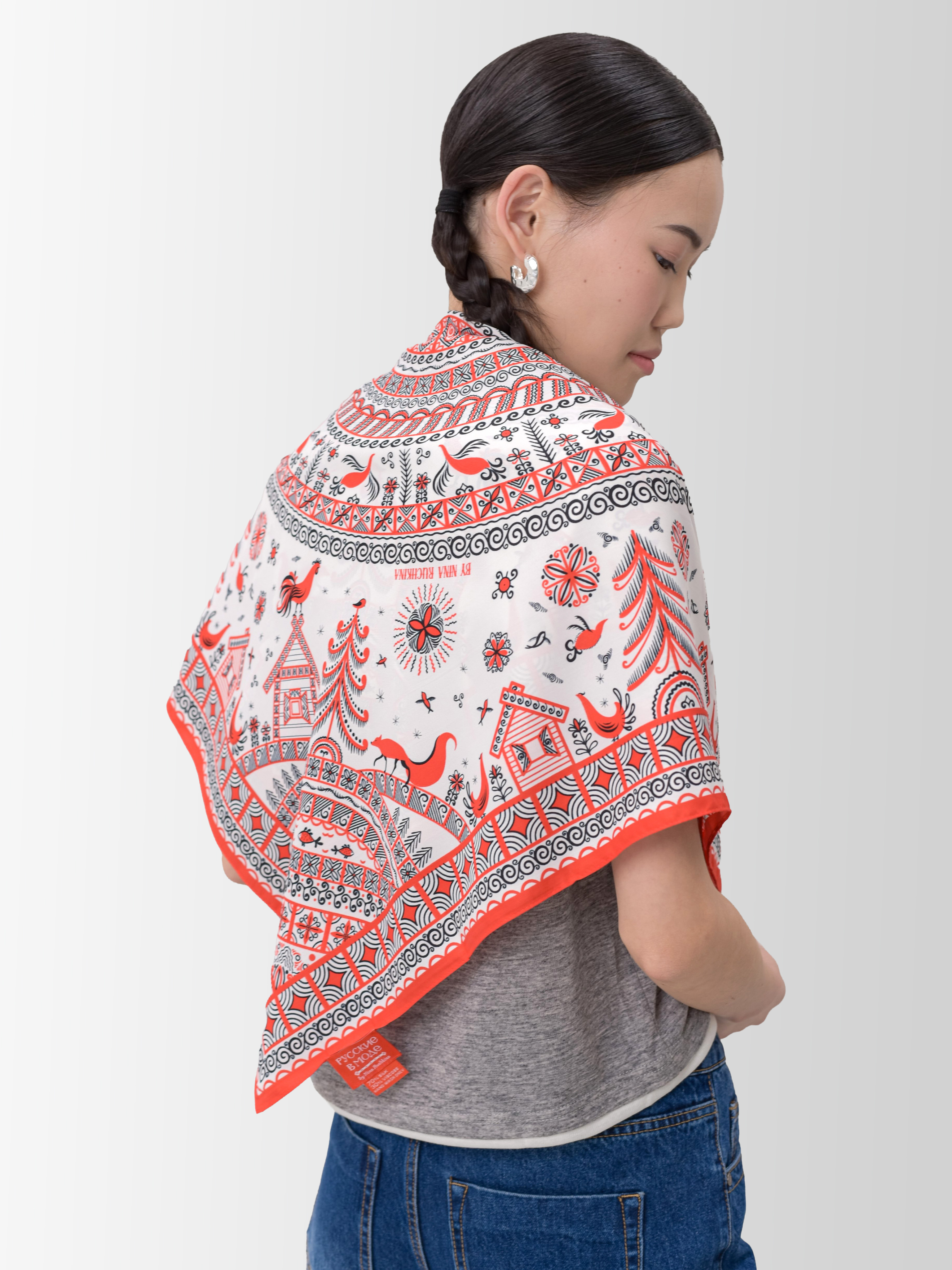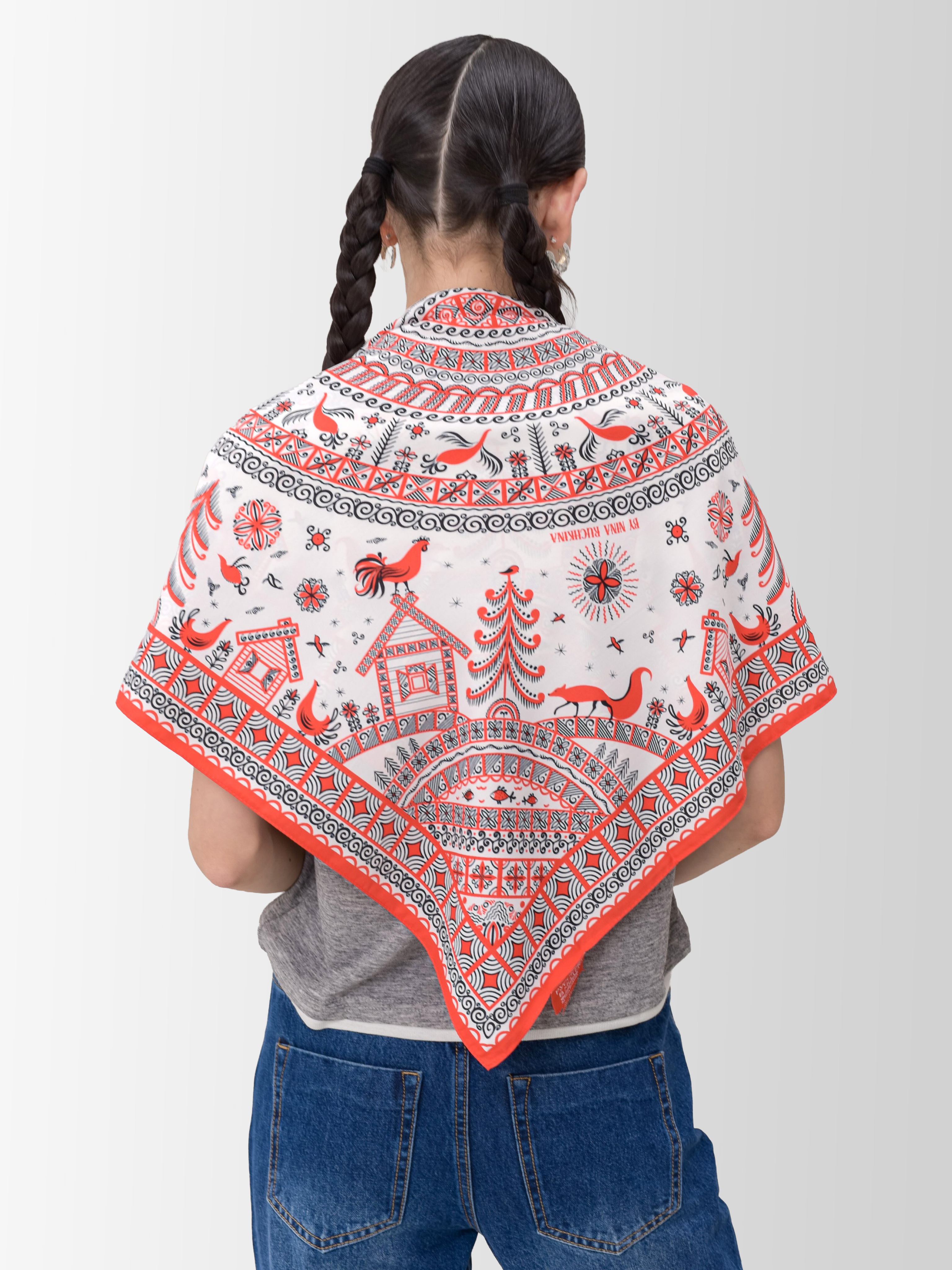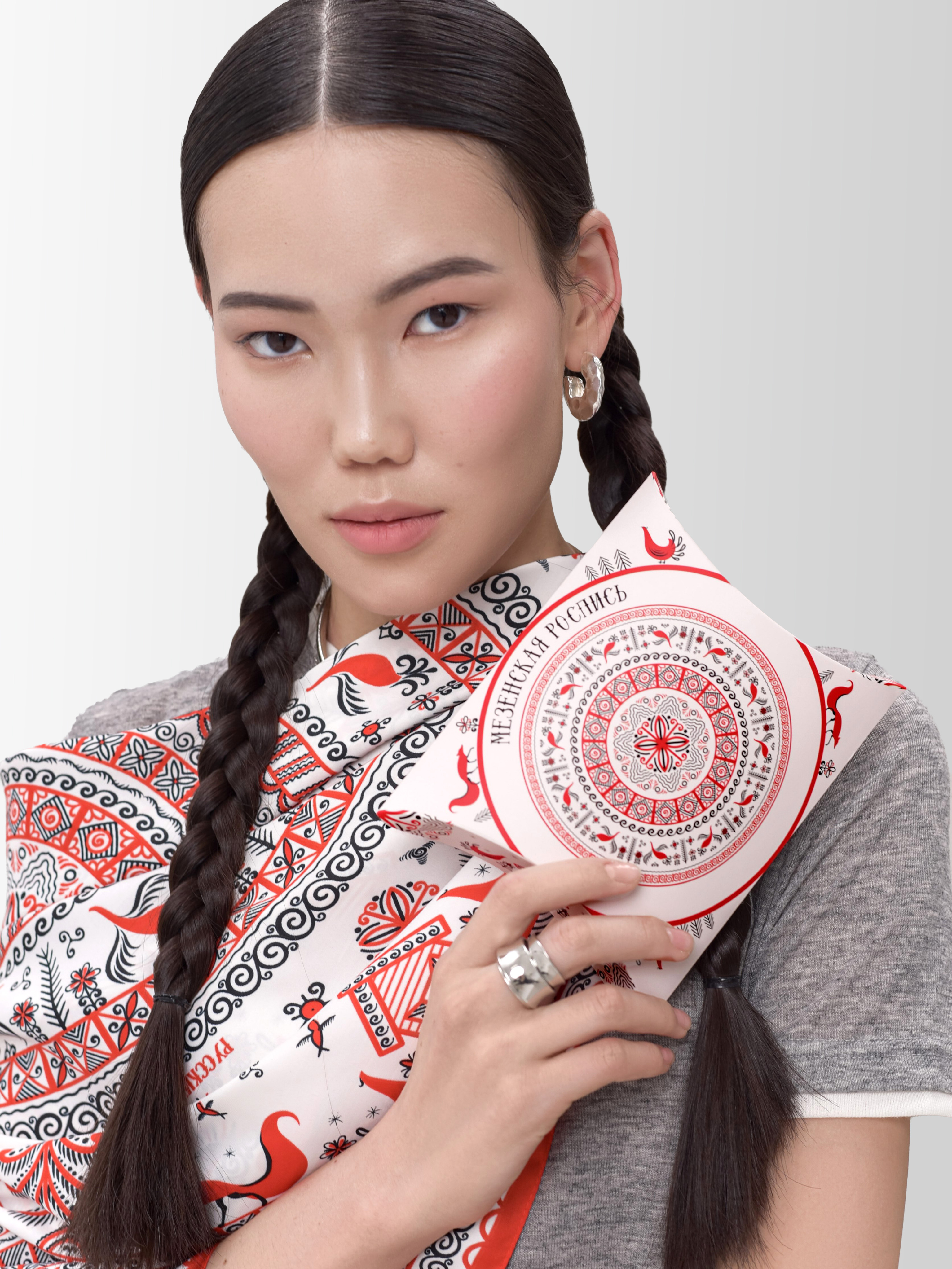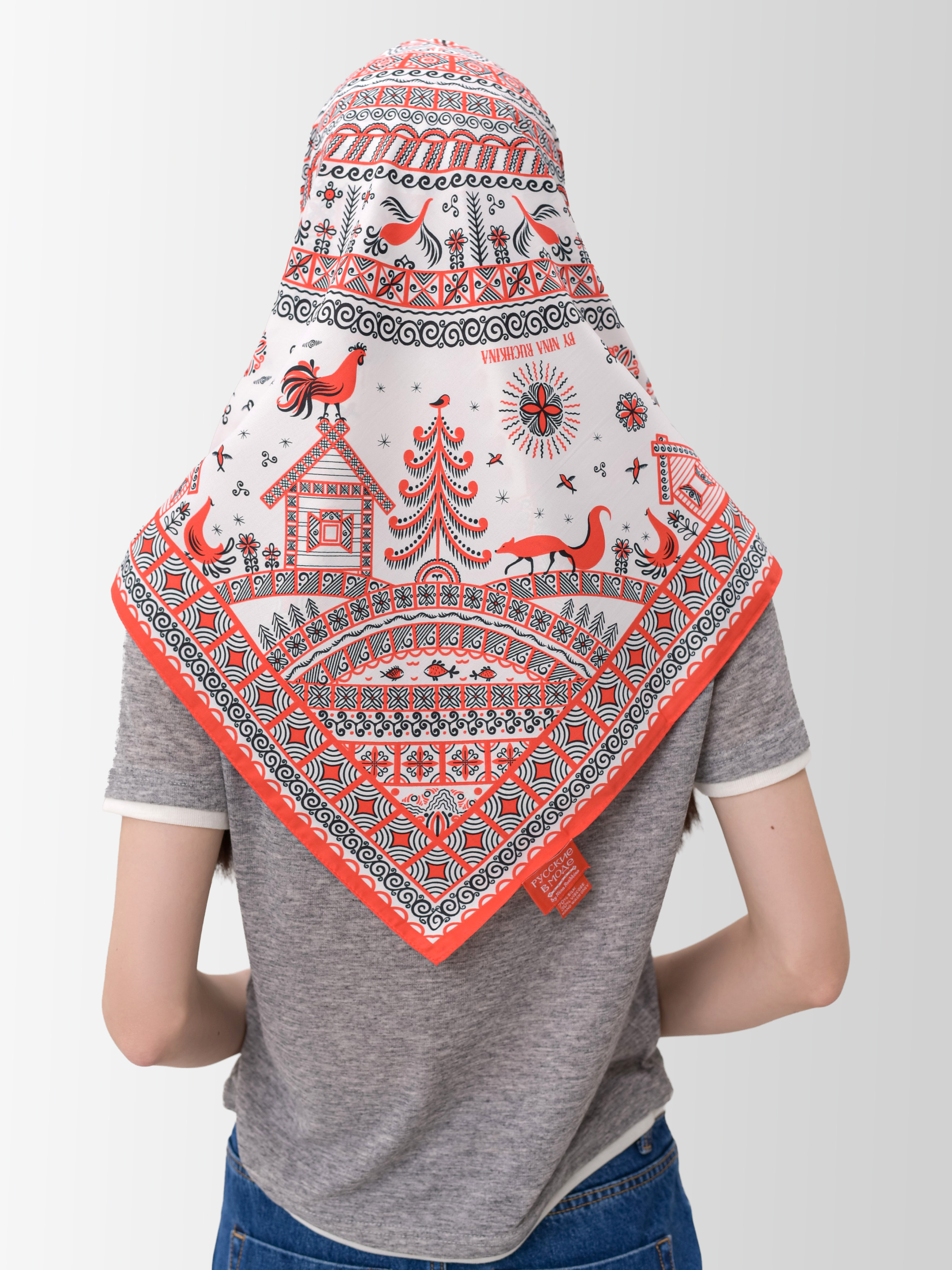Самобытный орнамент знаменитой мезенской росписи, отличающейся зашифрованным символизмом, лег в основу элегантного платка «Мезенская роспись. Петух и лиса».