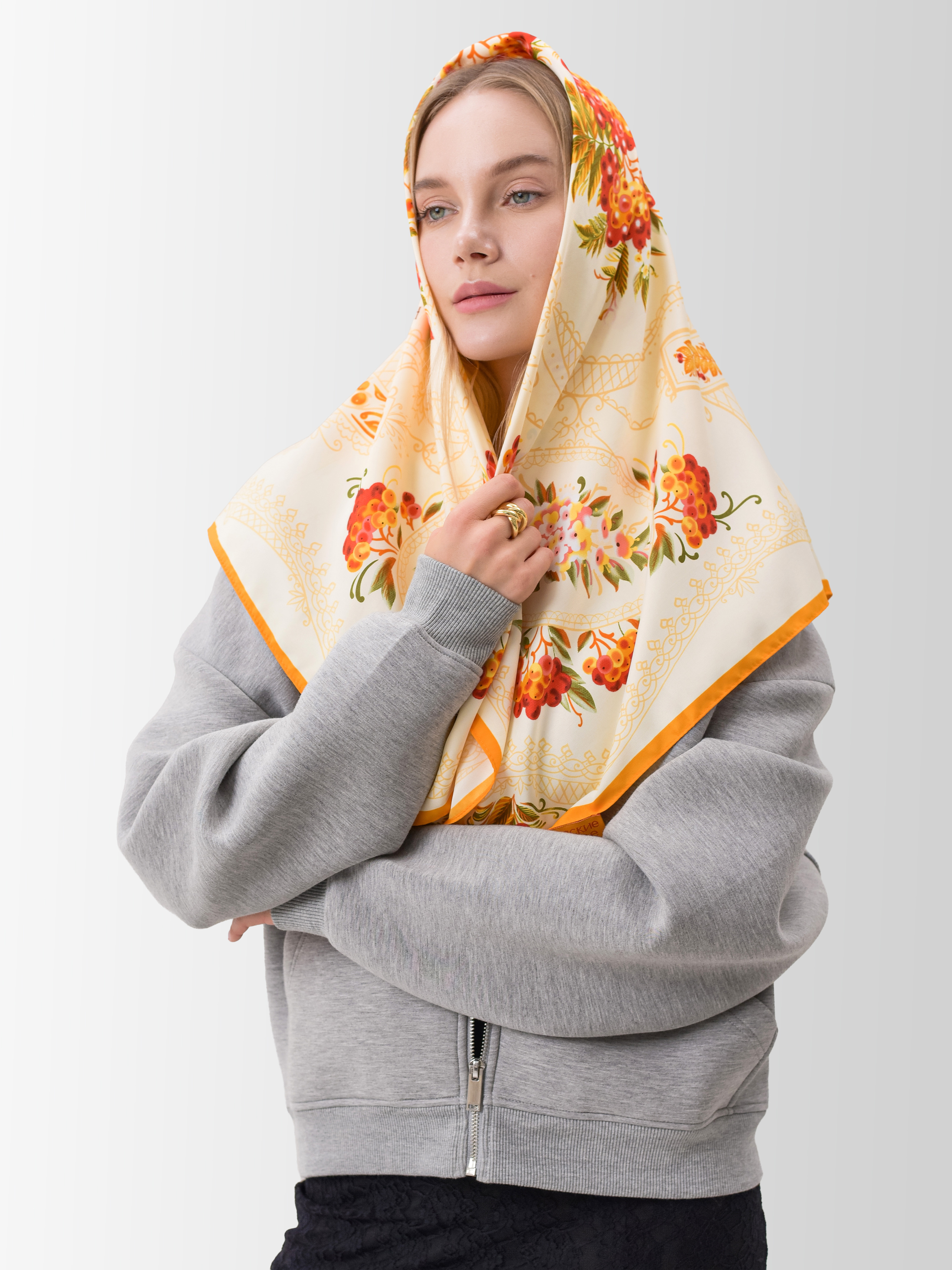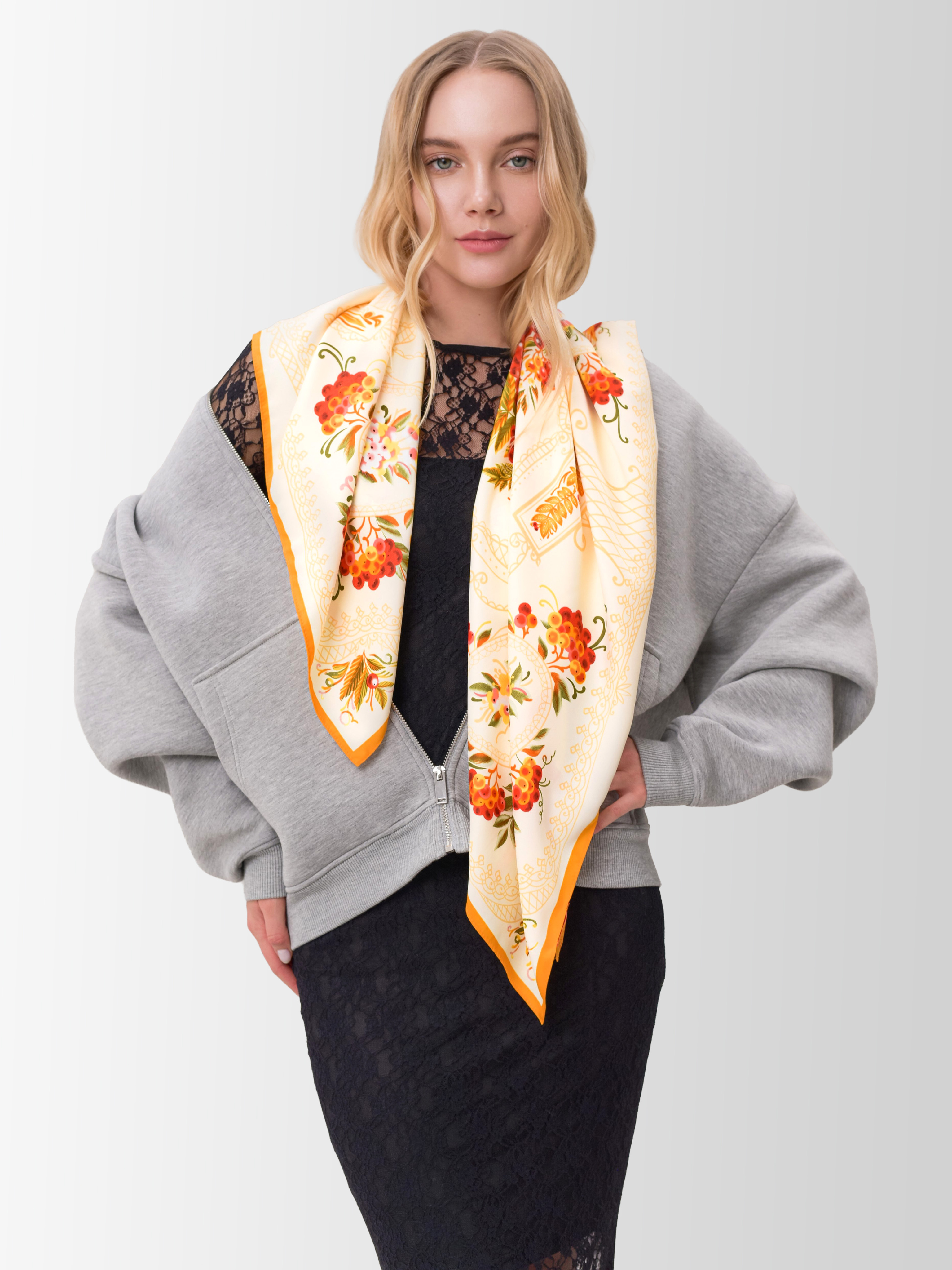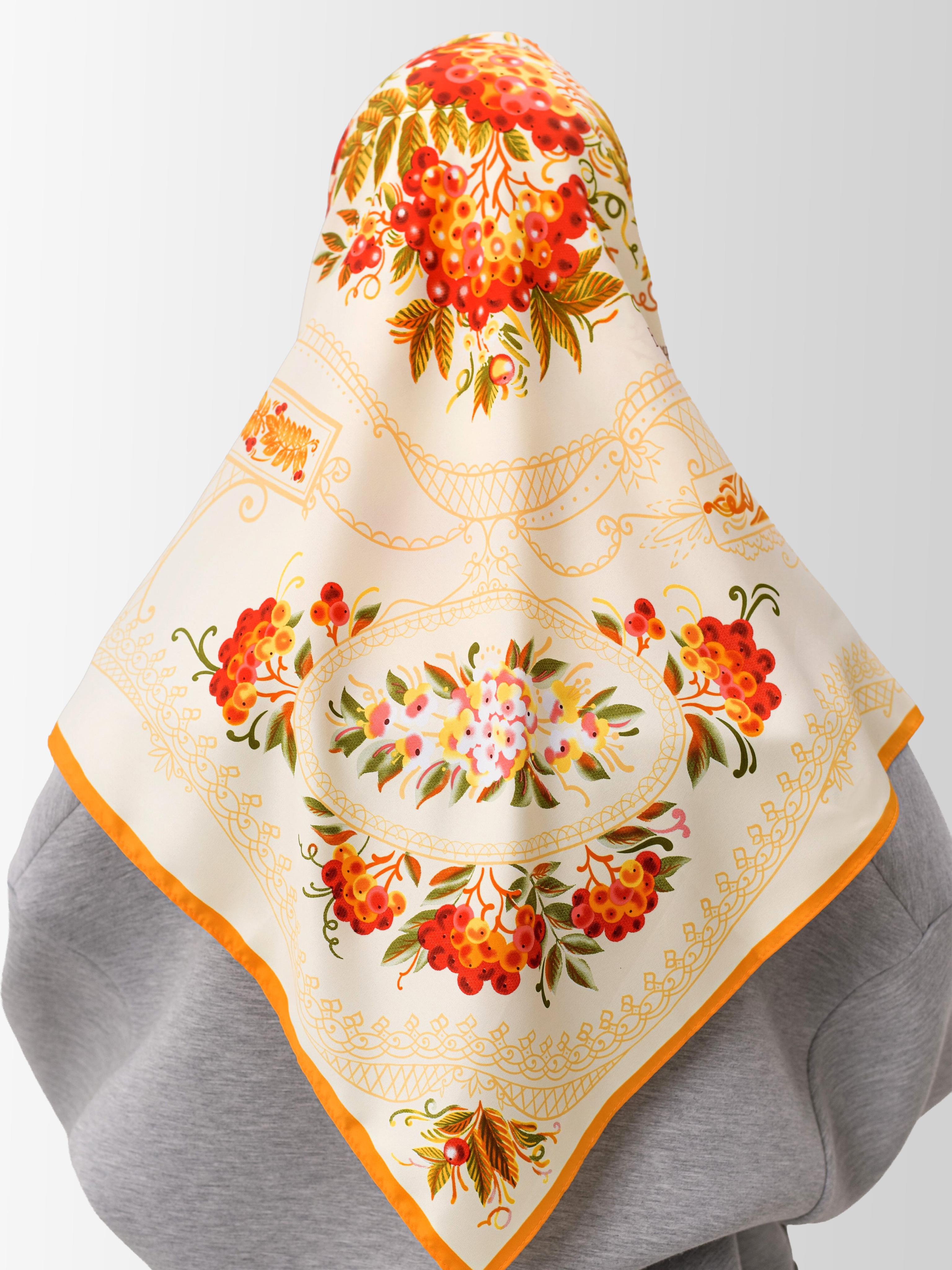Платок «Тагильский поднос» станет ярким акцентом в вашем гардеробе. Насыщенная цветовая гамма плодов всегда актуальна, а нежные оттенки цветов рябины внесут настроение романтичности и легкости.