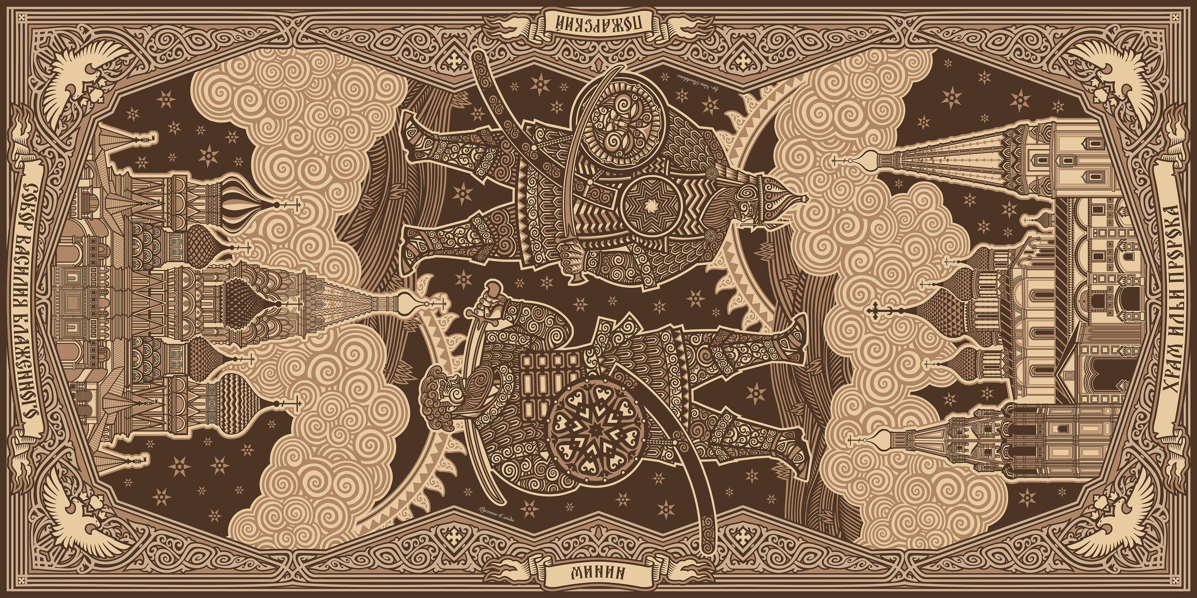 Дизайн палантина воспроизводит все эти знаковые реалии. Его одновременно строгая и декоративная композиция выполнена в стилизованном старорусском стиле. В образах богатырей предстают фигуры Минина и Пожарского, являя собой мудрость и решительность. Изображения Собора Василия Блаженного и Храма Ильи Пророка символизируют божественное благословение освободительного подвига.