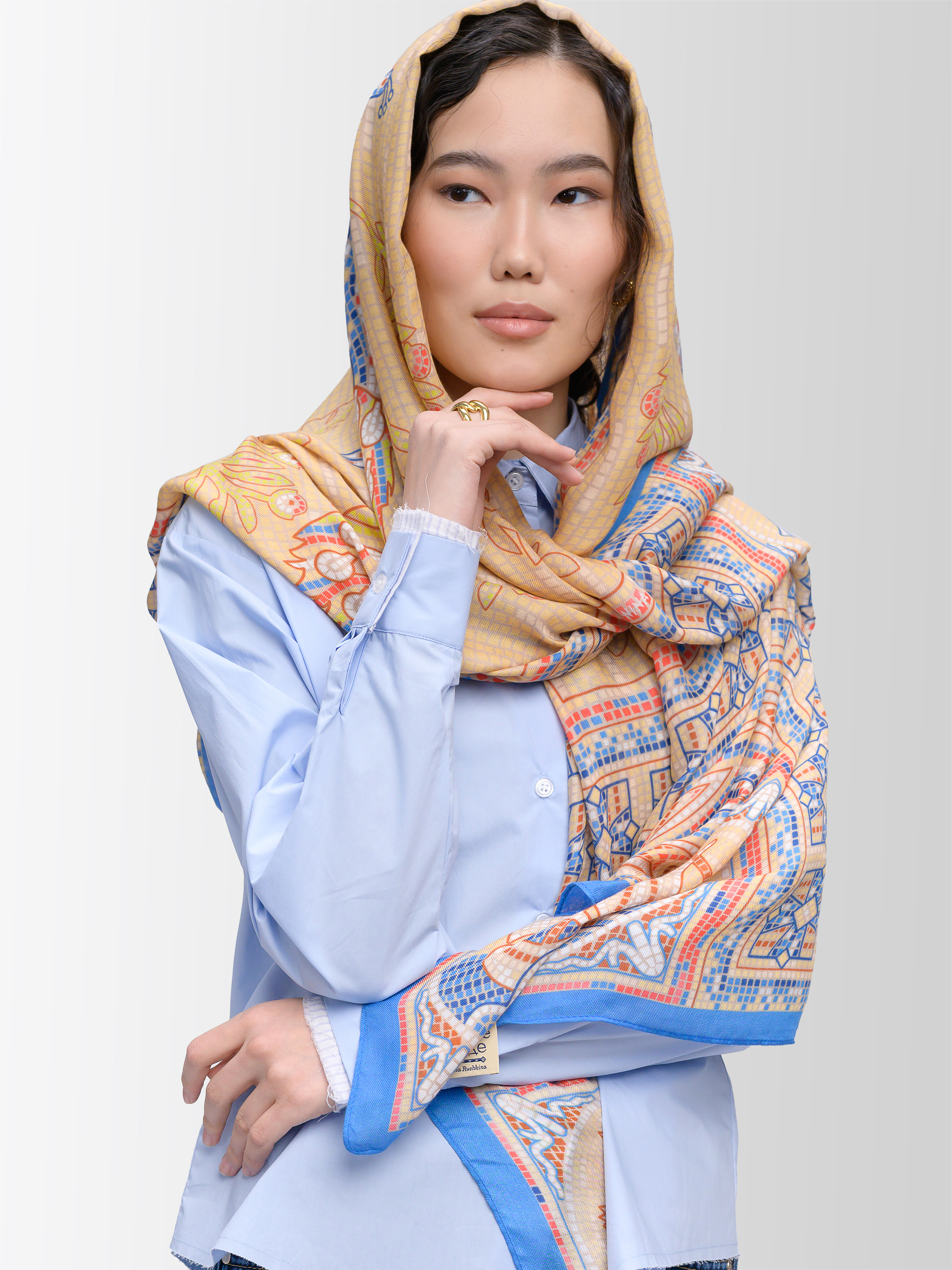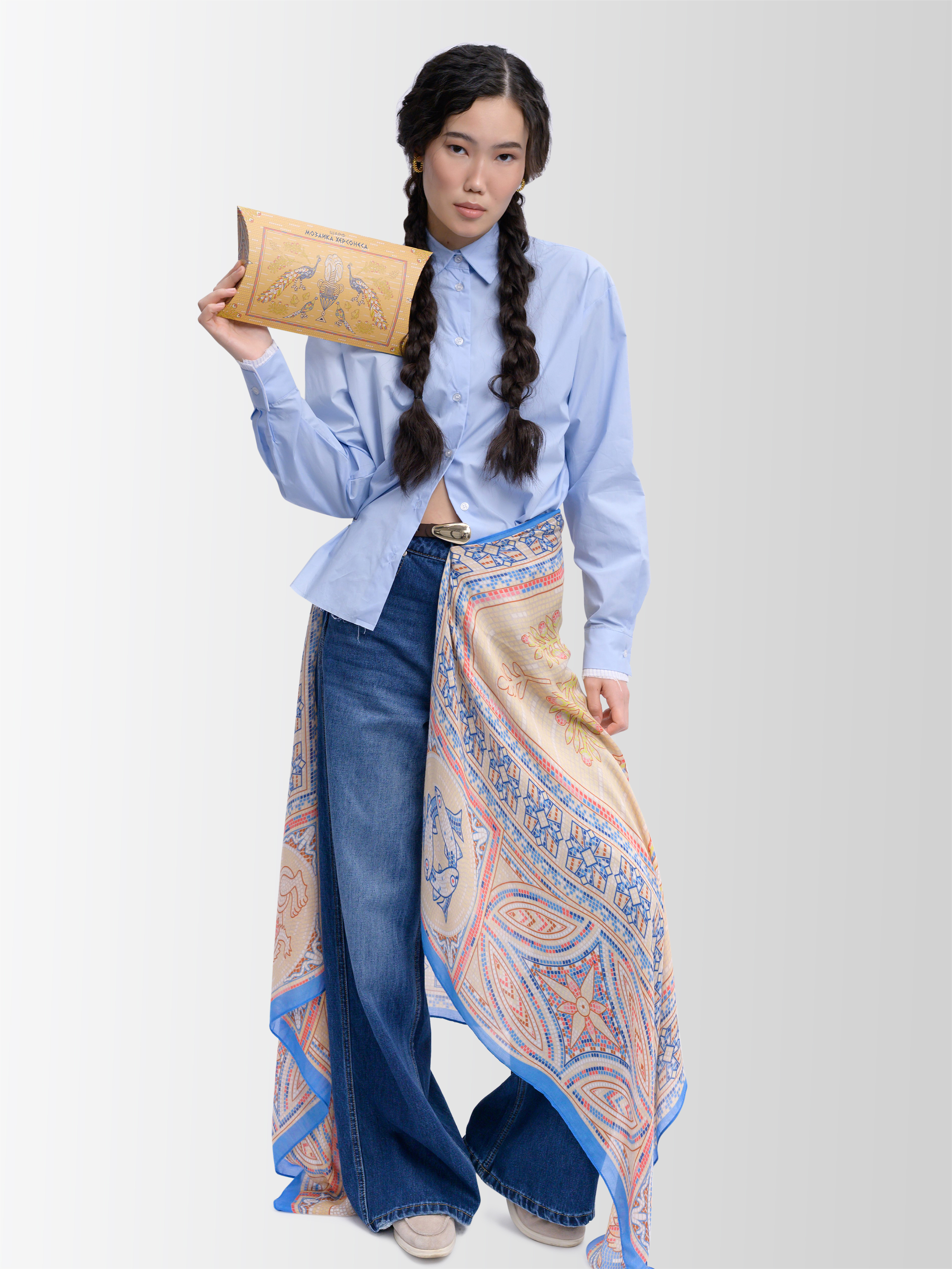 Палантин воплощает мозаичное изображение Свято-Владимирского монастыря, посвященного Святому Крещению Руси. Дизайн полотна создан в соавторстве музейно-храмового комплекса «Новый Херсонес» и бренда «Русские в моде».