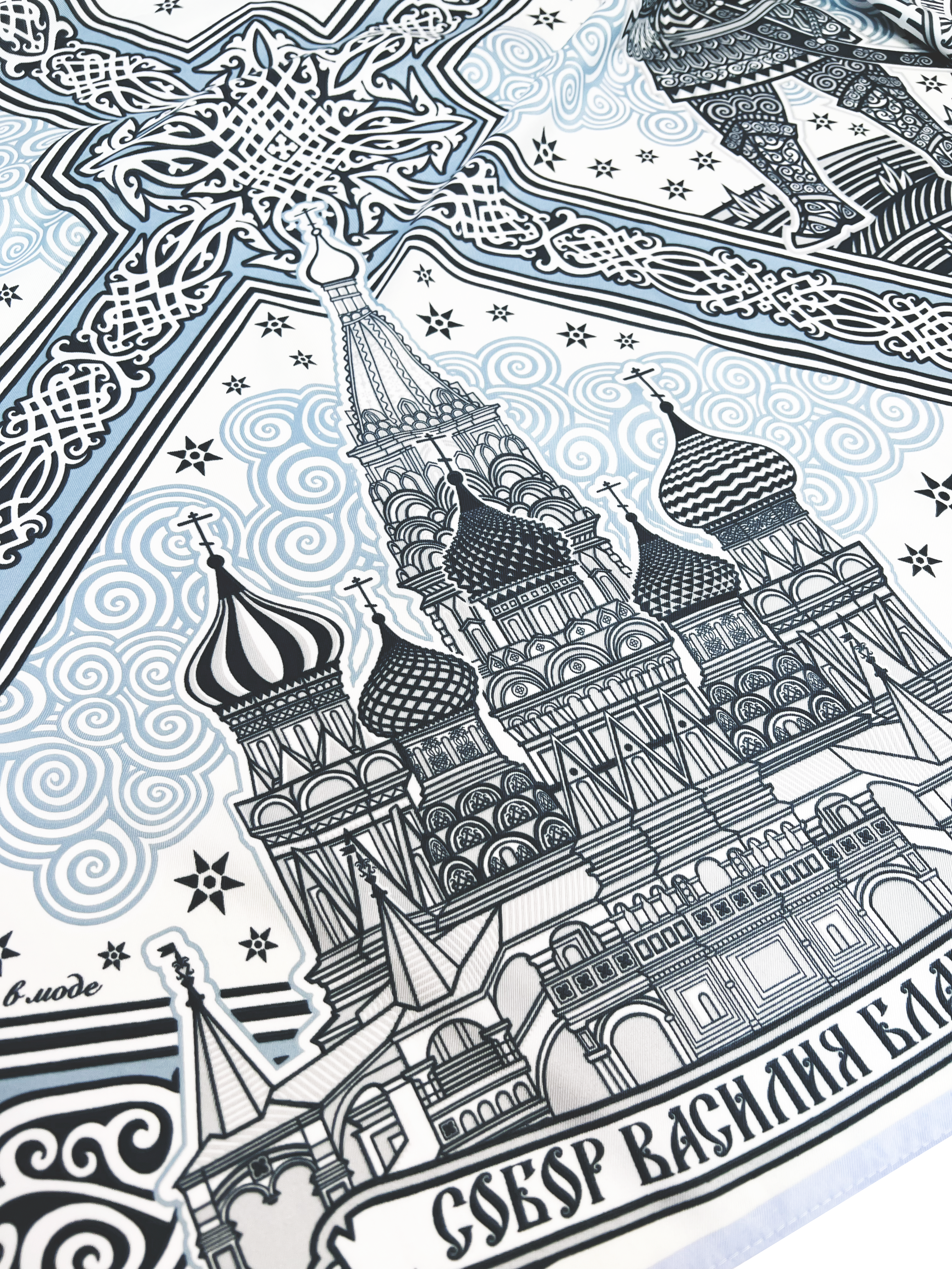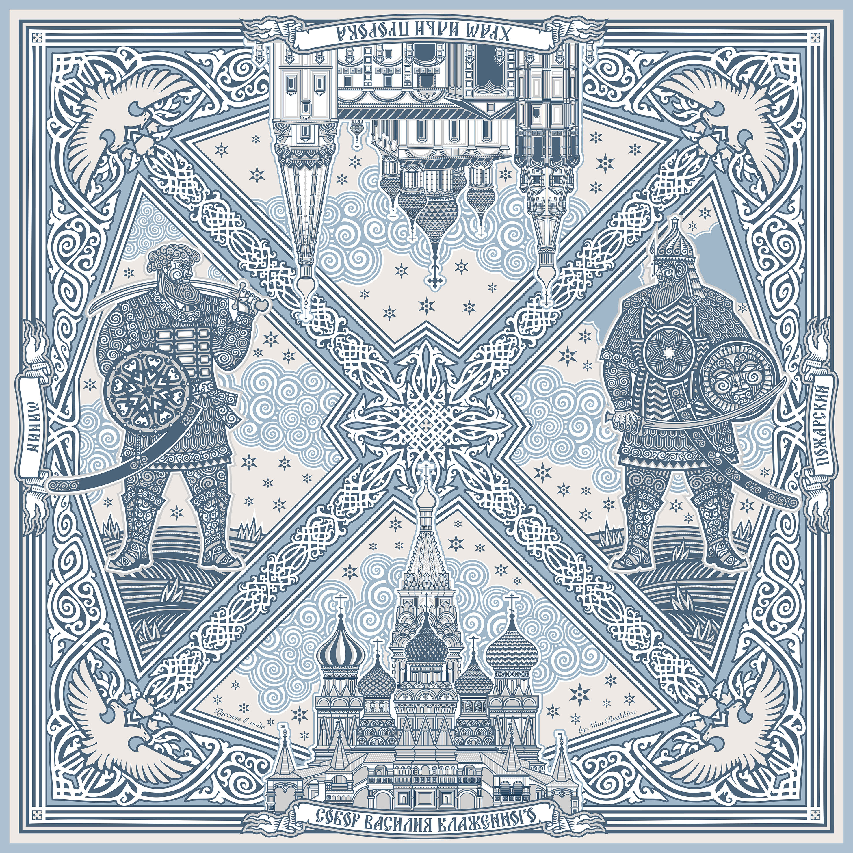 Дизайн платка воспроизводит все эти знаковые реалии. Его одновременно строгая и декоративная композиция выполнена в стилизованном старорусском стиле. В образах богатырей предстают фигуры Минина и Пожарского, являя собой мудрость и решительность. Изображения Собора Василия Блаженного и Храма Ильи Пророка символизируют божественное благословение освободительного подвига.