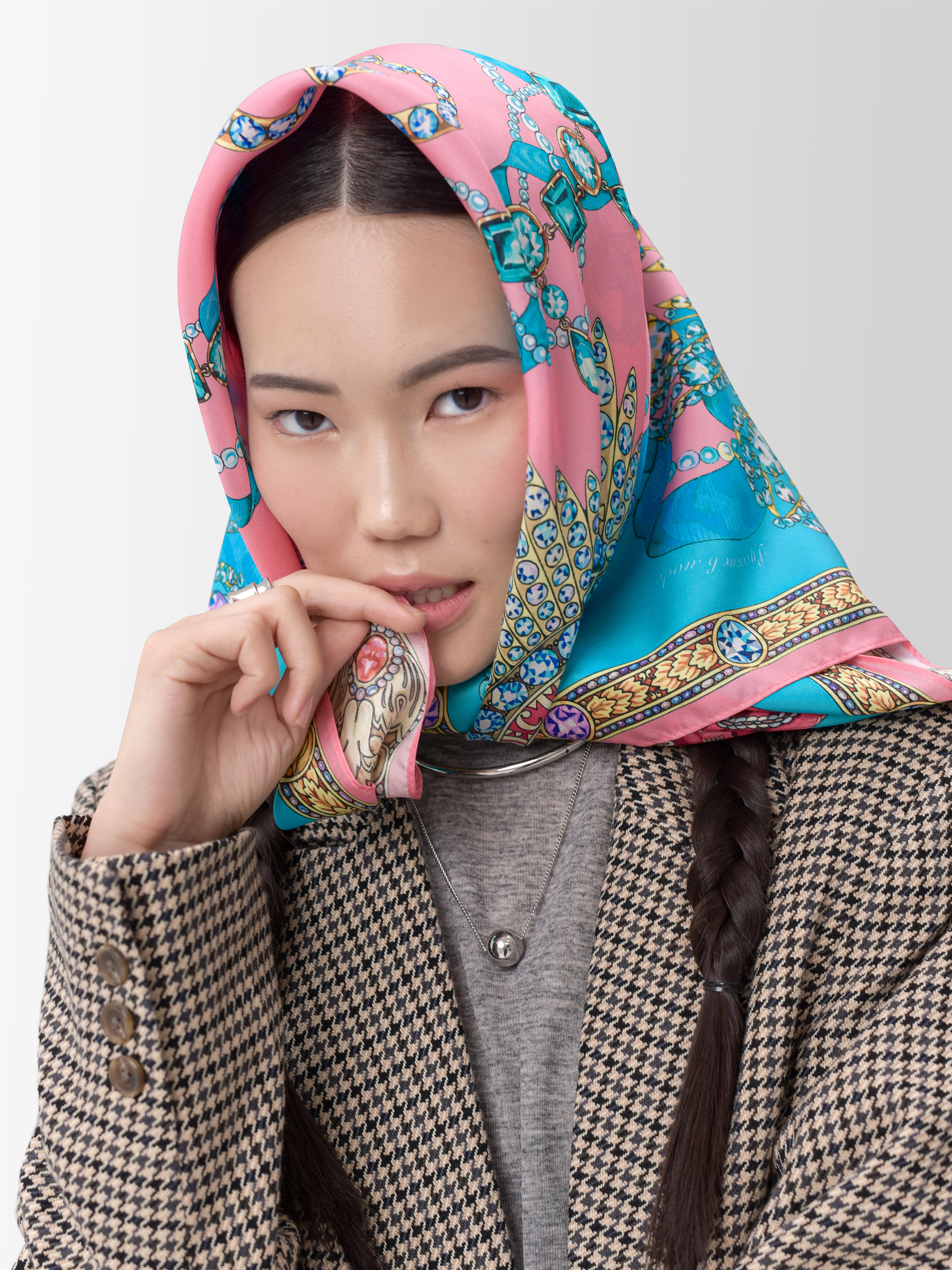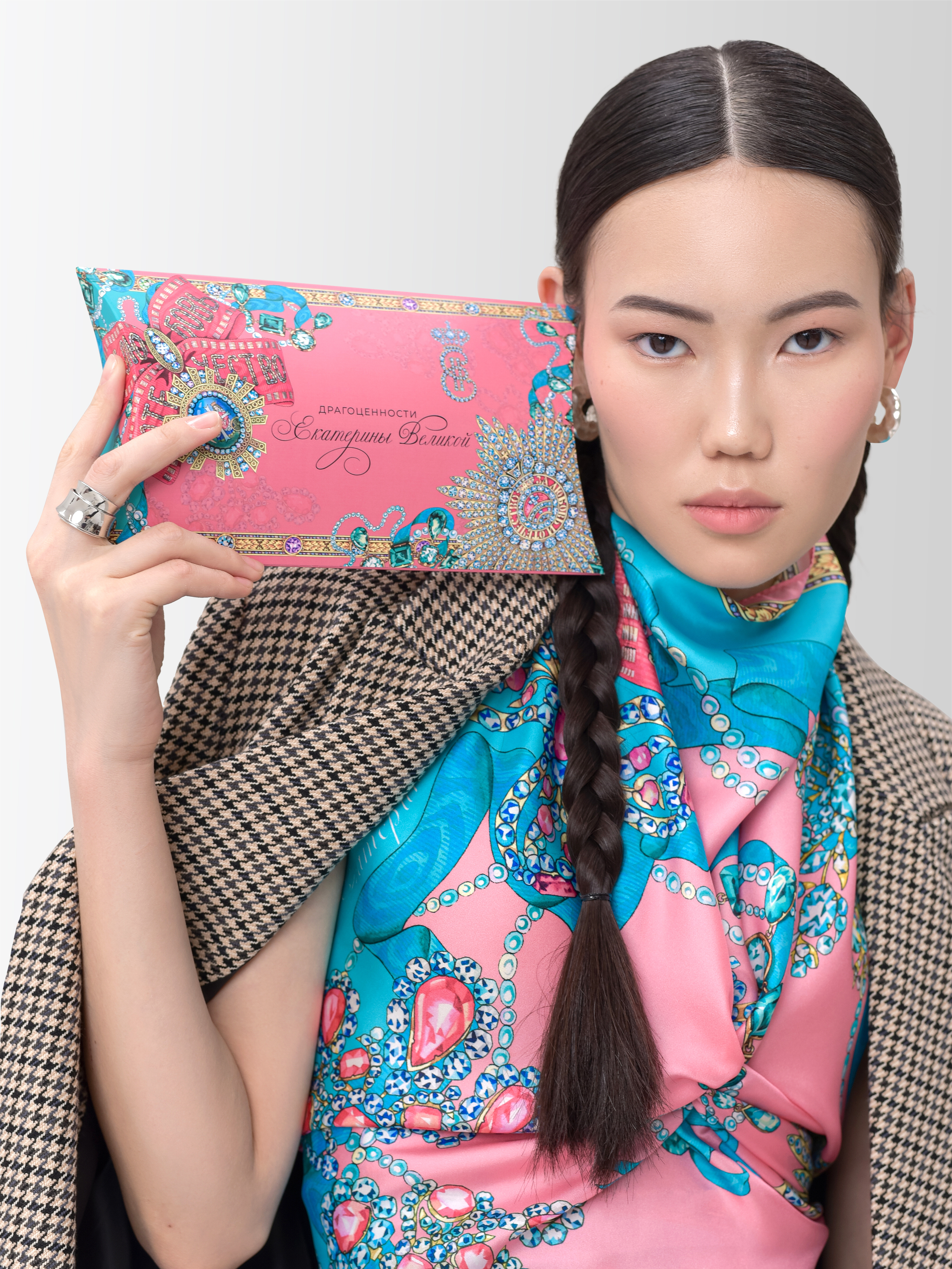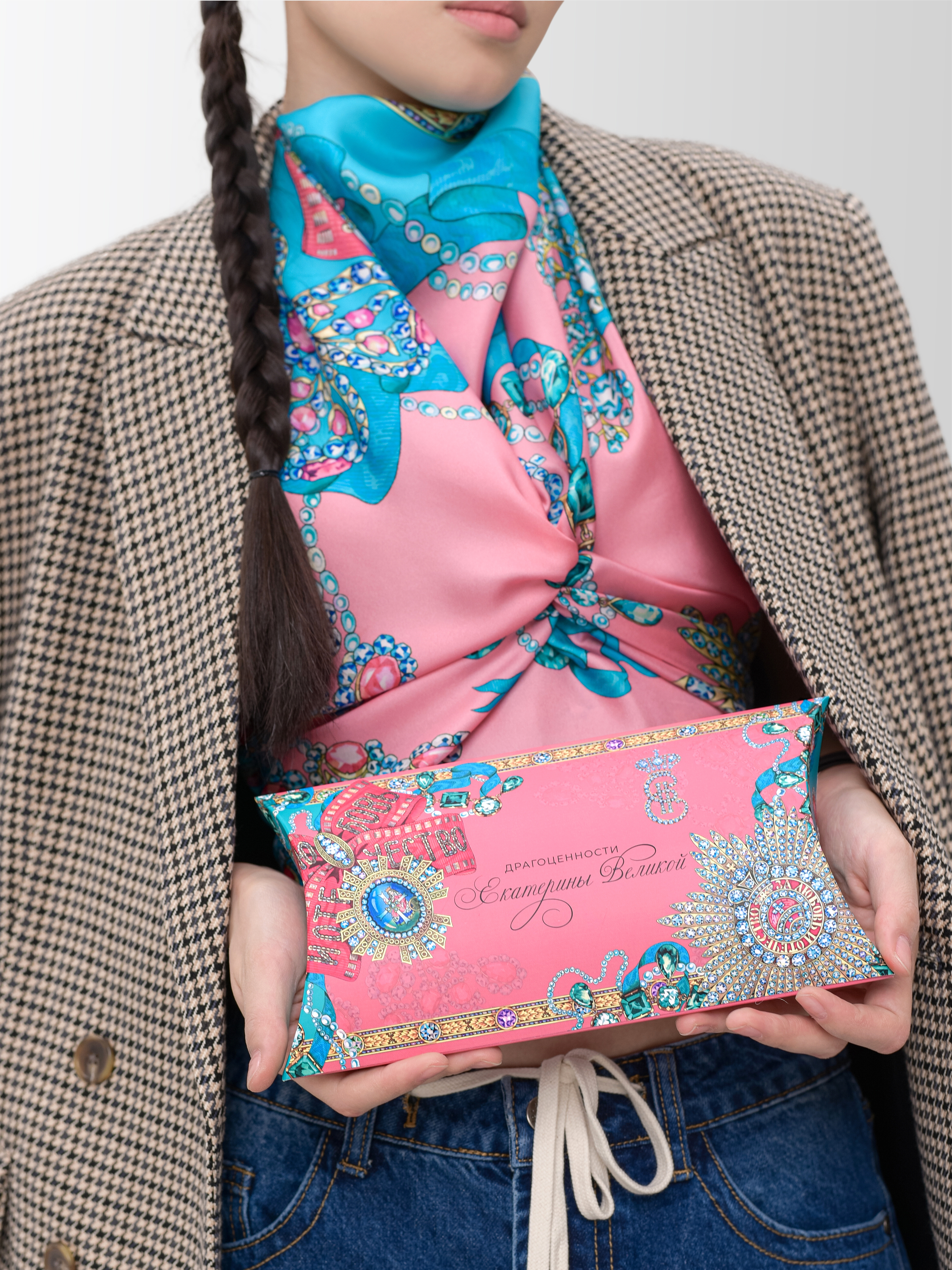 Платок «Драгоценности Екатерины Великой» от бренда «Русские в моде» - это художественный этюд об увлечении императрицы шедеврами ювелирного искусства, над изготовлением которых трудились самые прославленные мастера.
