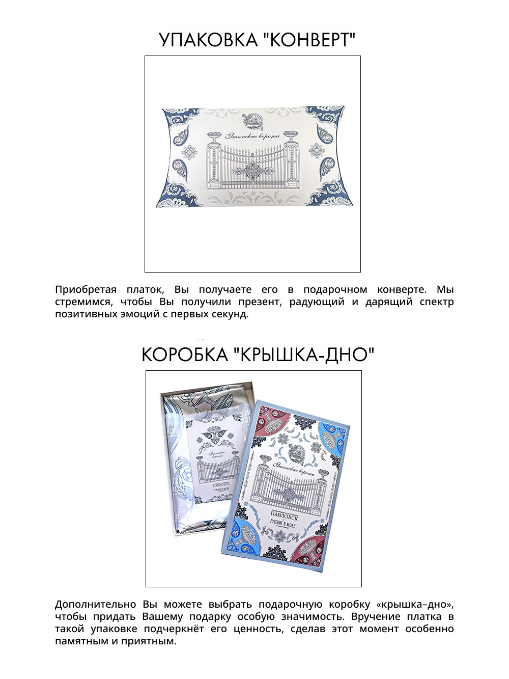 Платок «Этюпские ворота» создан брендом «Русские в моде» совместно с государственным музеем-заповедником «Павловск» и посвящен архитектурному шедевру Павловского дворцово-паркового ансамбля.