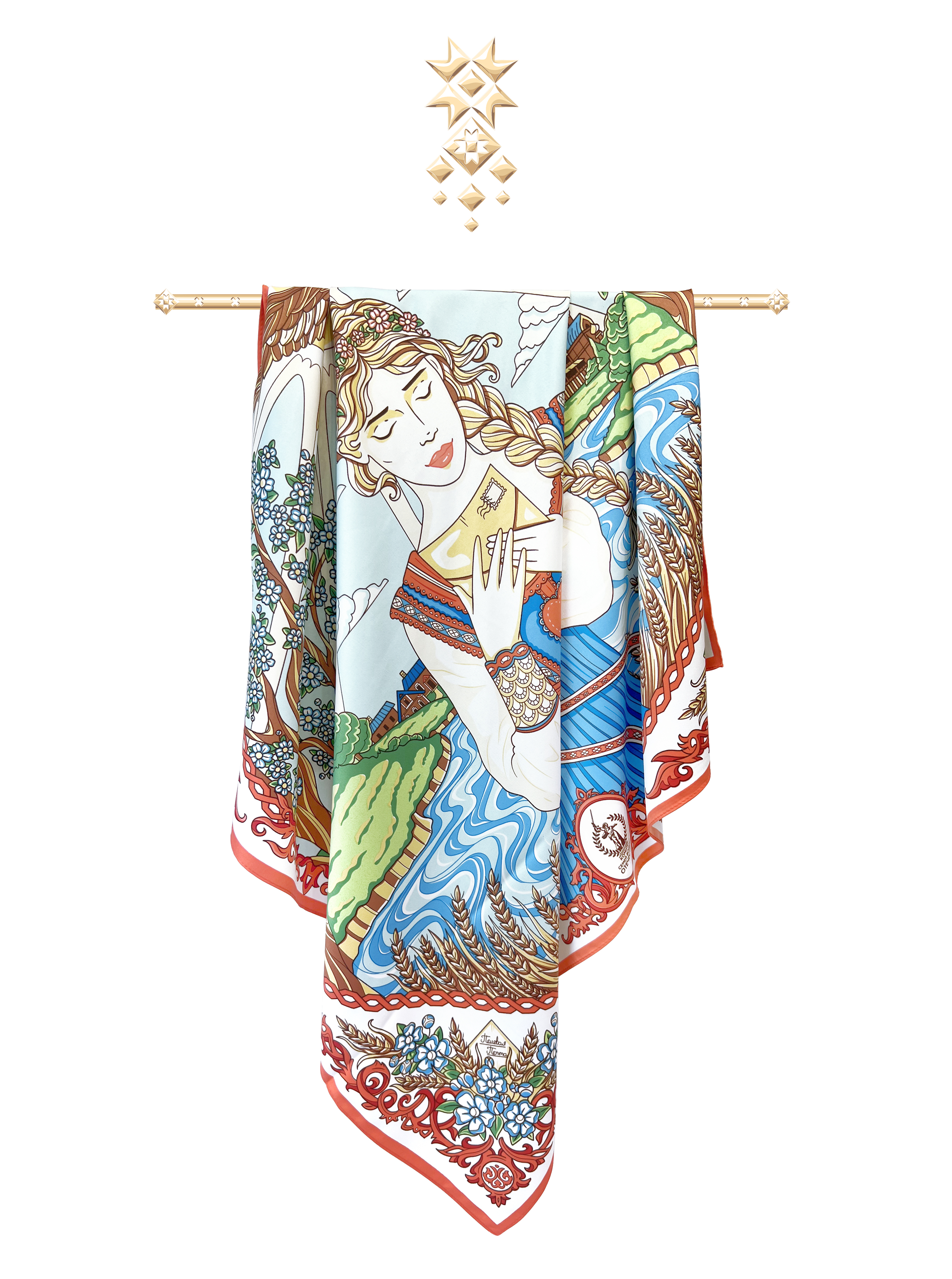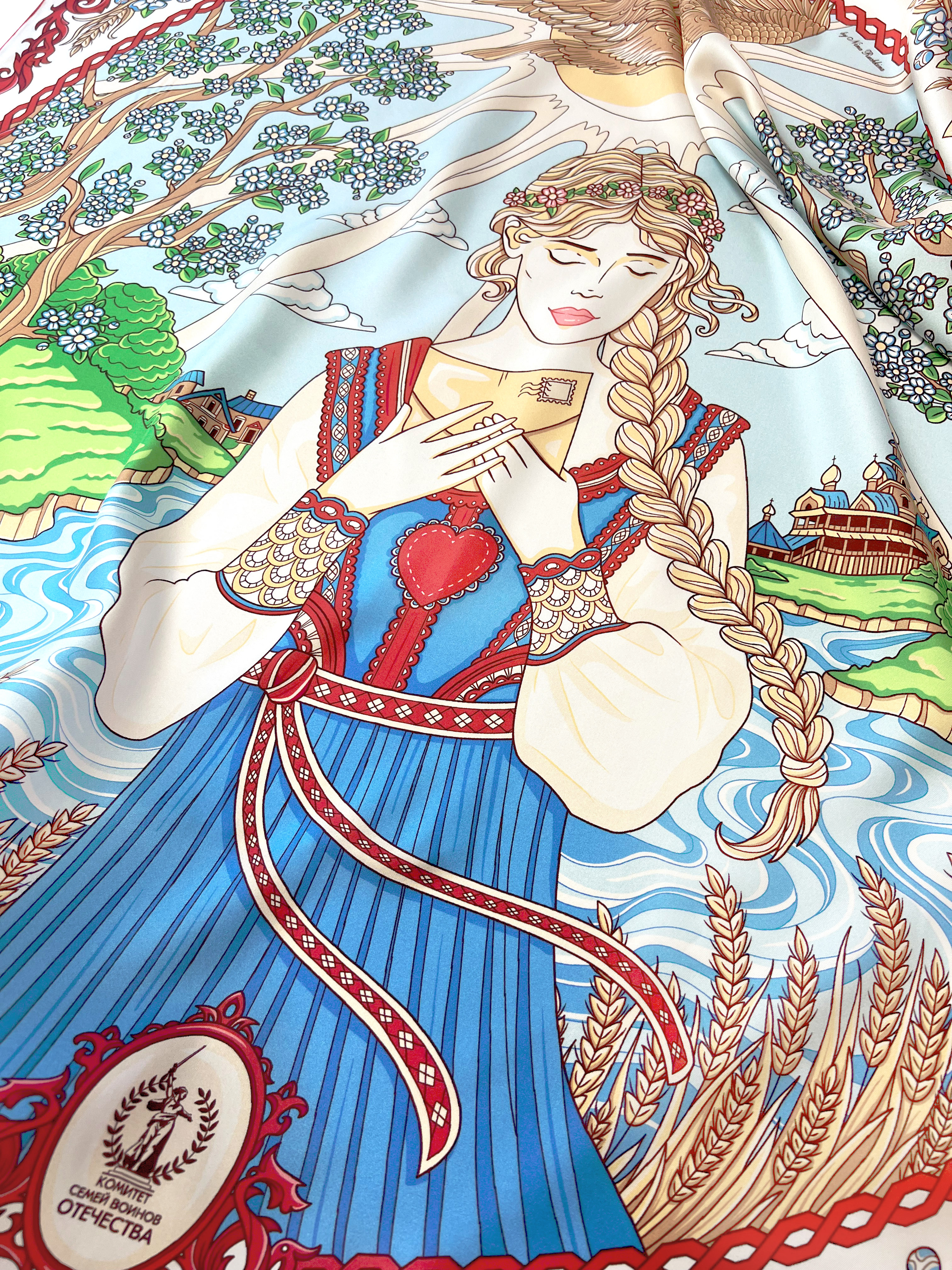 Платок «Катюша» – это знаменитая русская песня, воплощённая в шёлке. Уже много десятилетий образ девушки Катюши является символом великого женского ожидания, надежды, веры и любви. Символом неизбежной победы русского духа.