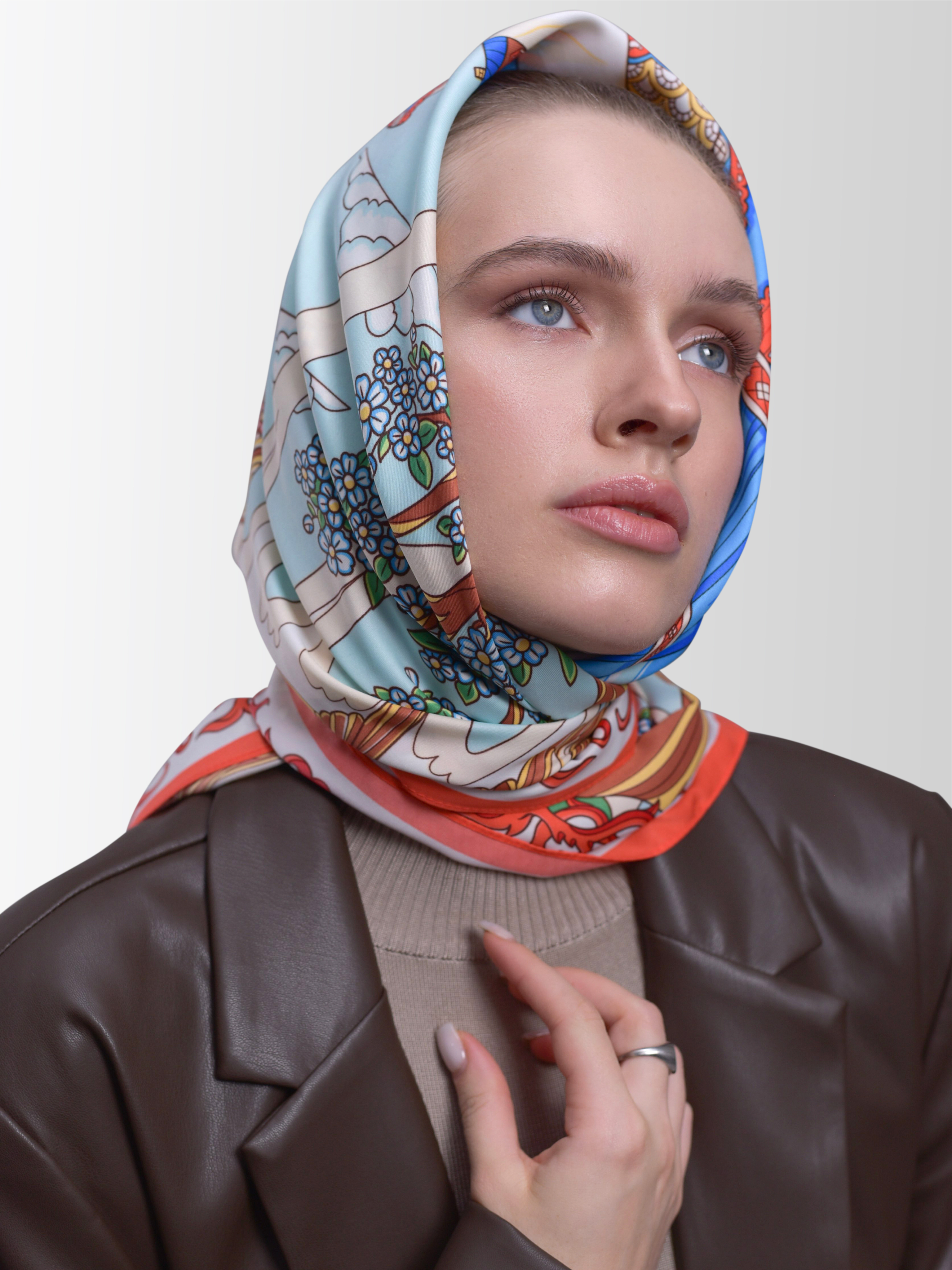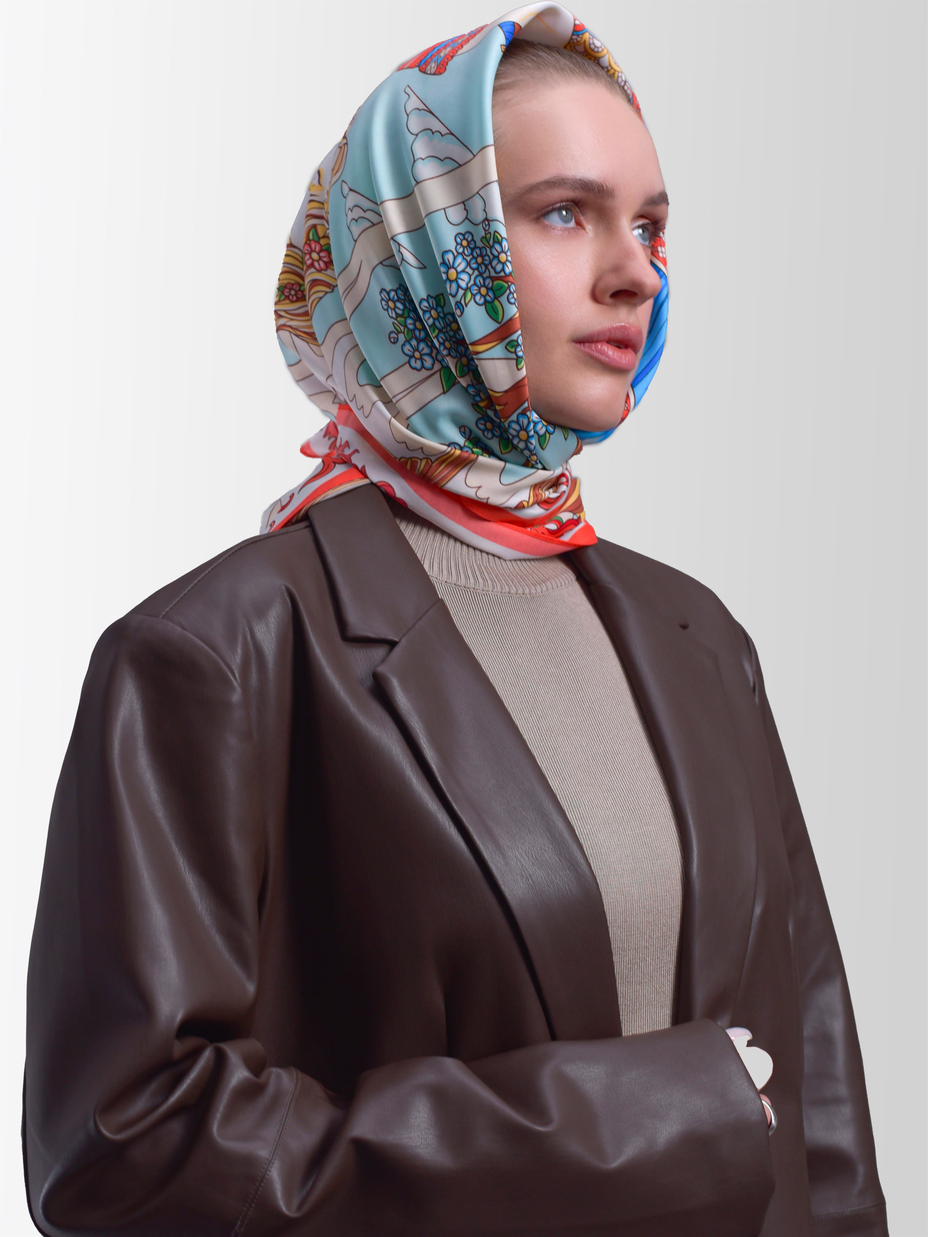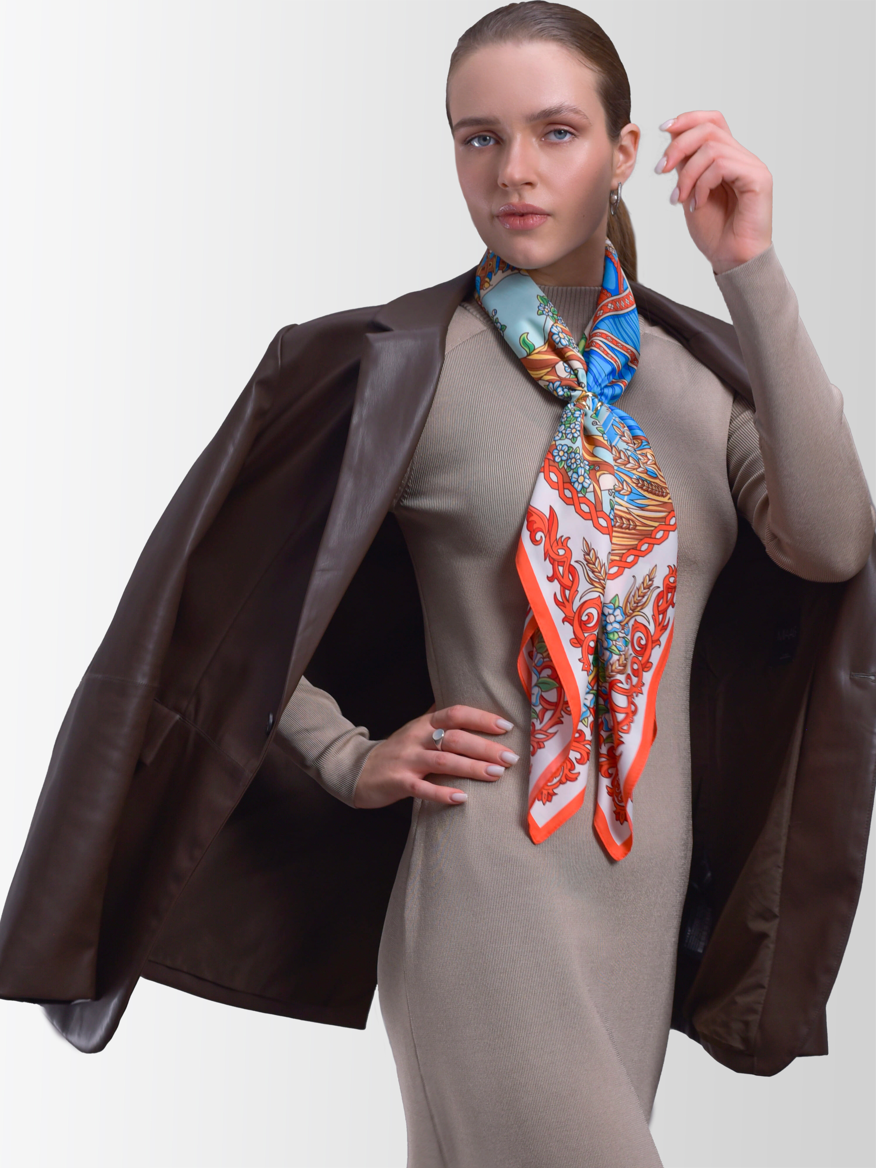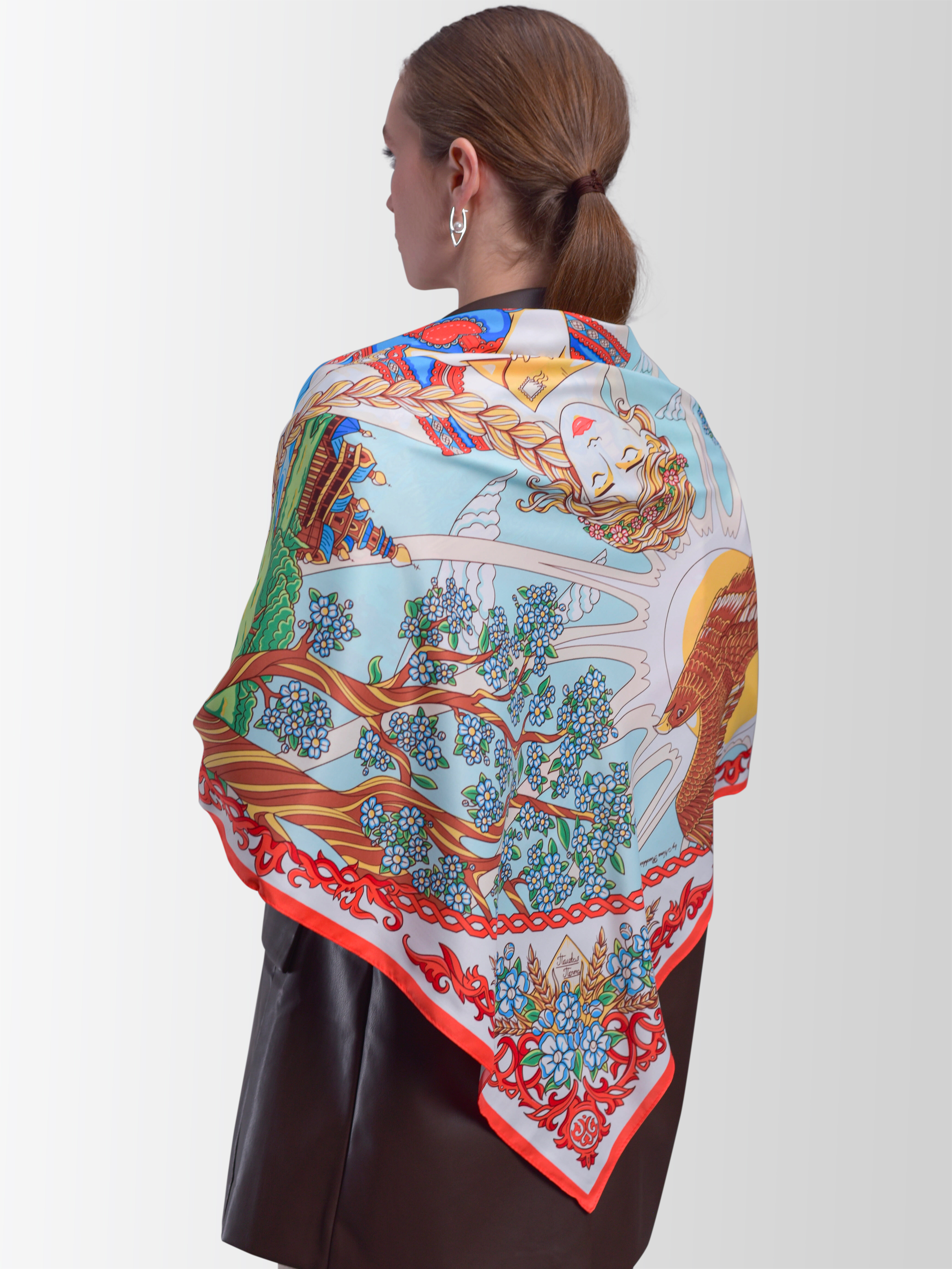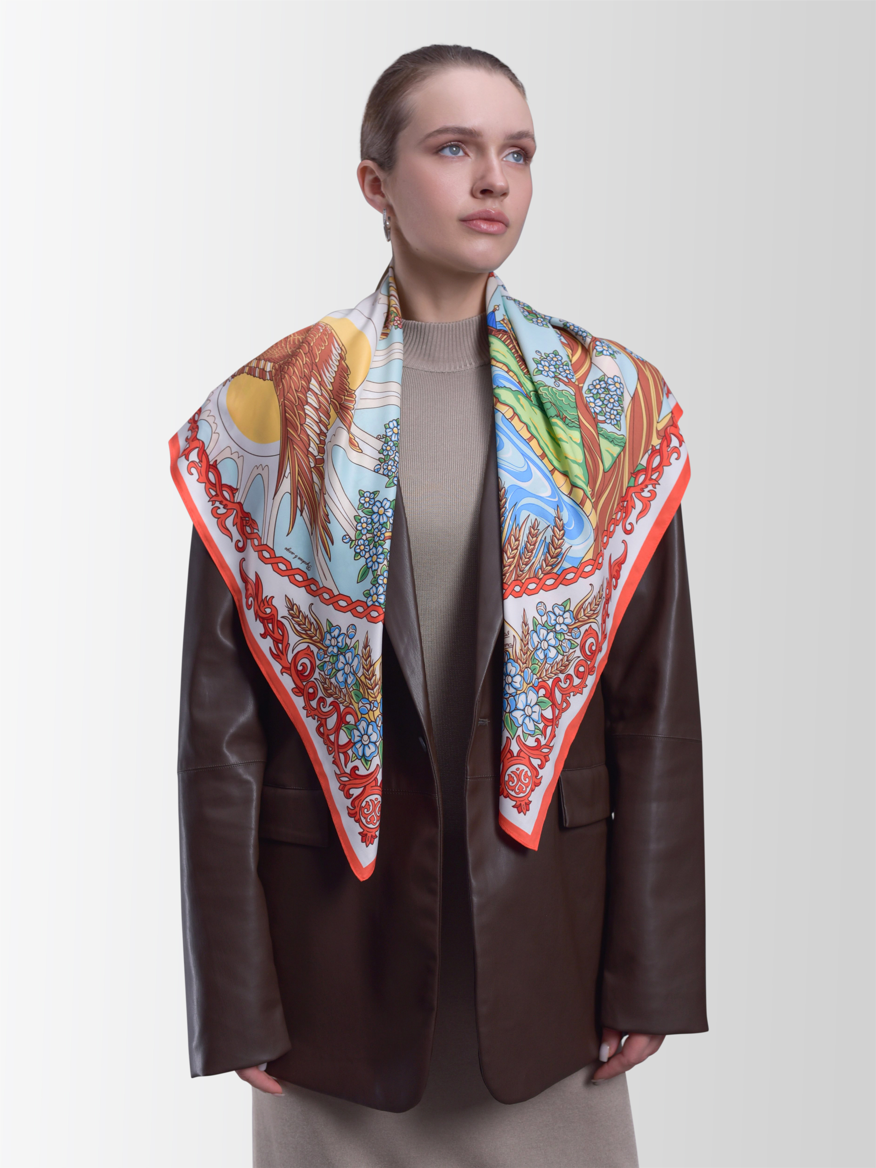 Платок «Катюша» – это знаменитая русская песня, воплощённая в шёлке. Уже много десятилетий образ девушки Катюши является символом великого женского ожидания, надежды, веры и любви. Символом неизбежной победы русского духа.