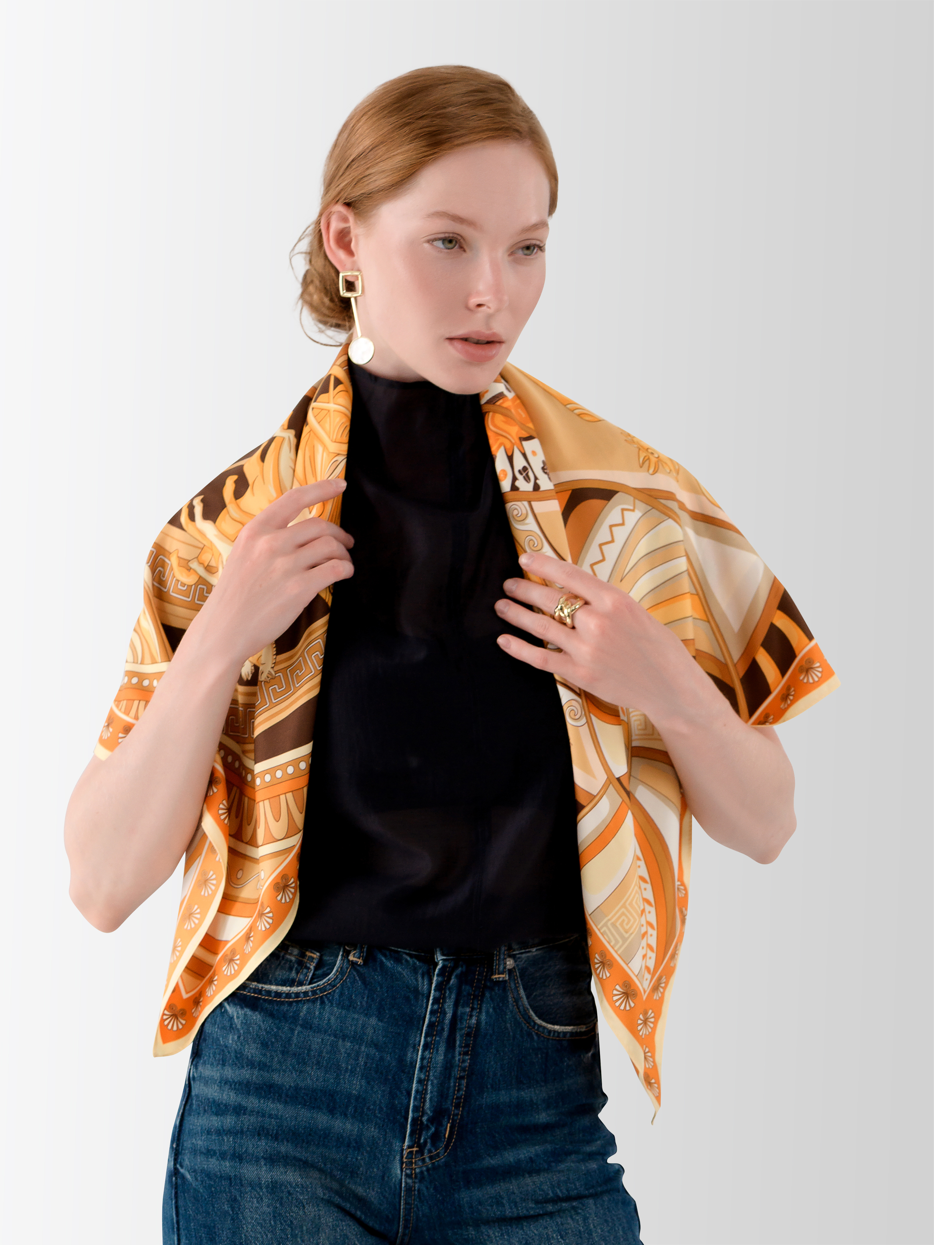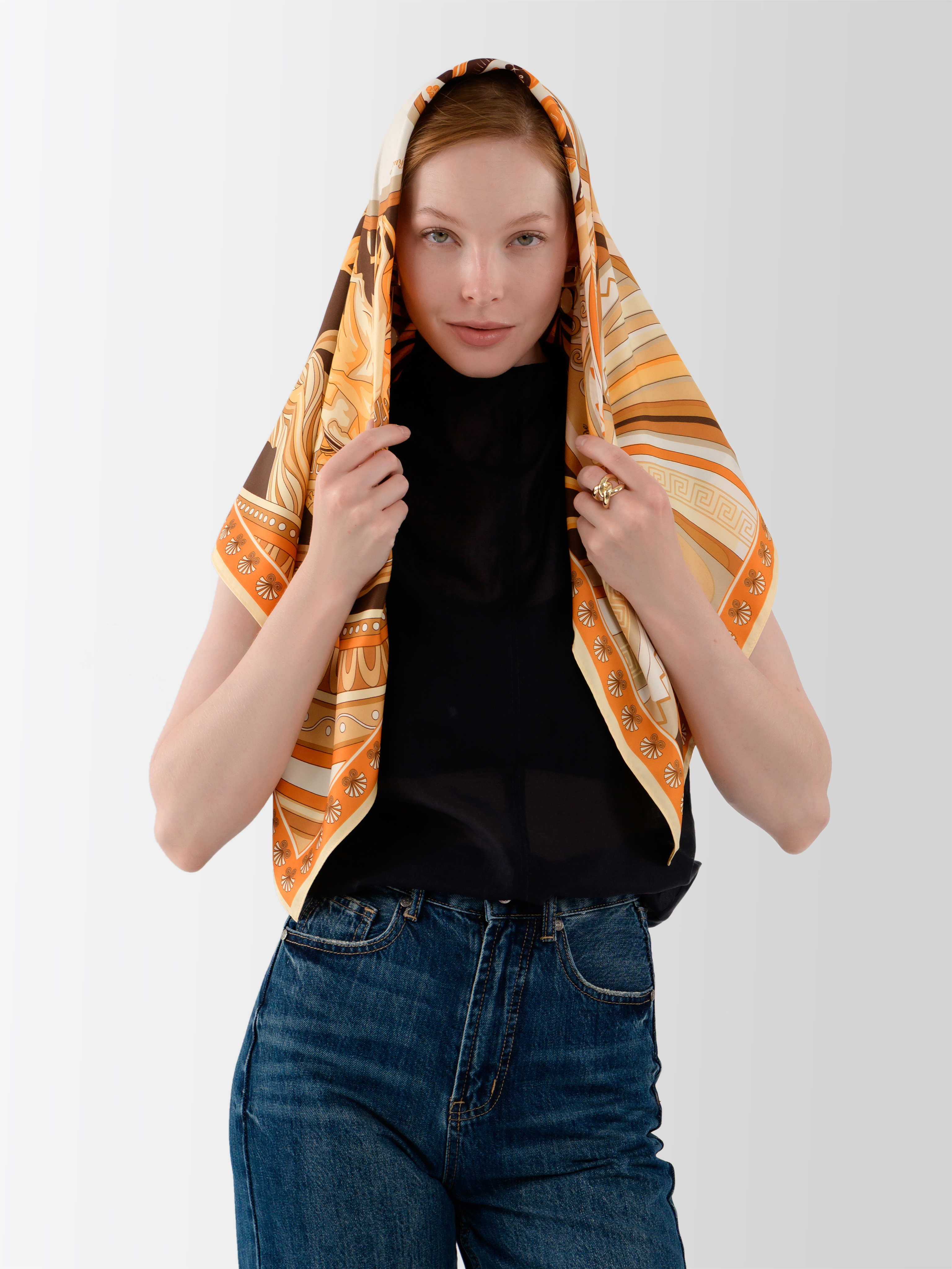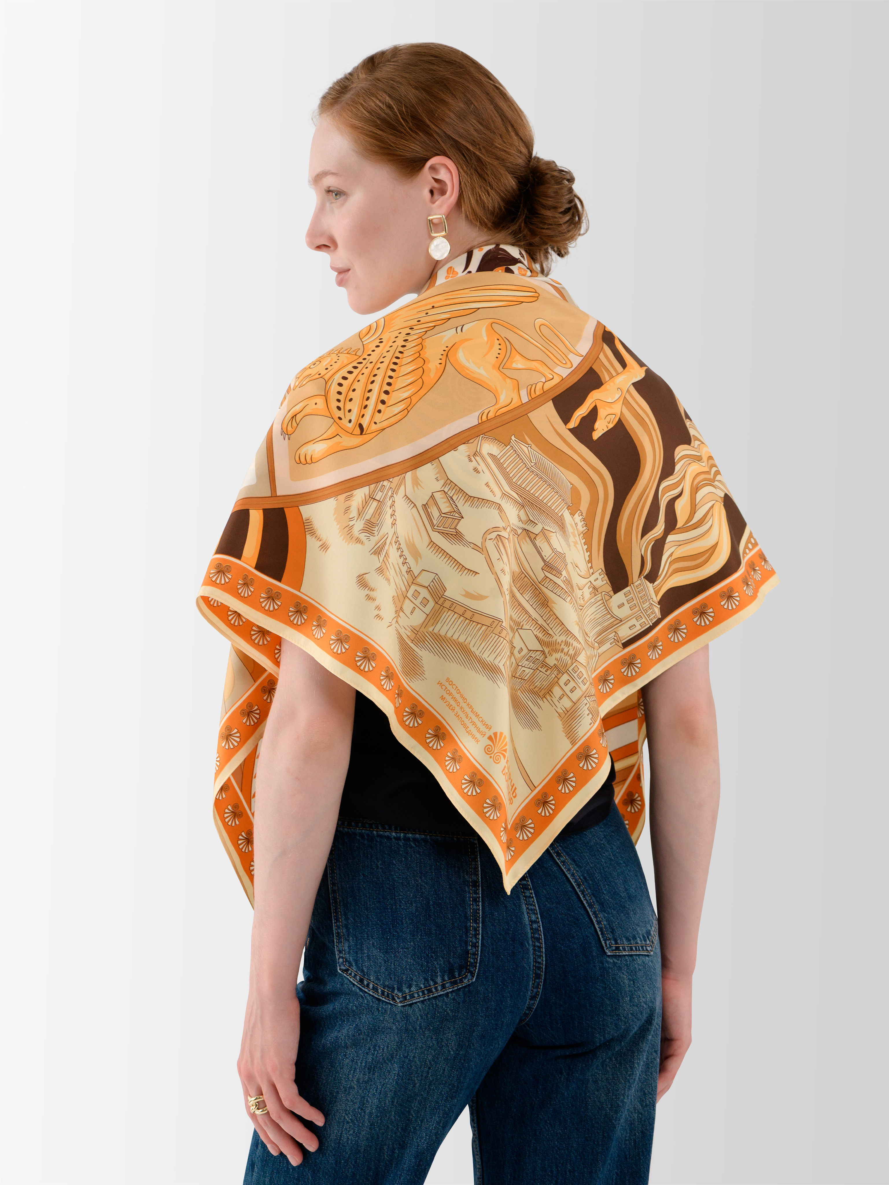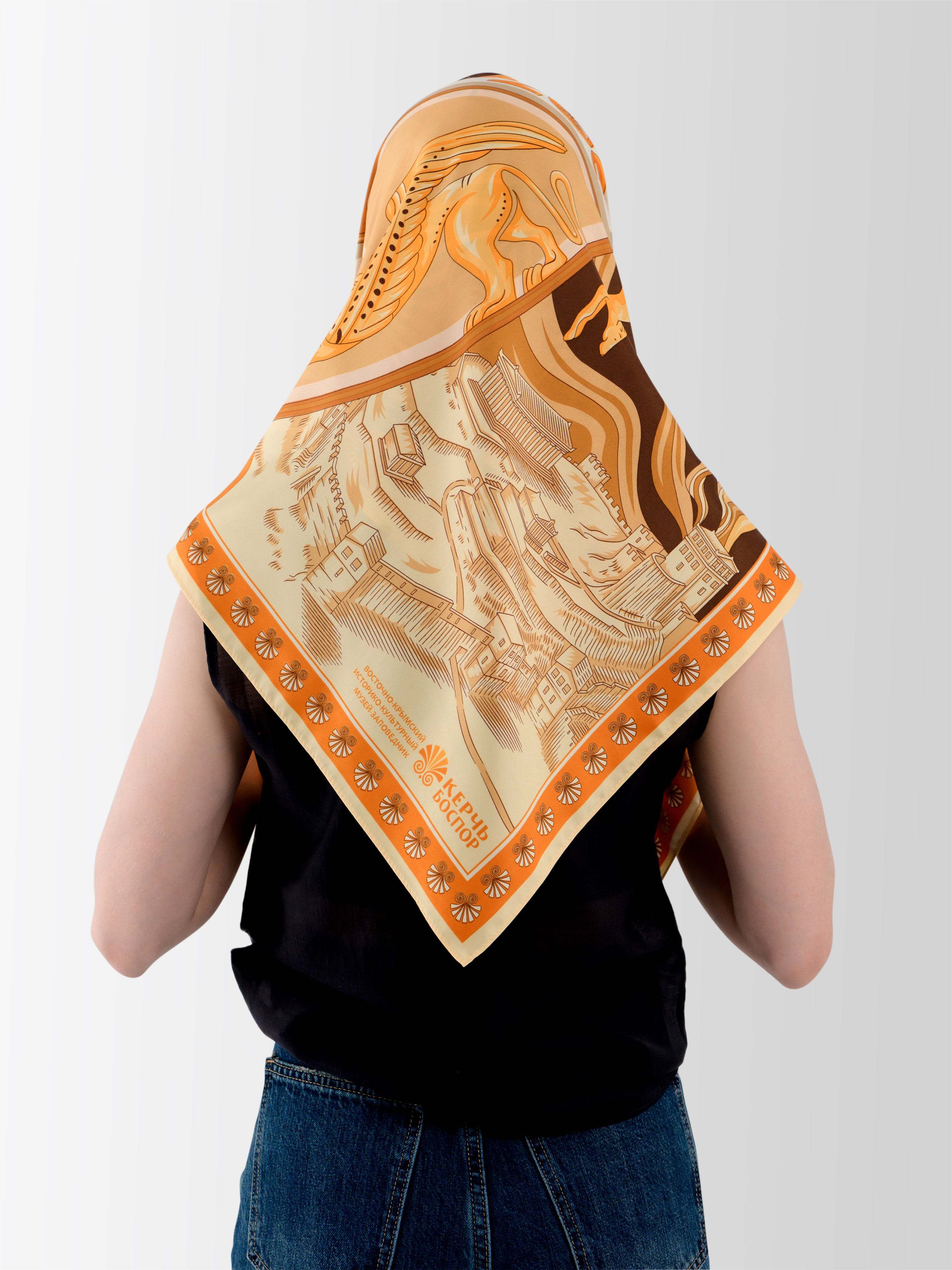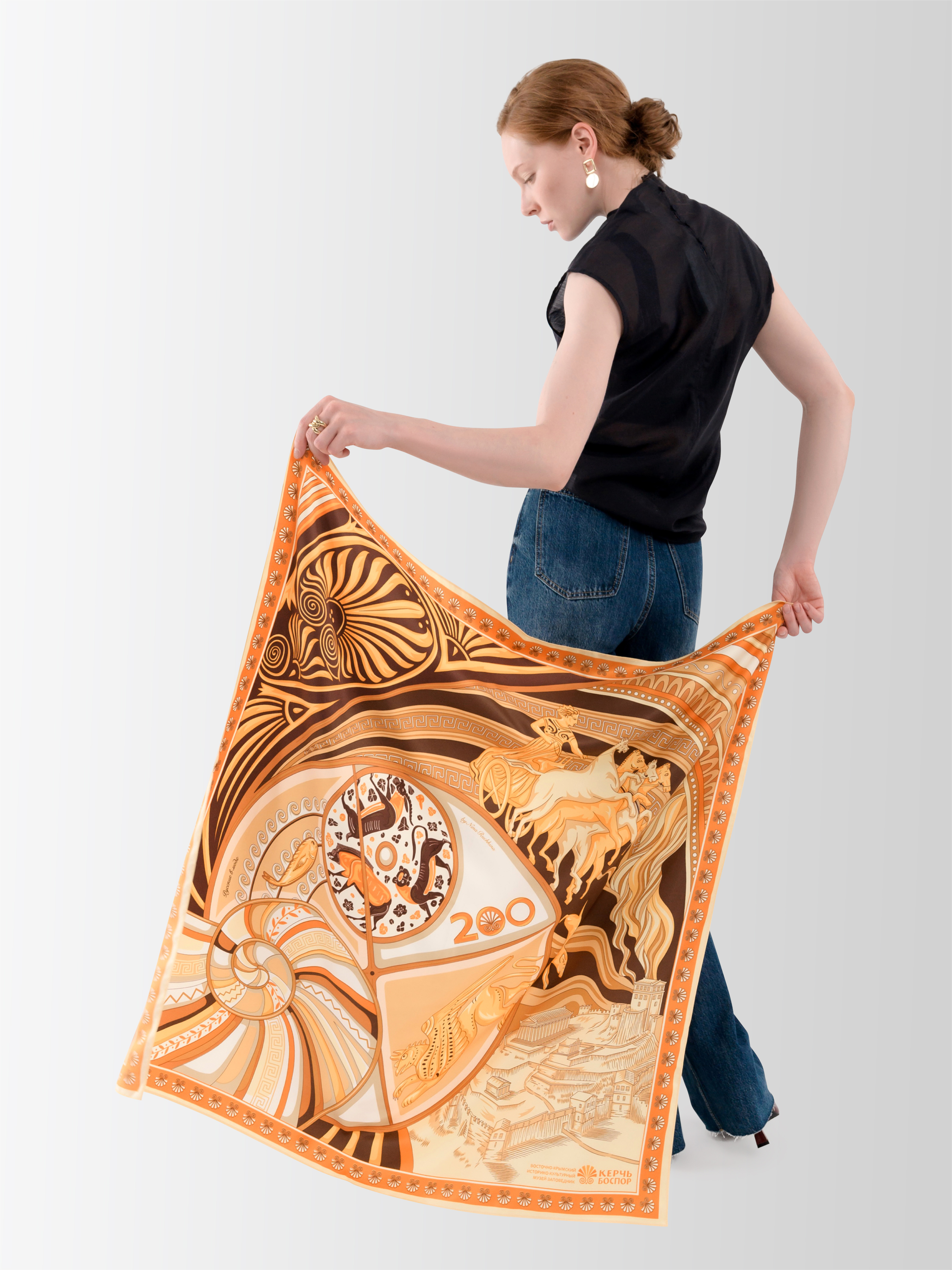 Эксклюзивный дизайн платка «Колесо времени» создан совместно с брендом «Русские в моде» и приурочен к 200-летию Керченского музея древностей (Восточно-Крымский историко-культурный музей-заповедник).