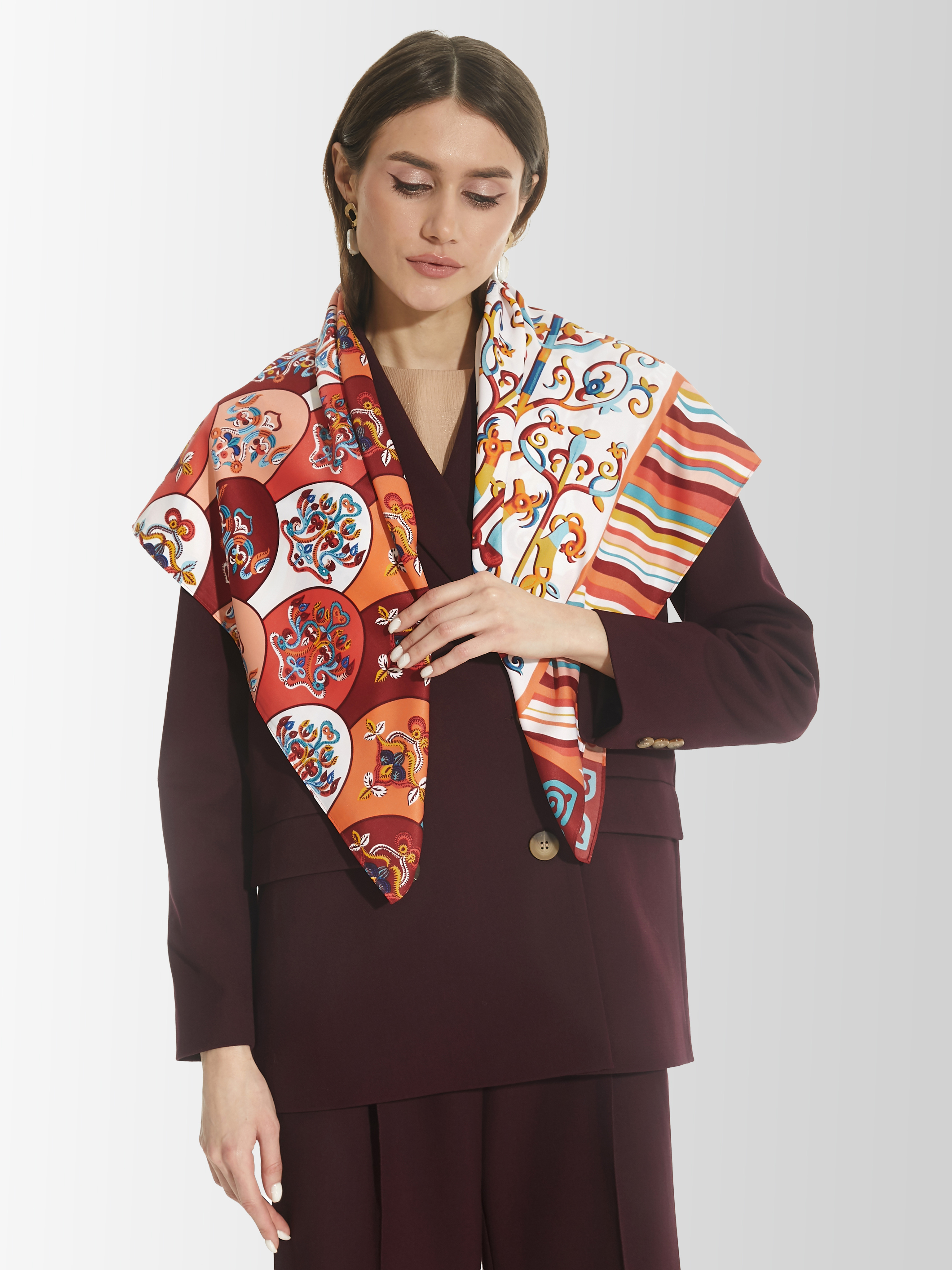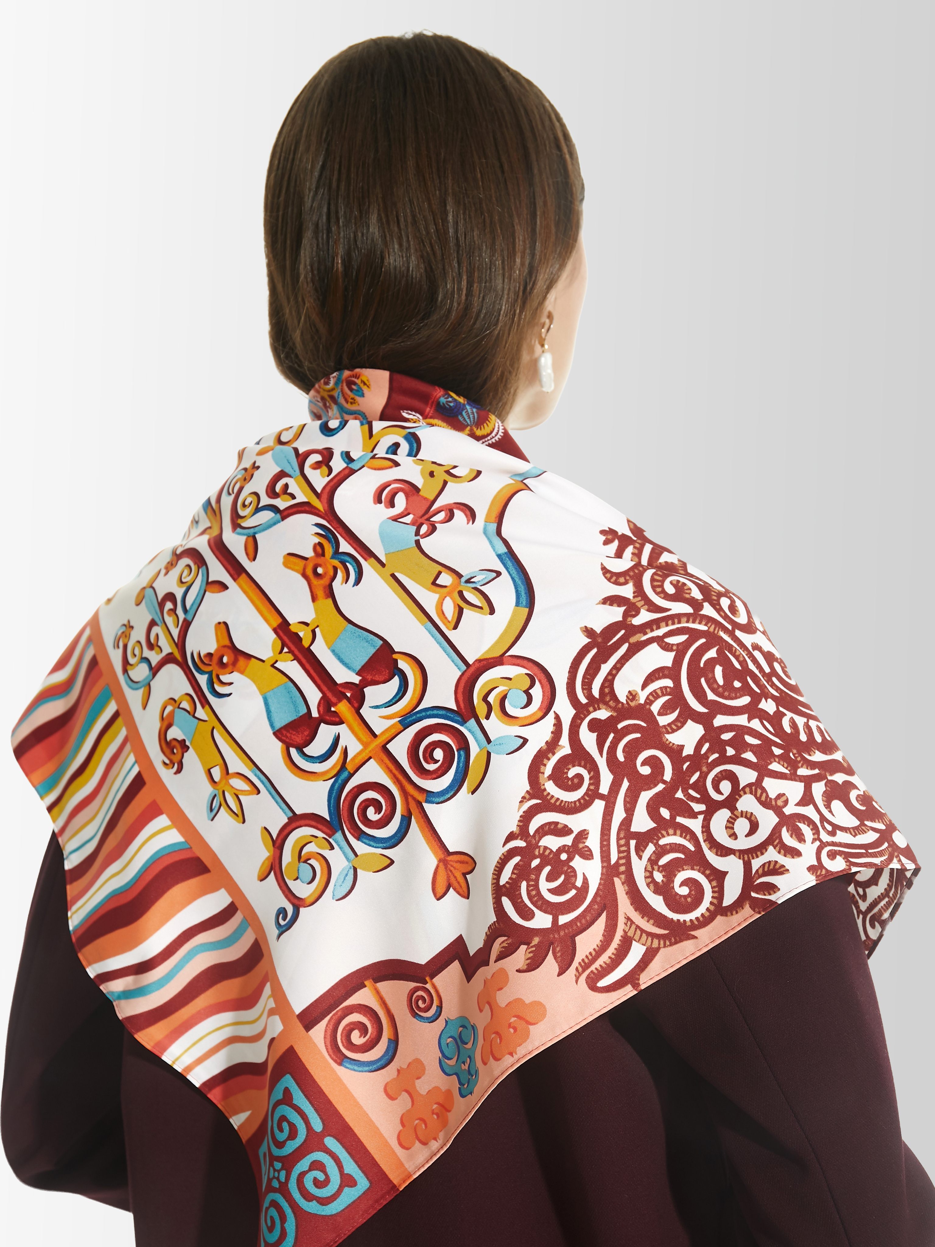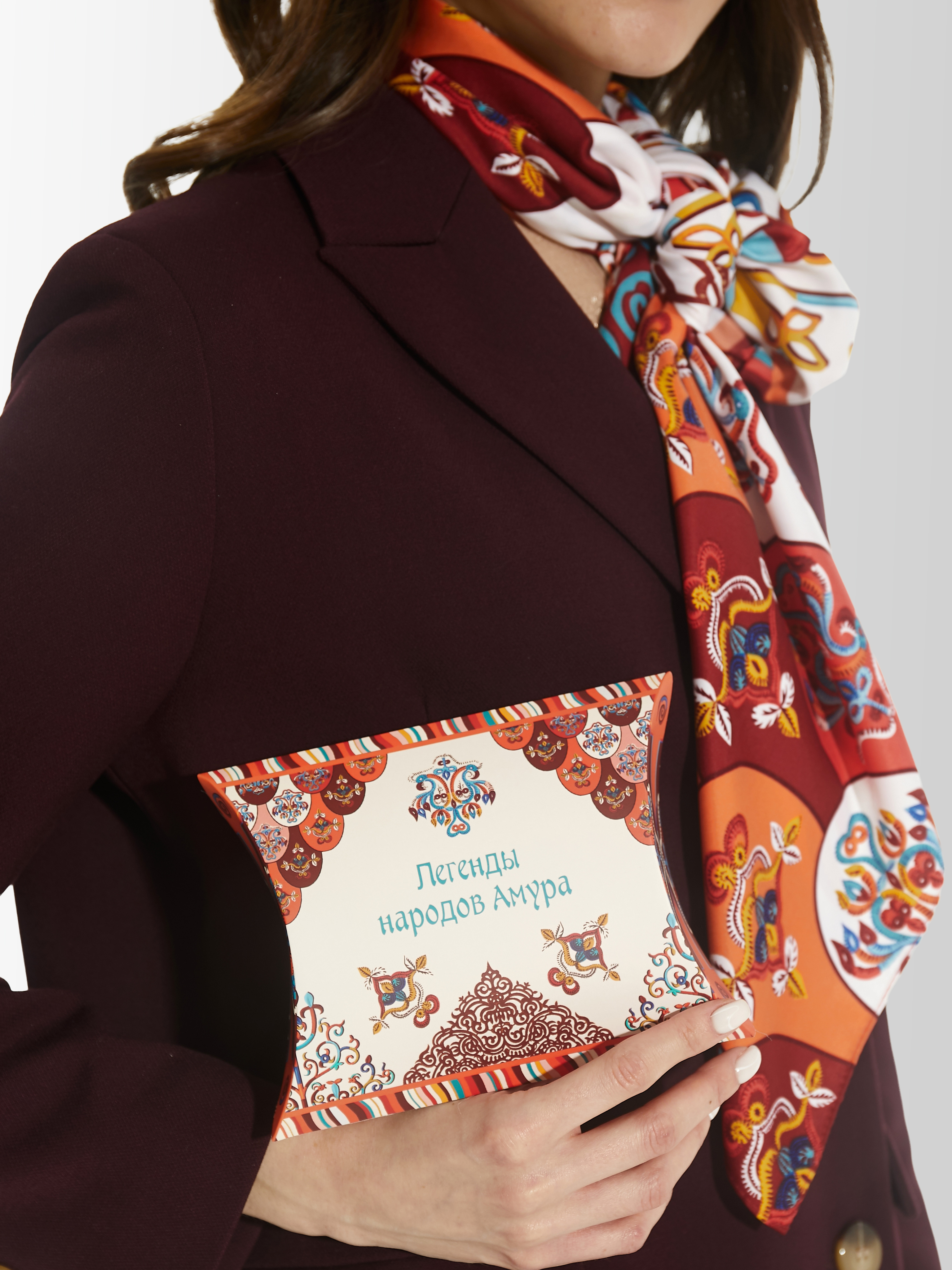 Интересное сочетание орнамента, оттенков, образов. Импонирует интерес автора к теме легенд народов Амура :) Платок очень приятный по ощущениям и красиво драпируется.