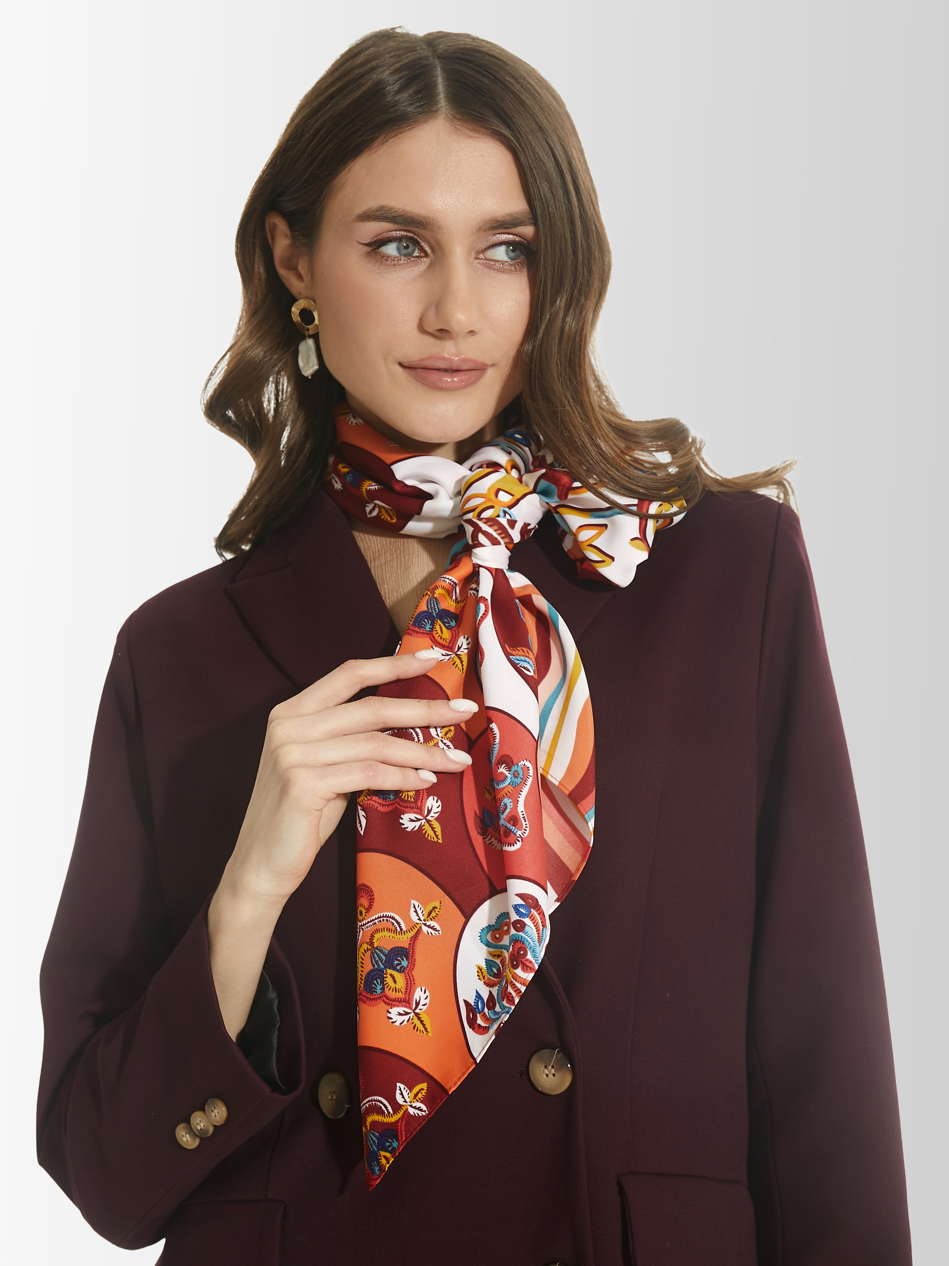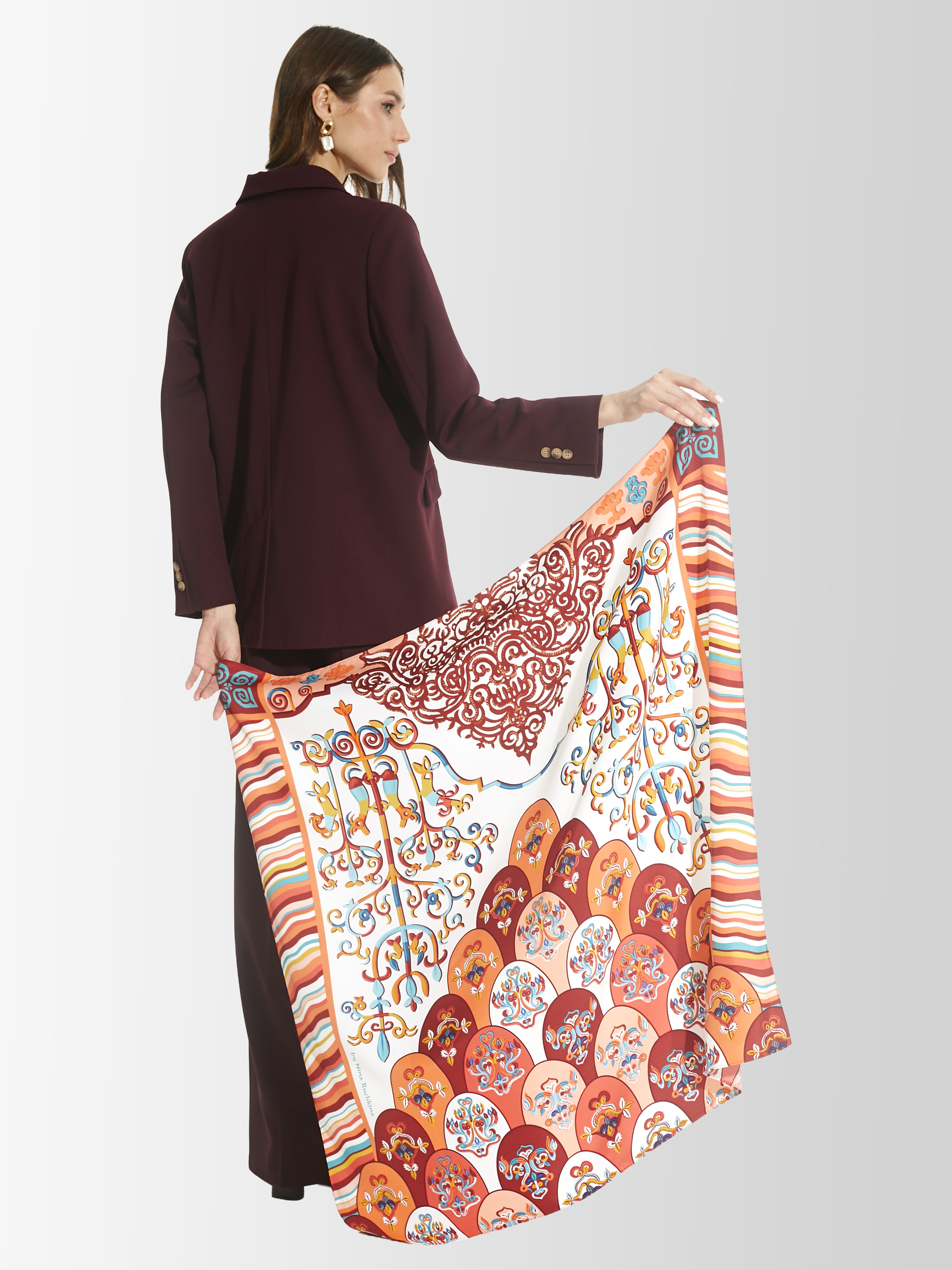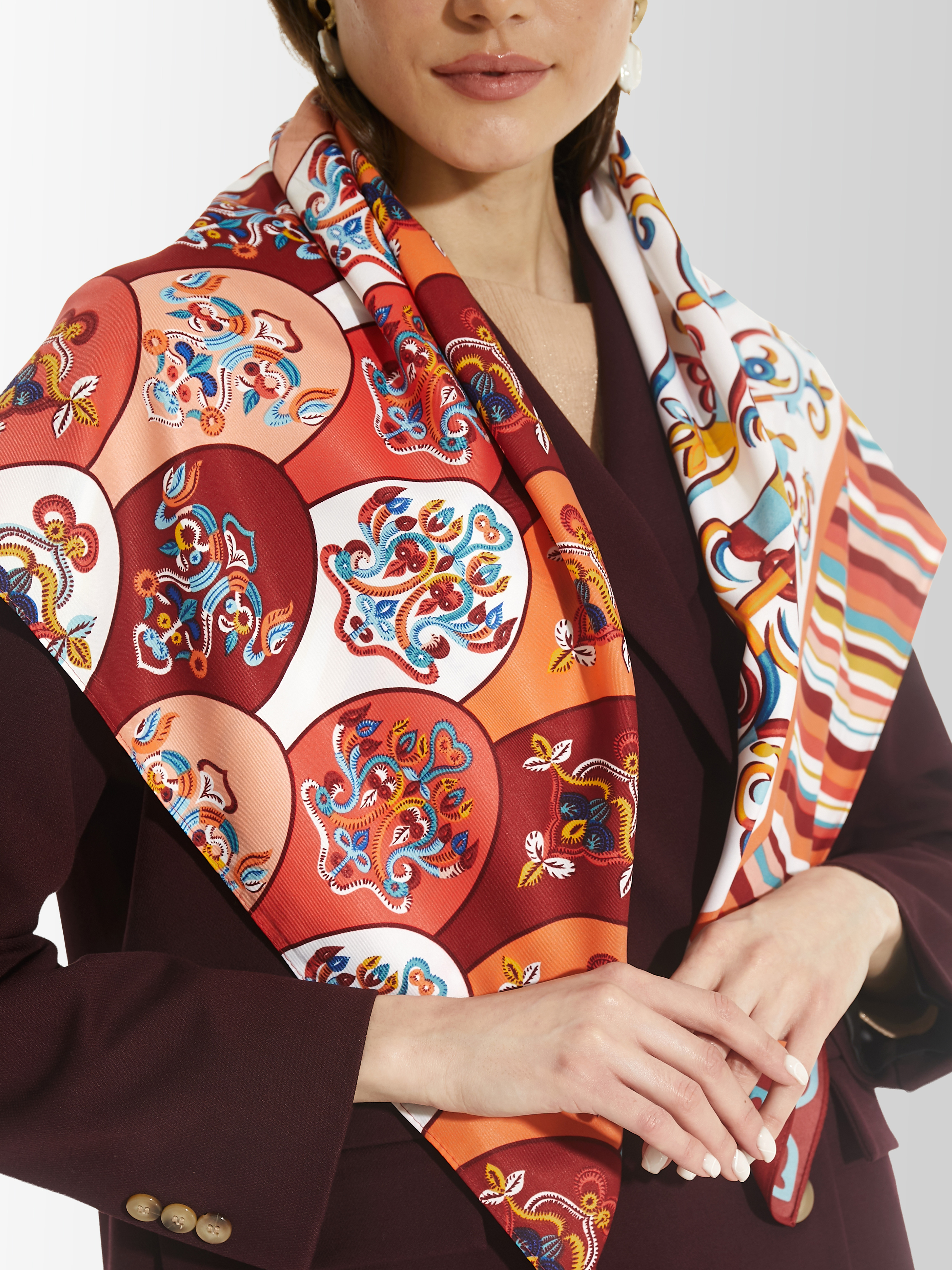 Интересное сочетание орнамента, оттенков, образов. Импонирует интерес автора к теме легенд народов Амура :) Платок очень приятный по ощущениям и красиво драпируется.
