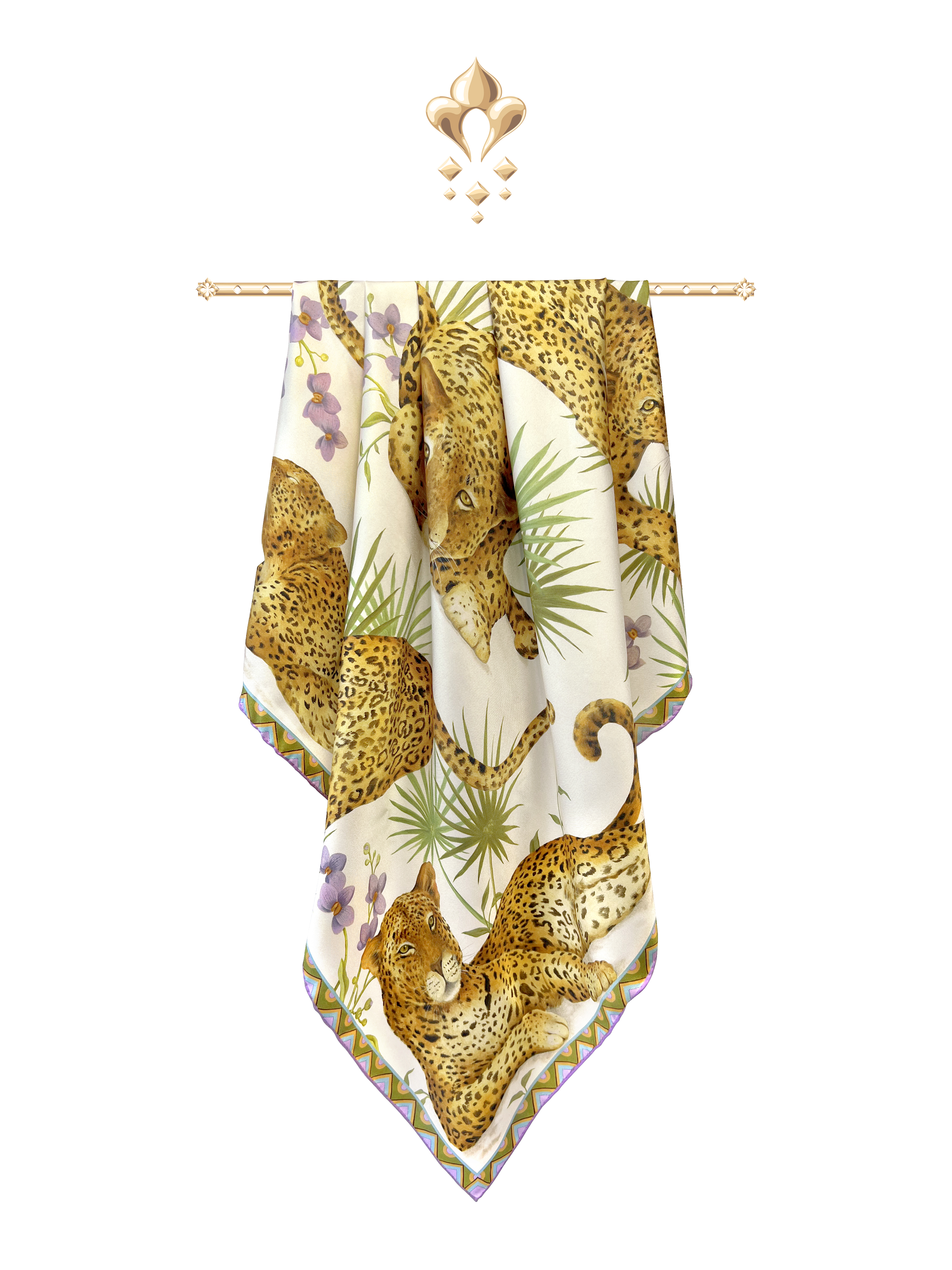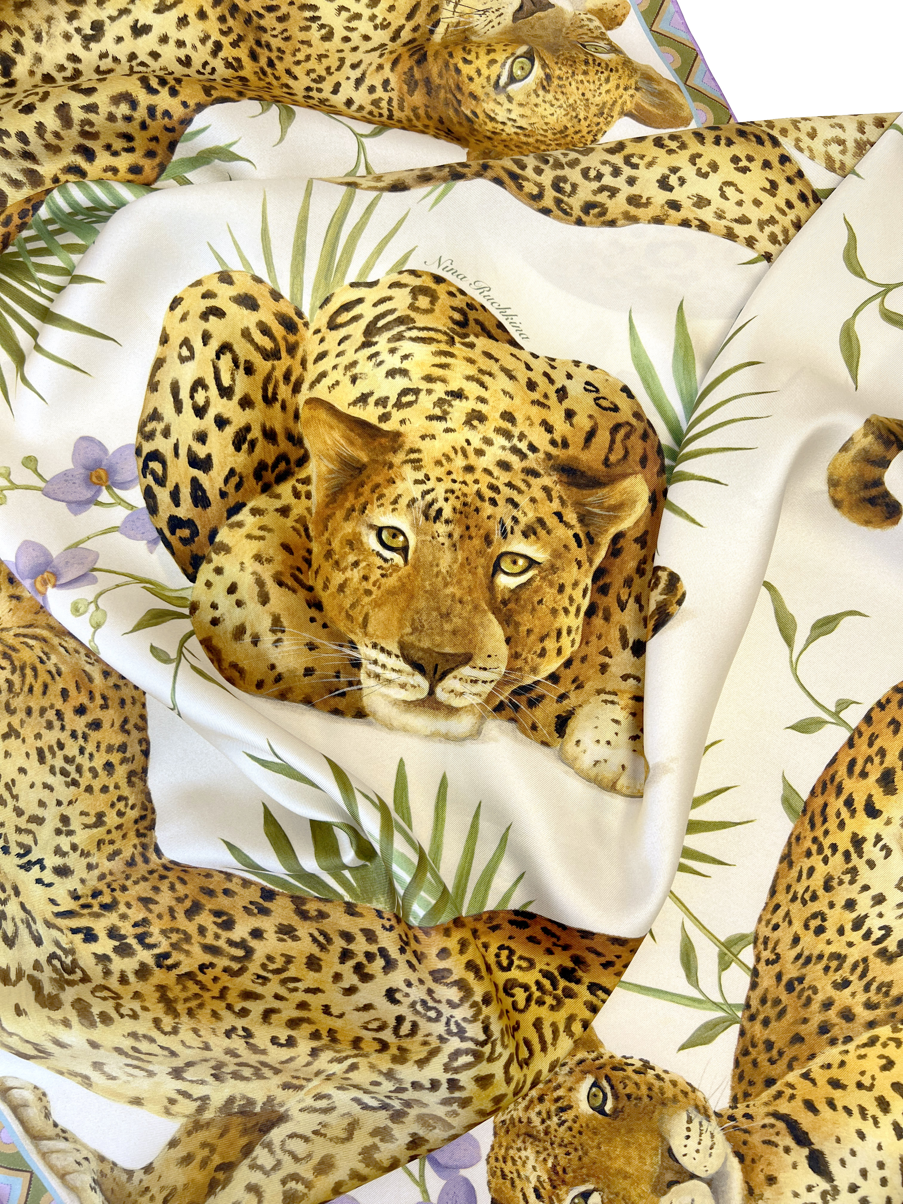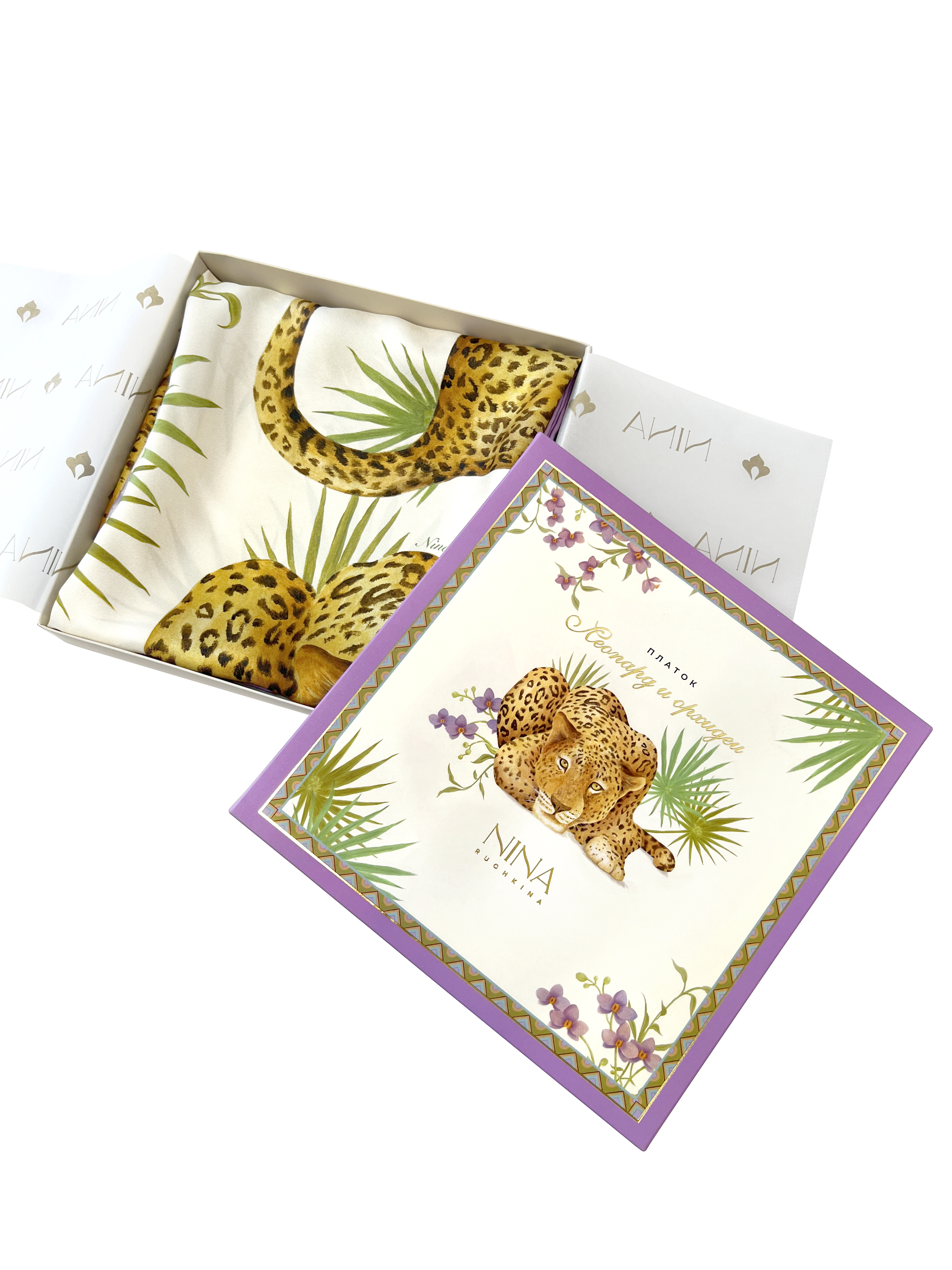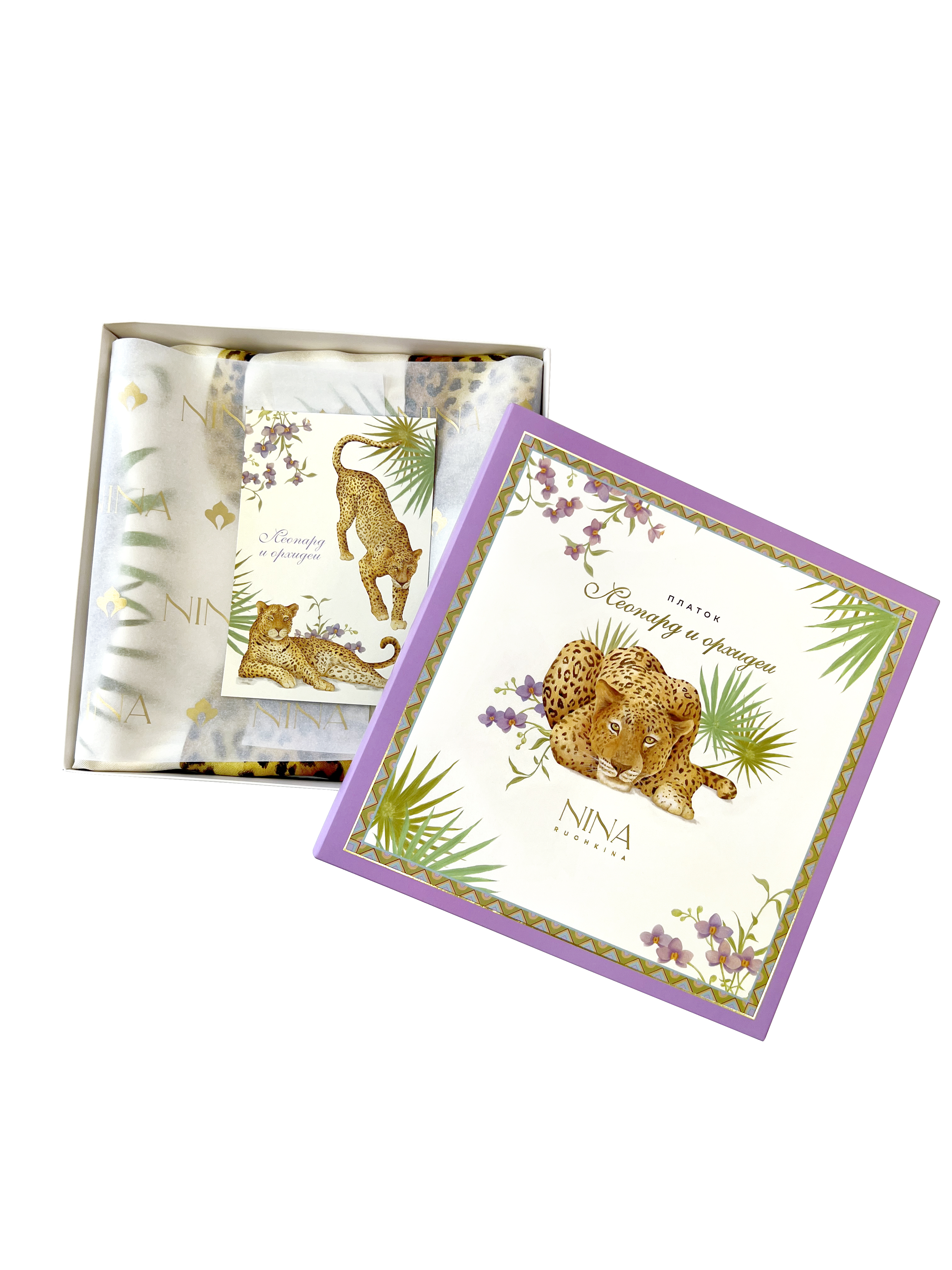 Платок «Леопард и орхидеи» наполнен нежным очарованием скрытой силы, непременно приносящей обладательнице удовольствие и успех!