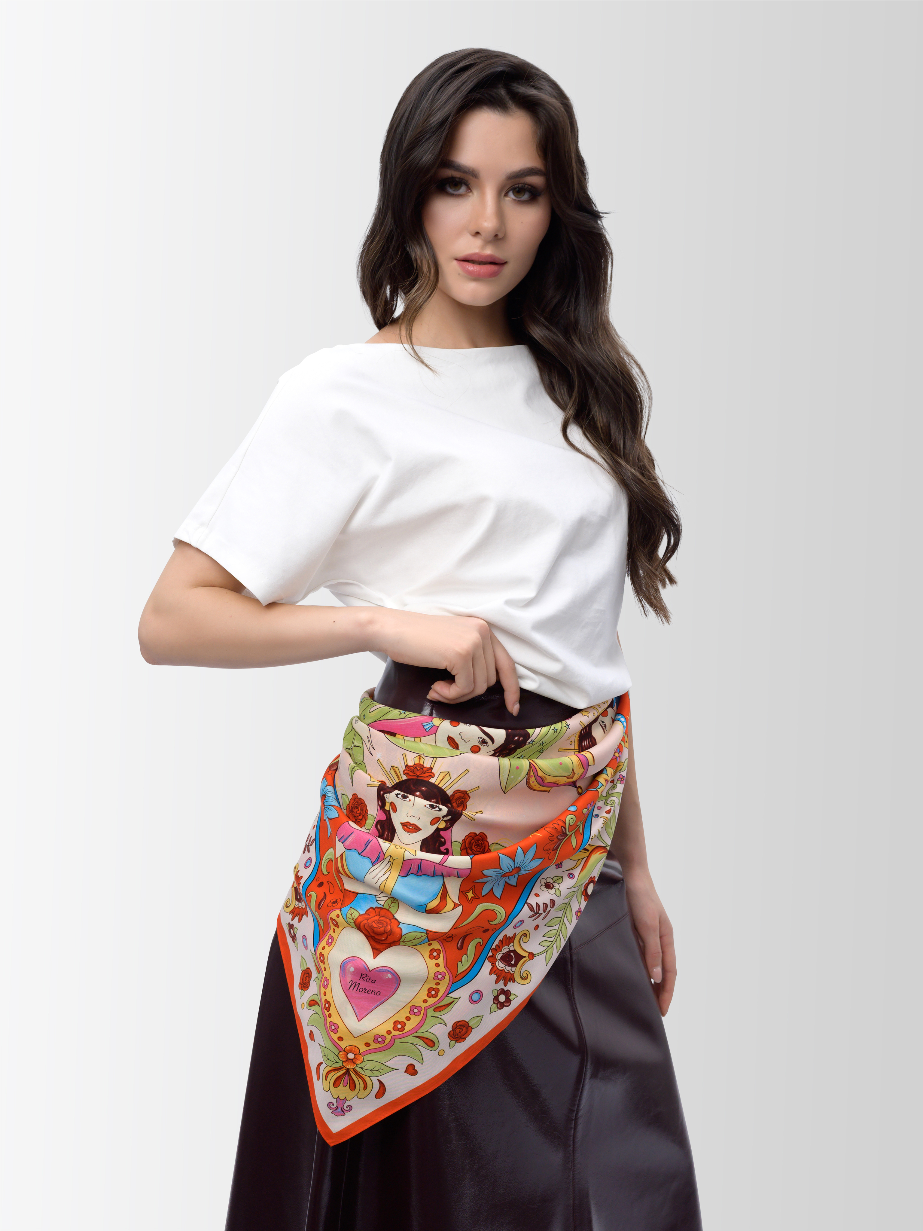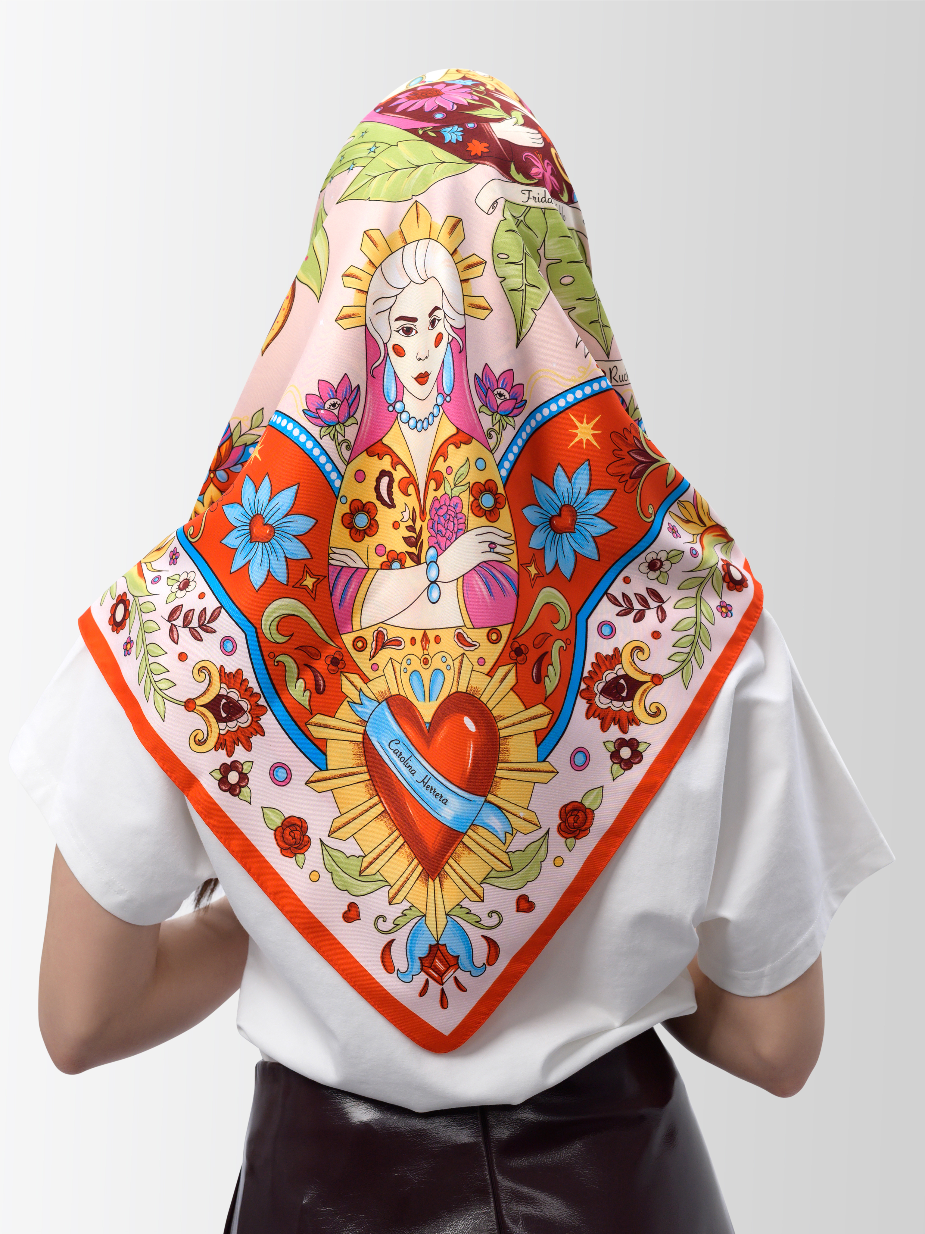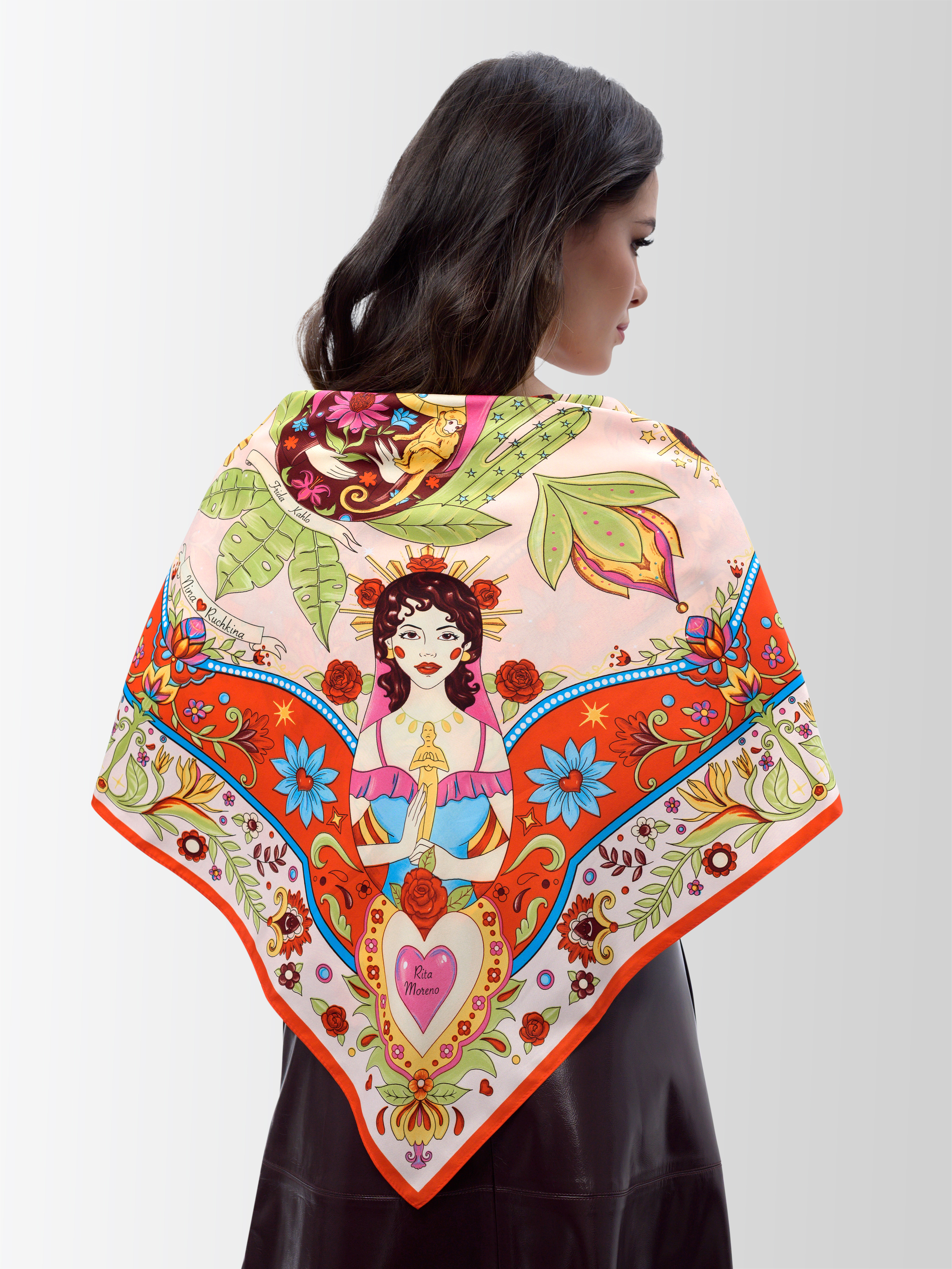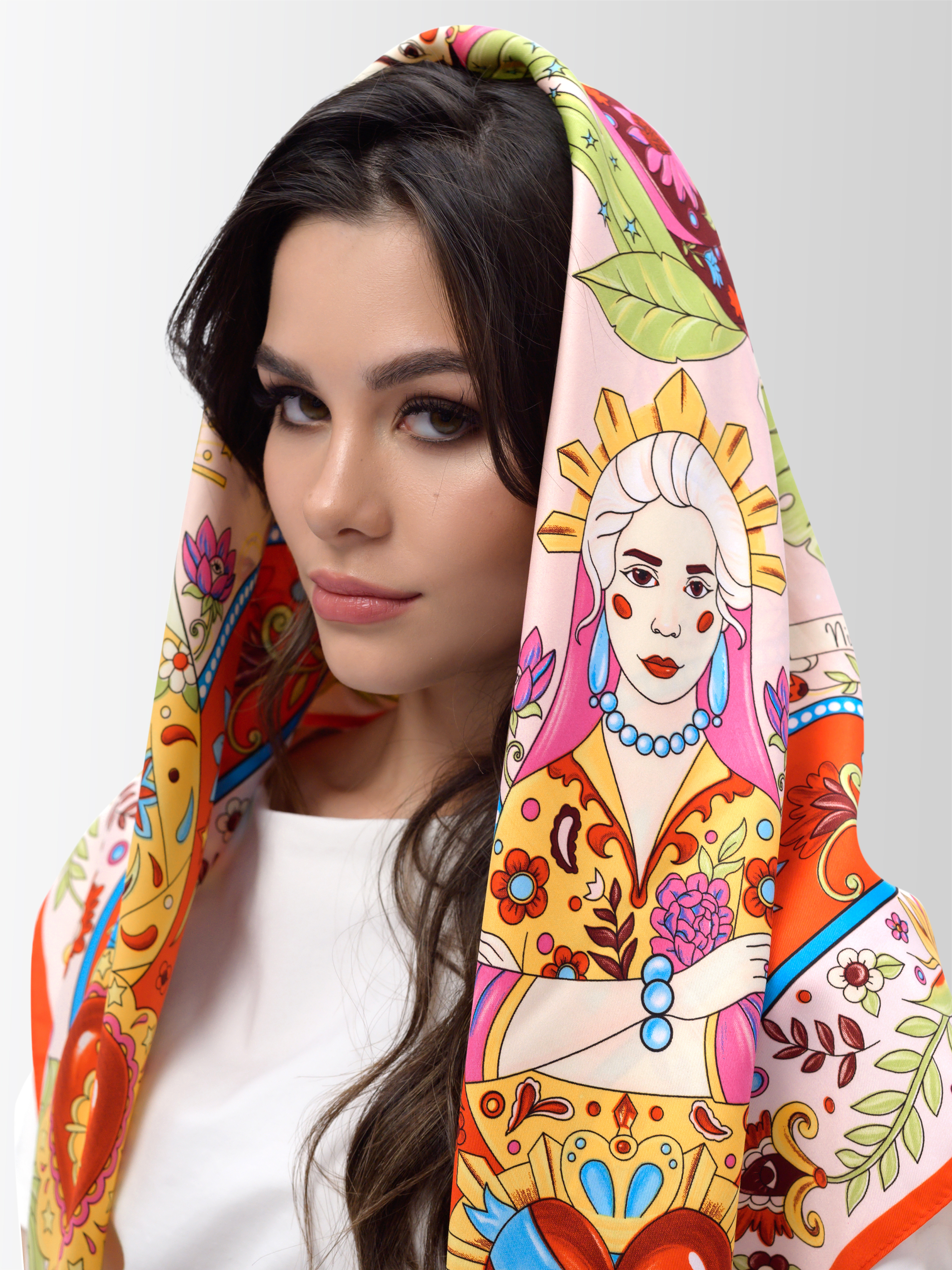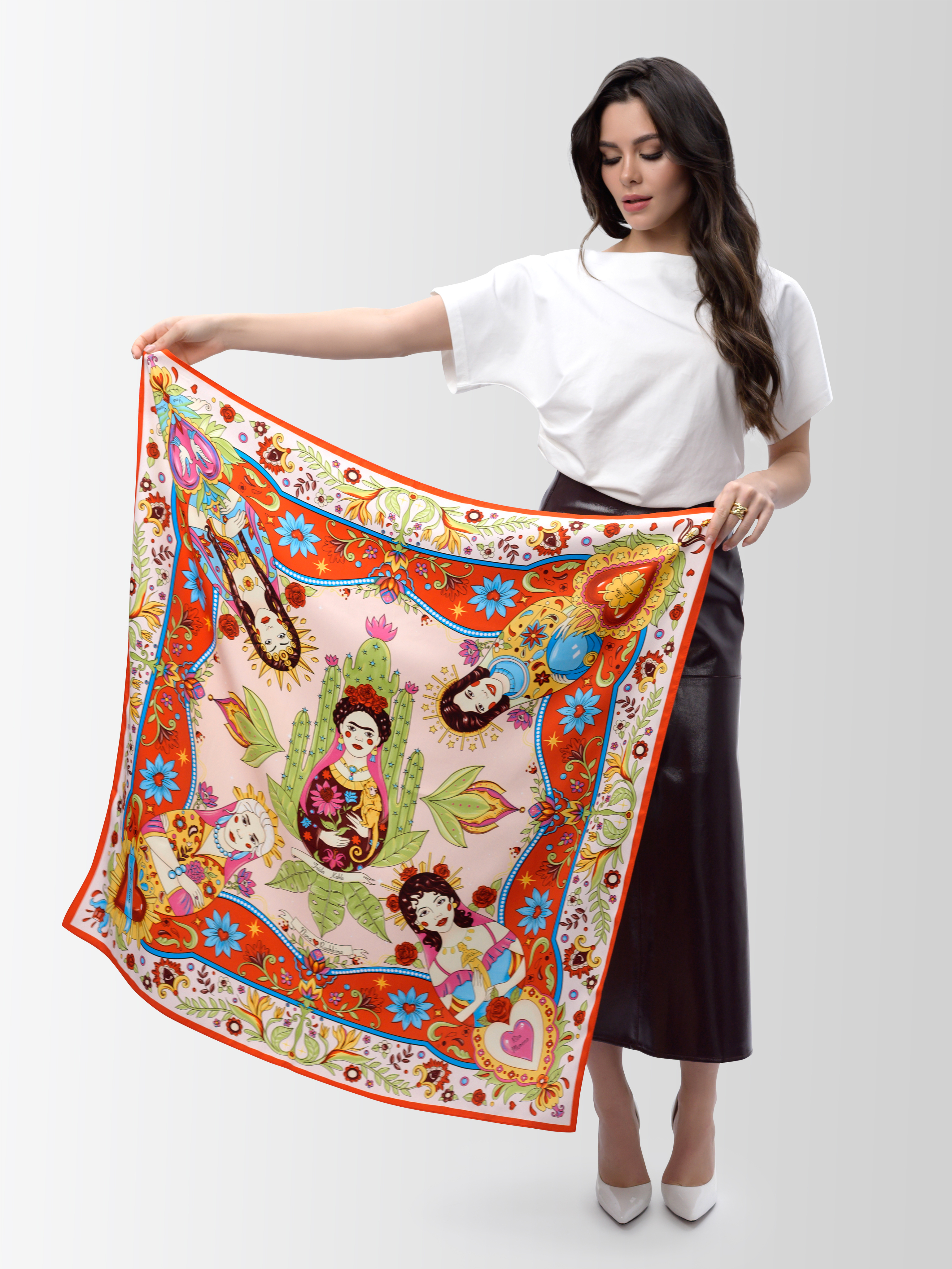 Платок «Матрешки. Латинская Америка» — яркое воплощение красоты, богатства, связей культур далекого континента и России. Образы знаменитых латиноамериканских женщин стилизованы в виде матрёшек, подчеркивая объединяющую энергию женской силы.