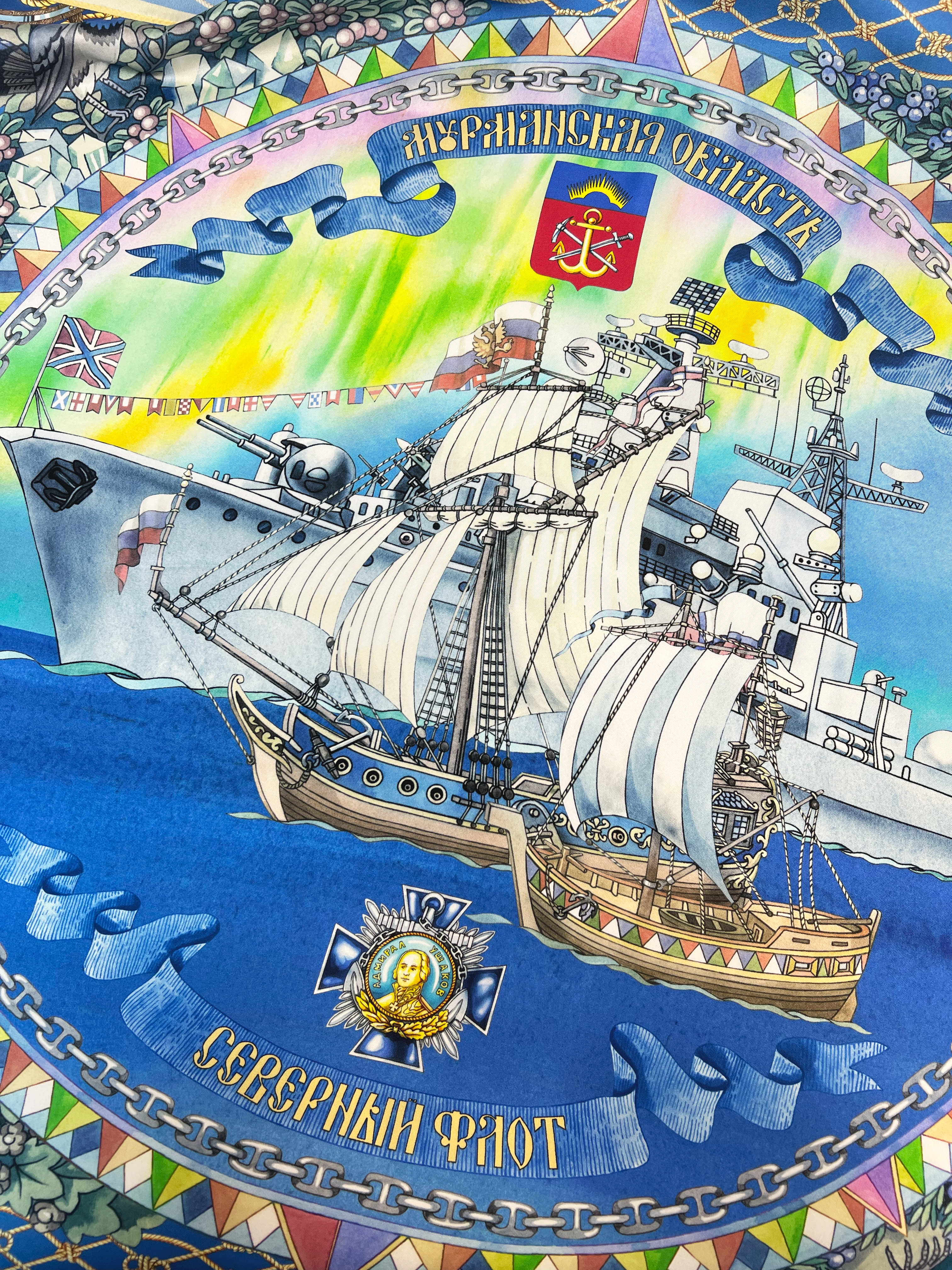 Платок посвящен славе форпоста российской Арктики и Северного флота - Мурманской области. «Город на Мурмане» или Мурманск - ныне Город-Герой и один из самых значимых портов России, поражающий богатством истории и природы.