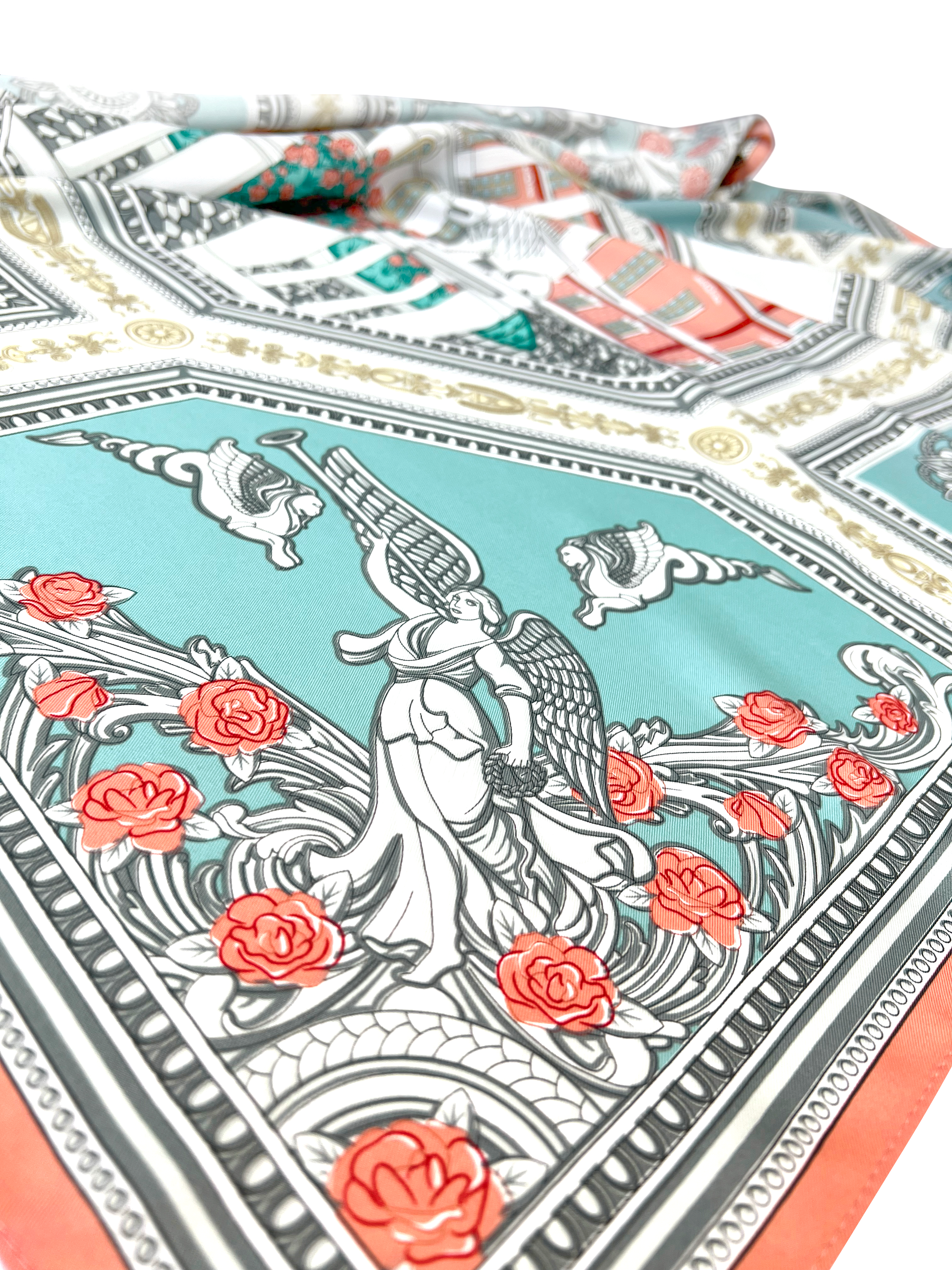 Композиция платка отражает эти знаковые реалии. В центре — восьмигранный медальон с общим видом дворца, знаменитыми львами и розарием. В обрамлении использованы росписи в технике гризайль, рисунок декоративной лепнины из каминного зала, библиотеки и столовой Московского Английского клуба. Тема роз сопровождает все элементы композиции, оживляя её строгий облик.