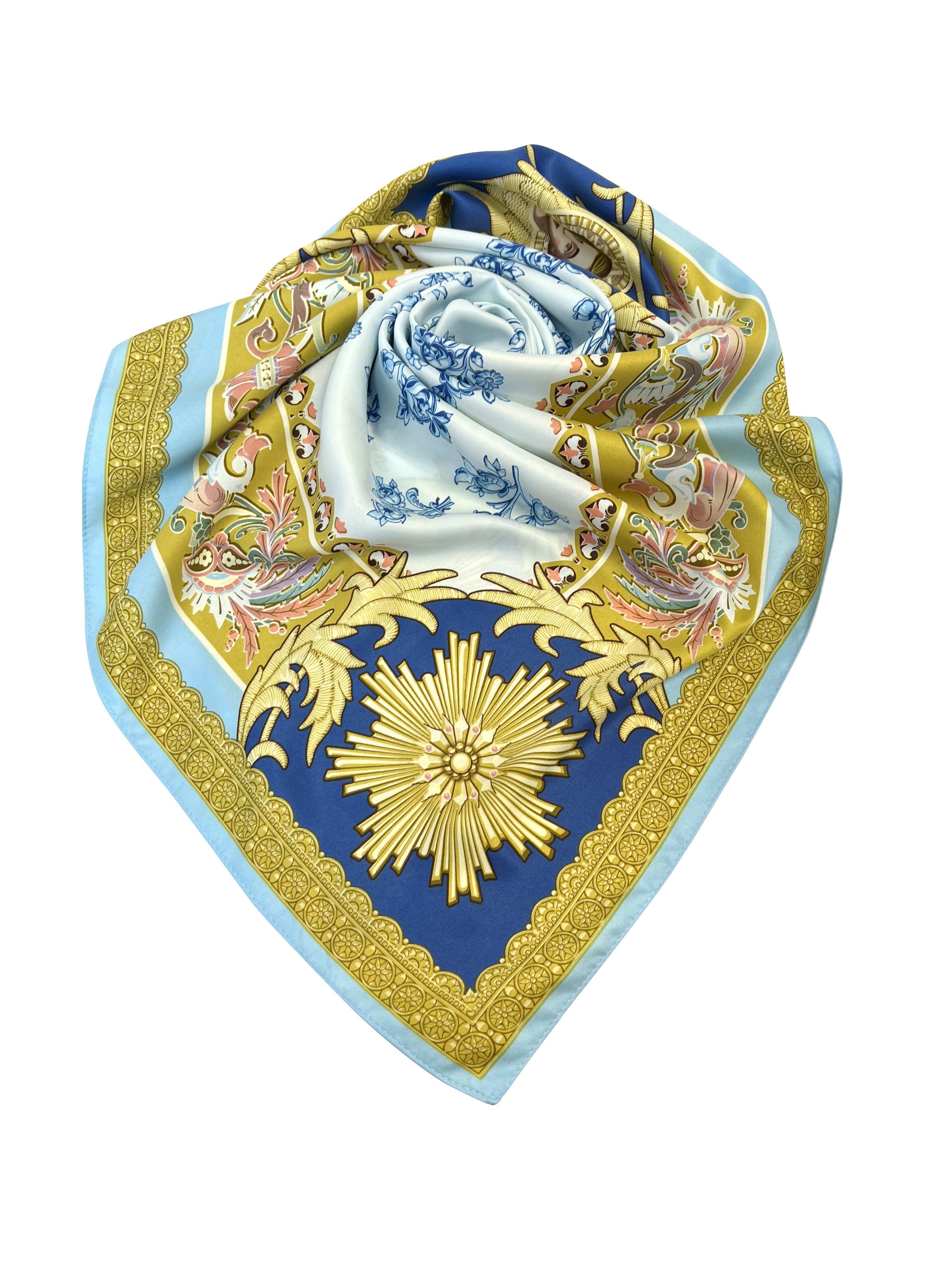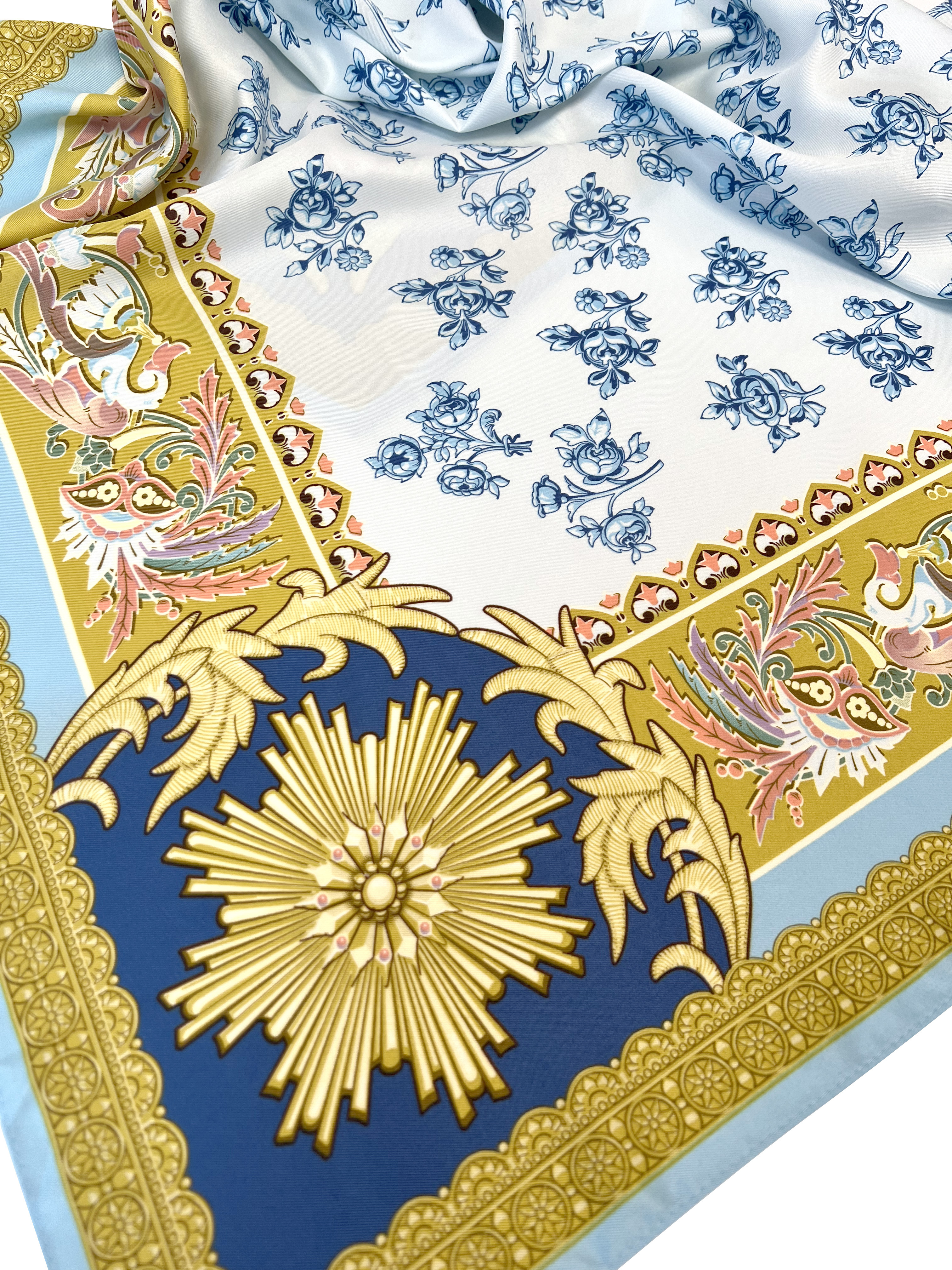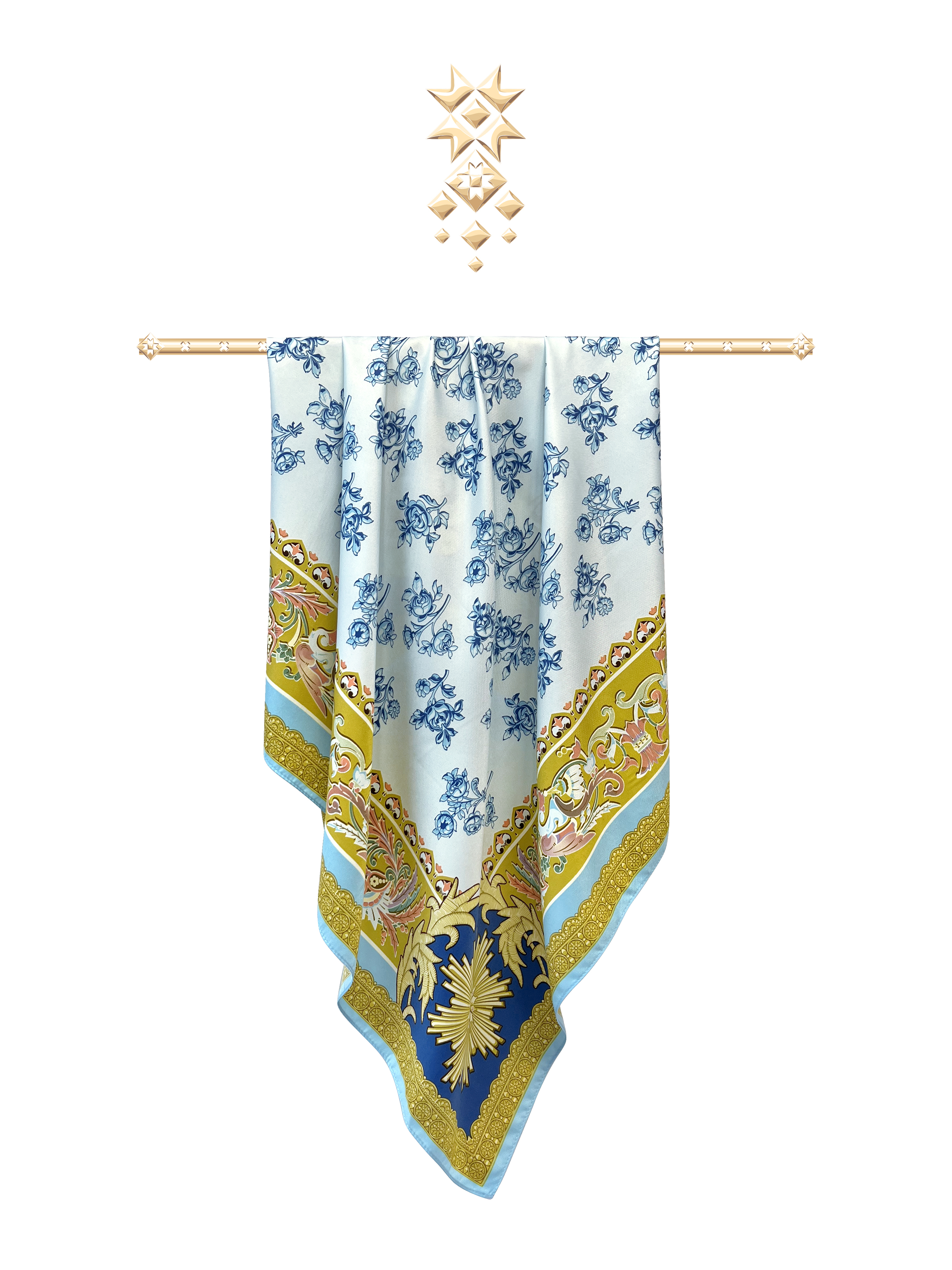 Мягкий колорит платка образован сочетанием оттенков лазоревого и золотого цветов, традиционно считающихся «богородичными», приносящими духовную радость, мир и благополучие.