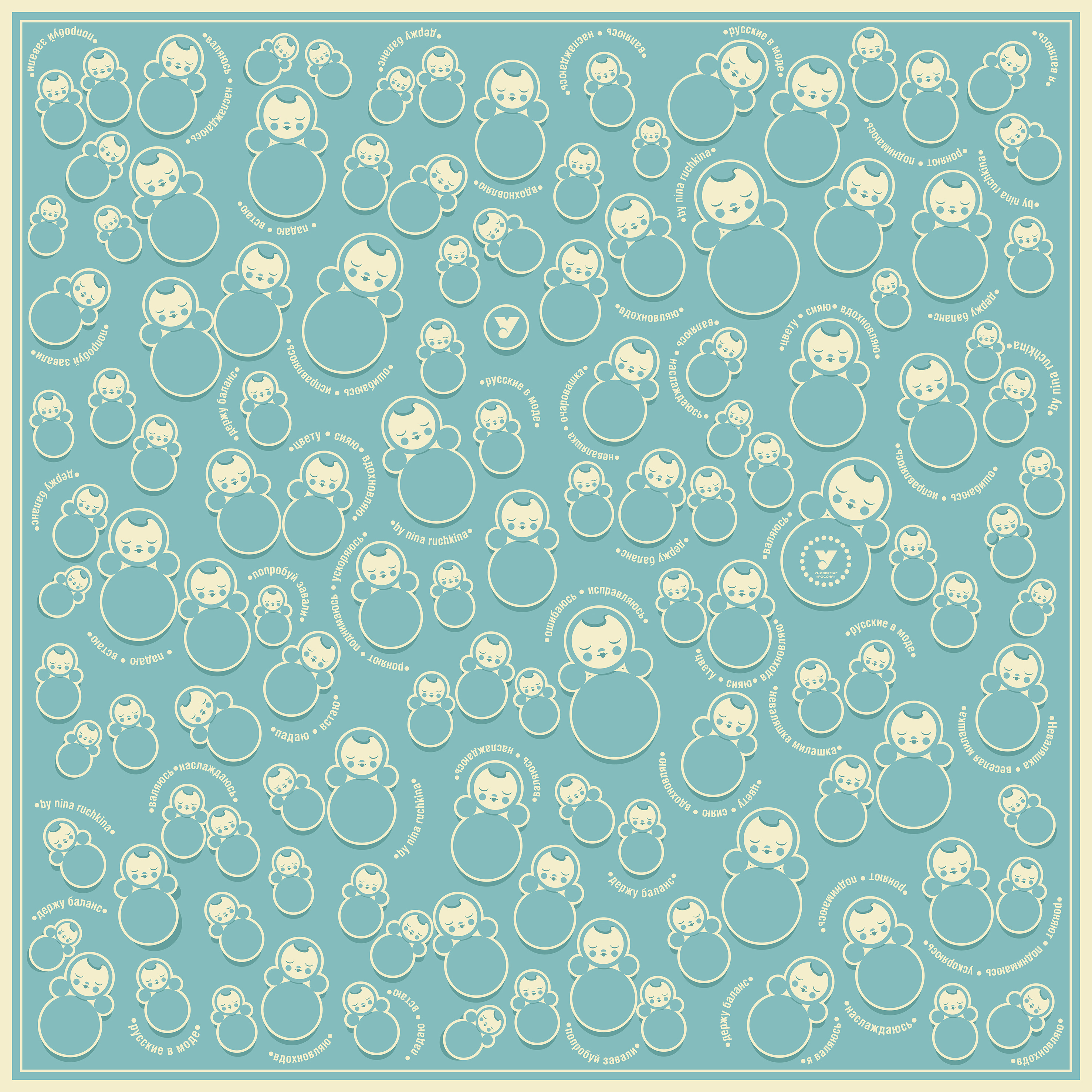 На платке милые сердцу образы воплощают нежную искренность, душевную утонченность и веру в лучшее. Взымая ввысь на небесно-голубом фоне, неваляшки передают лирическое настроение полёта мечты, созидания, исполнения желаний. Значимость умения сохранять баланс и внутреннюю гармонию подчеркивают строки, обрамляющие фигуры – «падаю-встаю», «цвету-сияю-вдохновляю», «роняют-поднимаюсь-ускоряюсь» и другие.