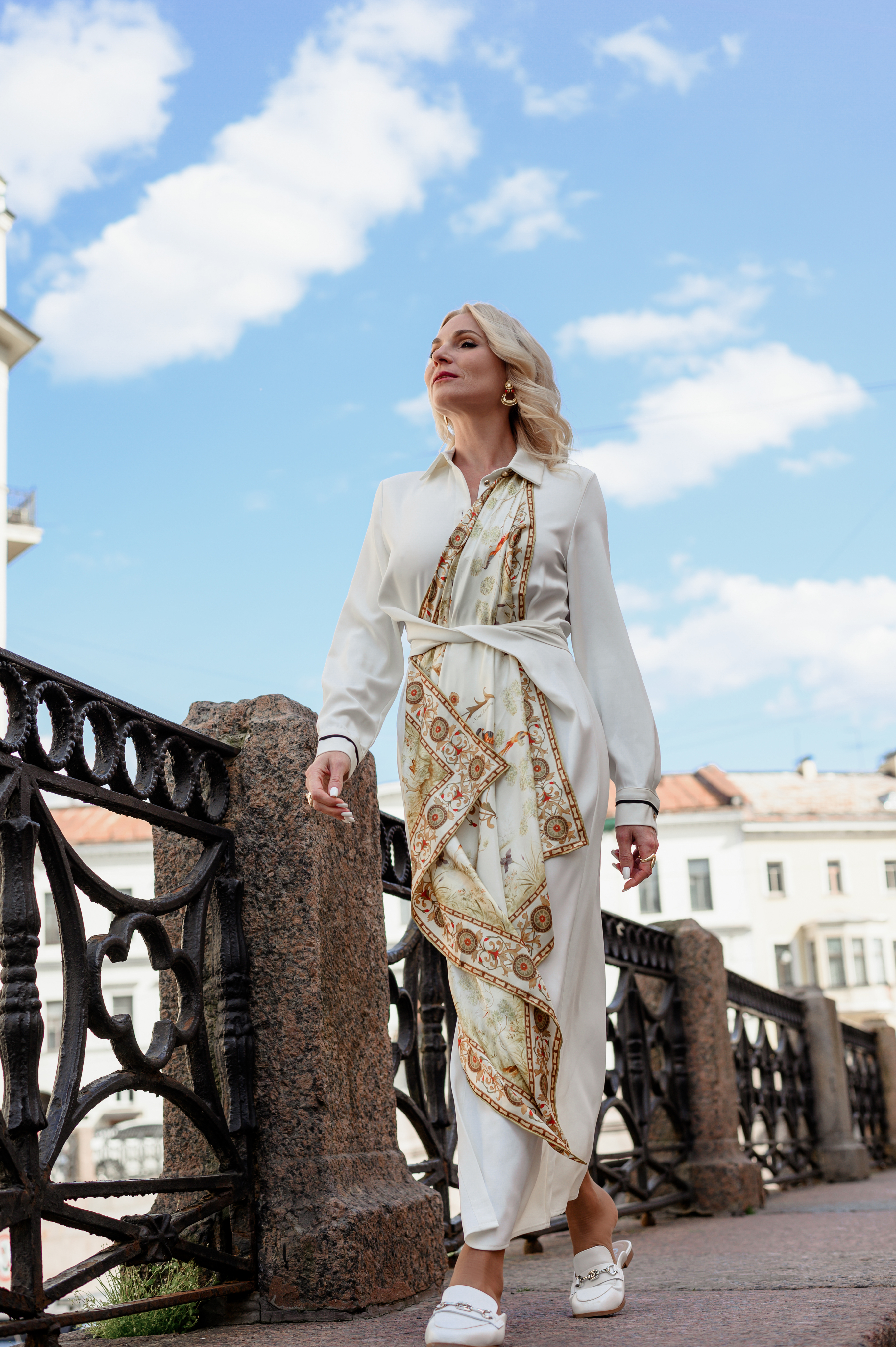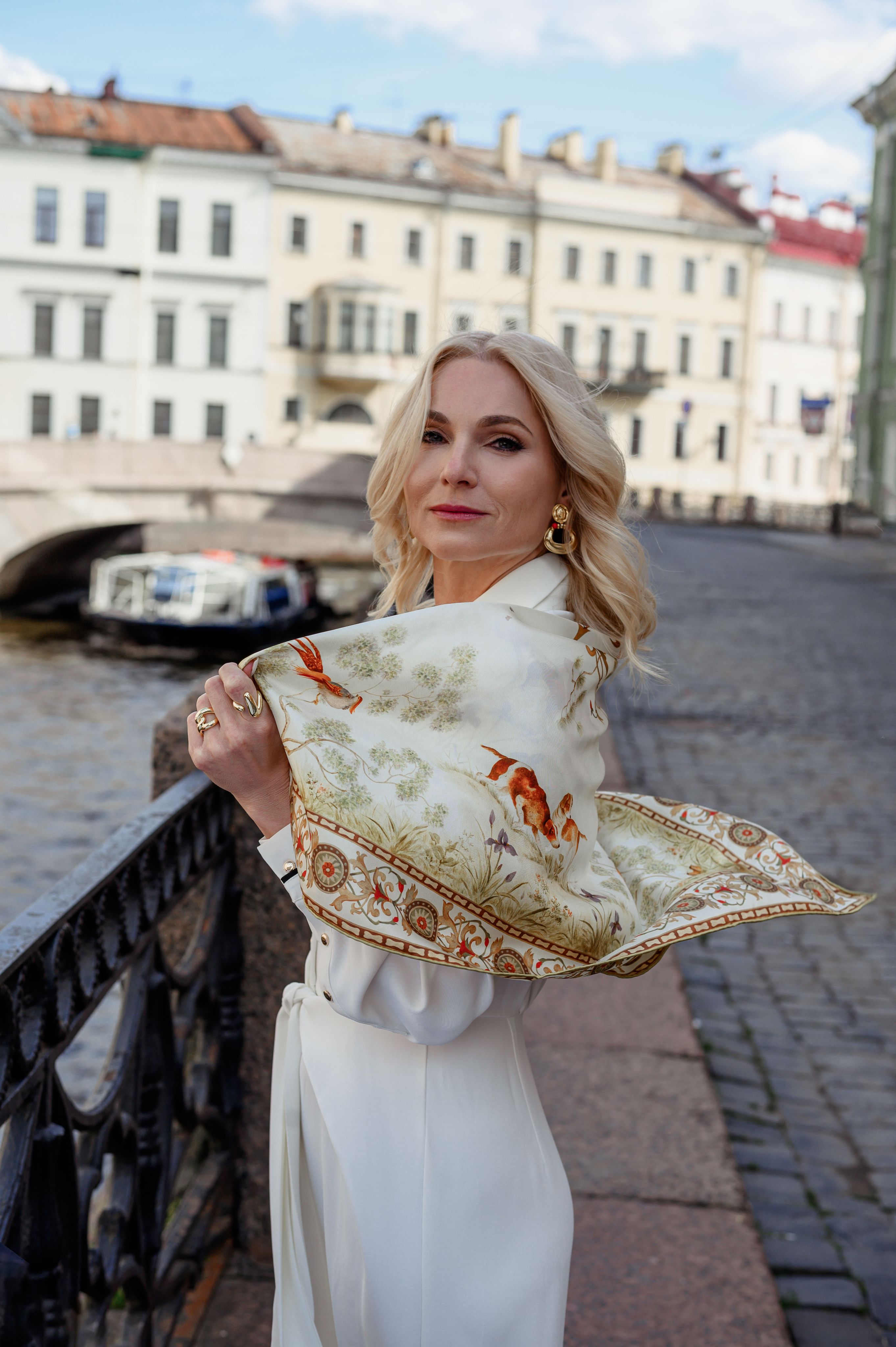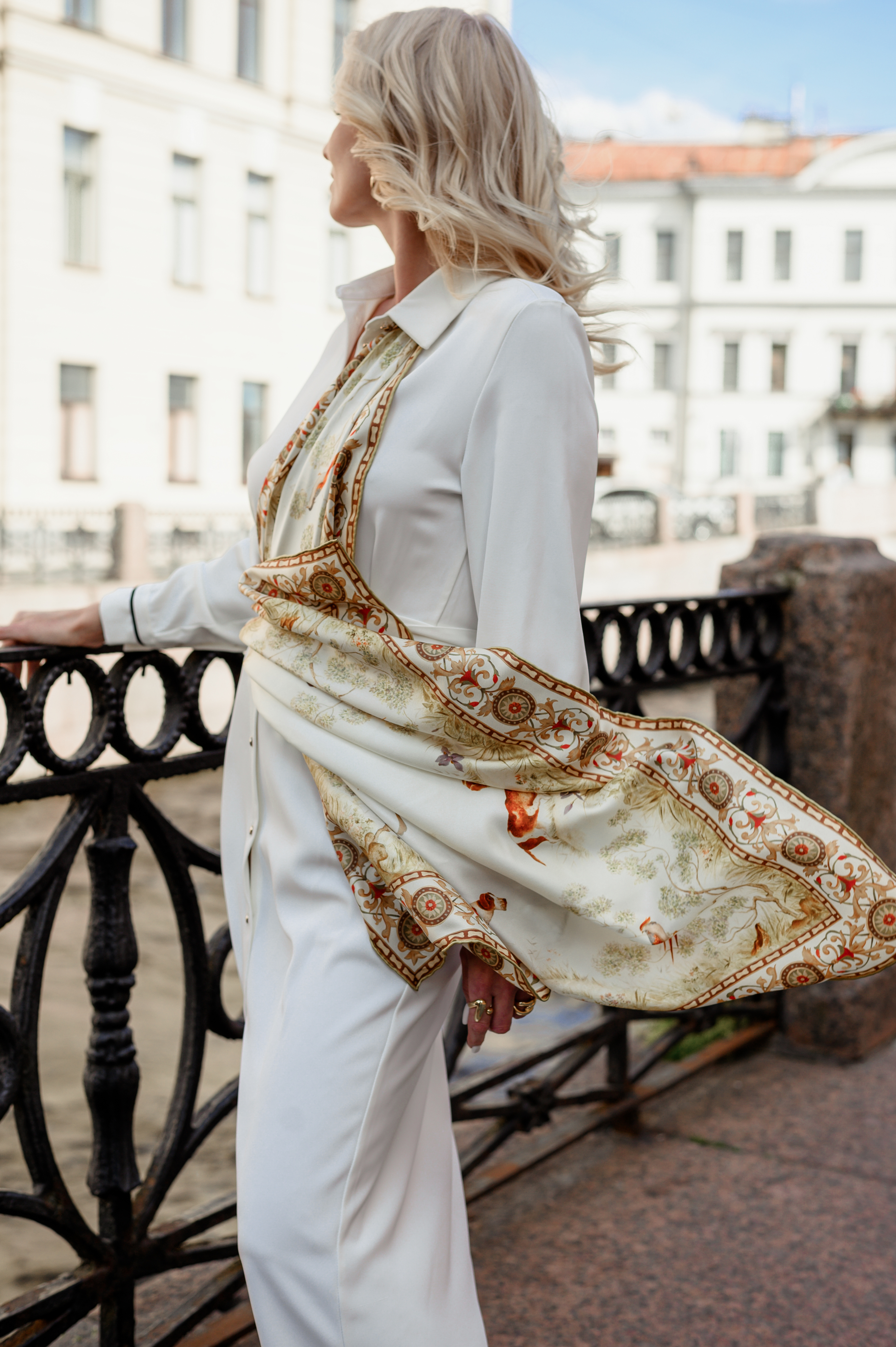 Тонкое изящество декора окружающего пейзажа и кайма стилизованного орнамента завершают дизайн. Платок наполнен атмосферой легкости аристократичного стиля и станет вашим по-настоящему любимым украшением.