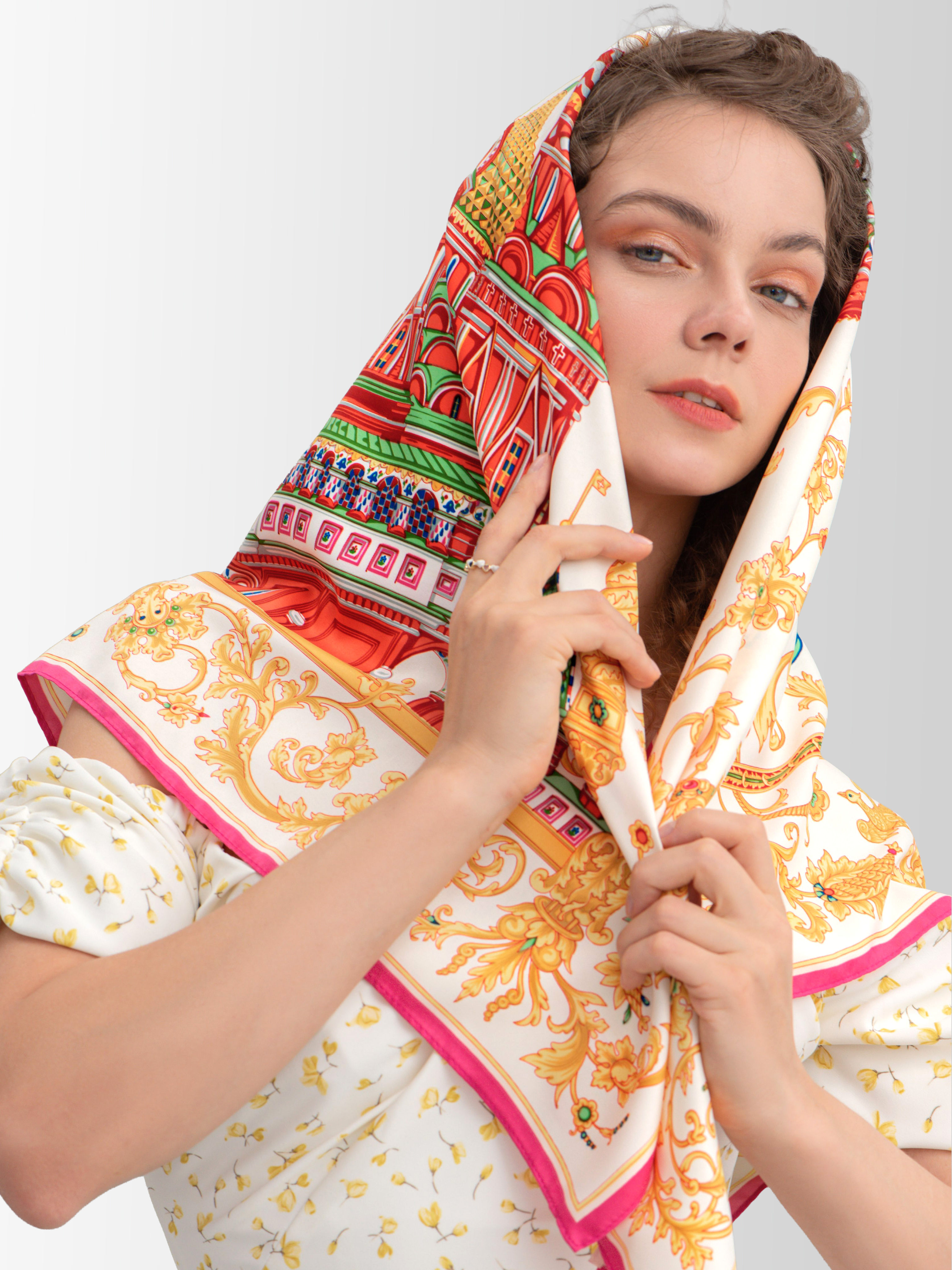 Сказочный вид собора отражен на золотом фоне новинки от бренда «Русские в моде» by Nina Ruchkina. Настоящее восьмое “чудо Света” обрамлено царскими коронами и райскими птицами, свидетельствующими об уникальности и роскоши этой исторической достопримечательности, отстроенной 1 октября 1552 года на праздник Покрова Богородицы.