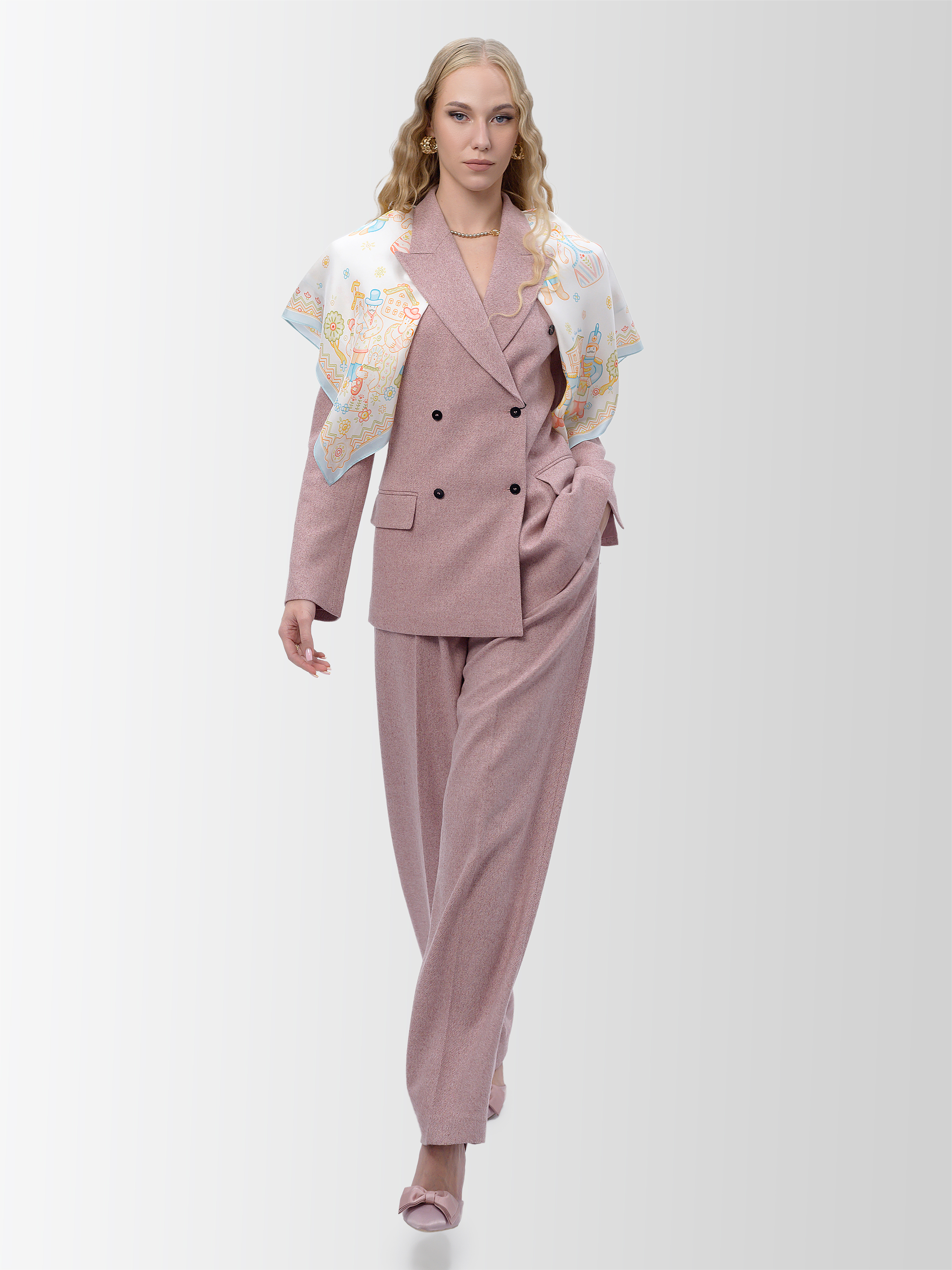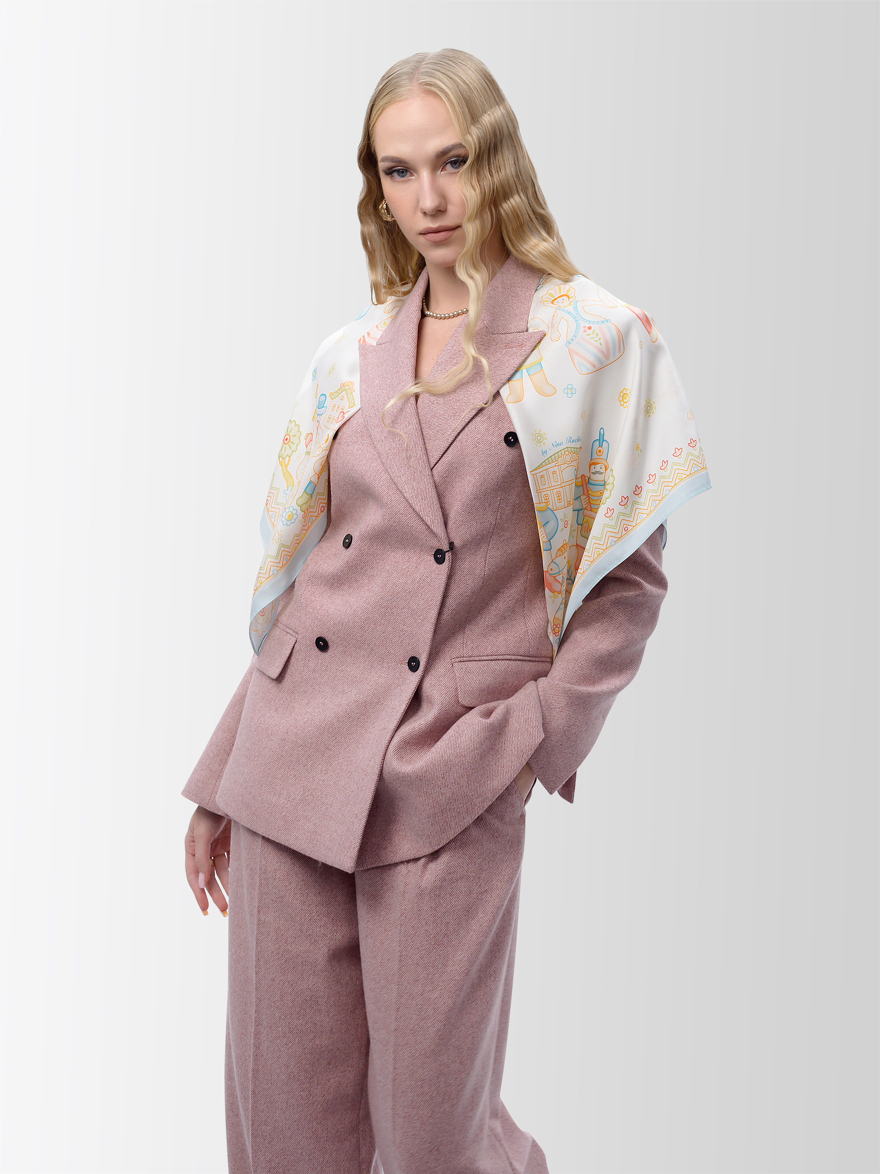 Нежный платок «Старооскольская игрушка» воплощает панораму прекрасных фигурок, выполненных в потомственных канонах лепки Оскольского края. Это бело-глиняные расписные образы барышень и кавалеров, крепких семей, затейливых зверей и зданий, фигурки бравых воинов, поражающих великолепием амуниции. Центральная композиция представляет хоровод пляски «Пересек», связанной с танцевальной культурой Белгородской земли.