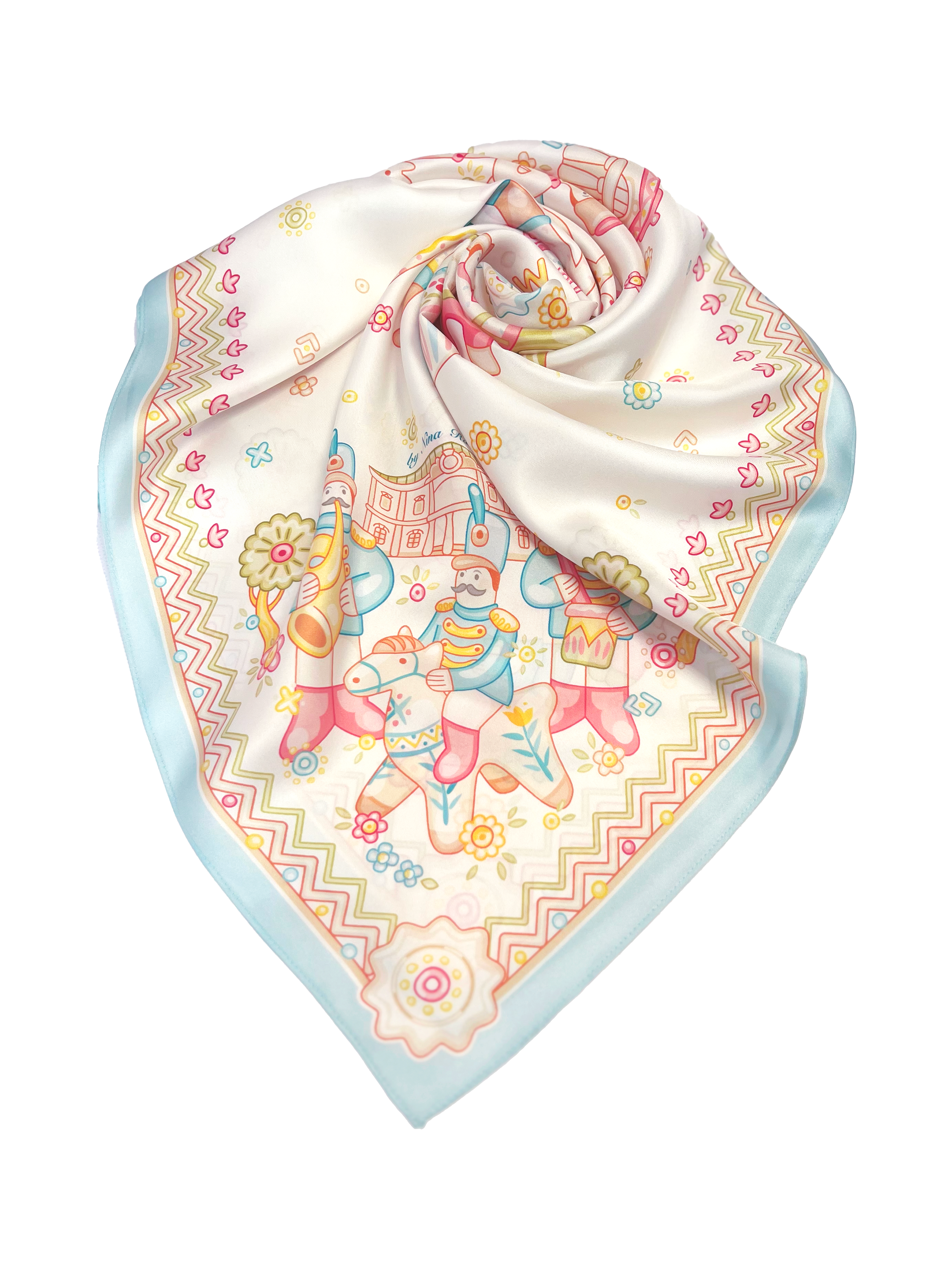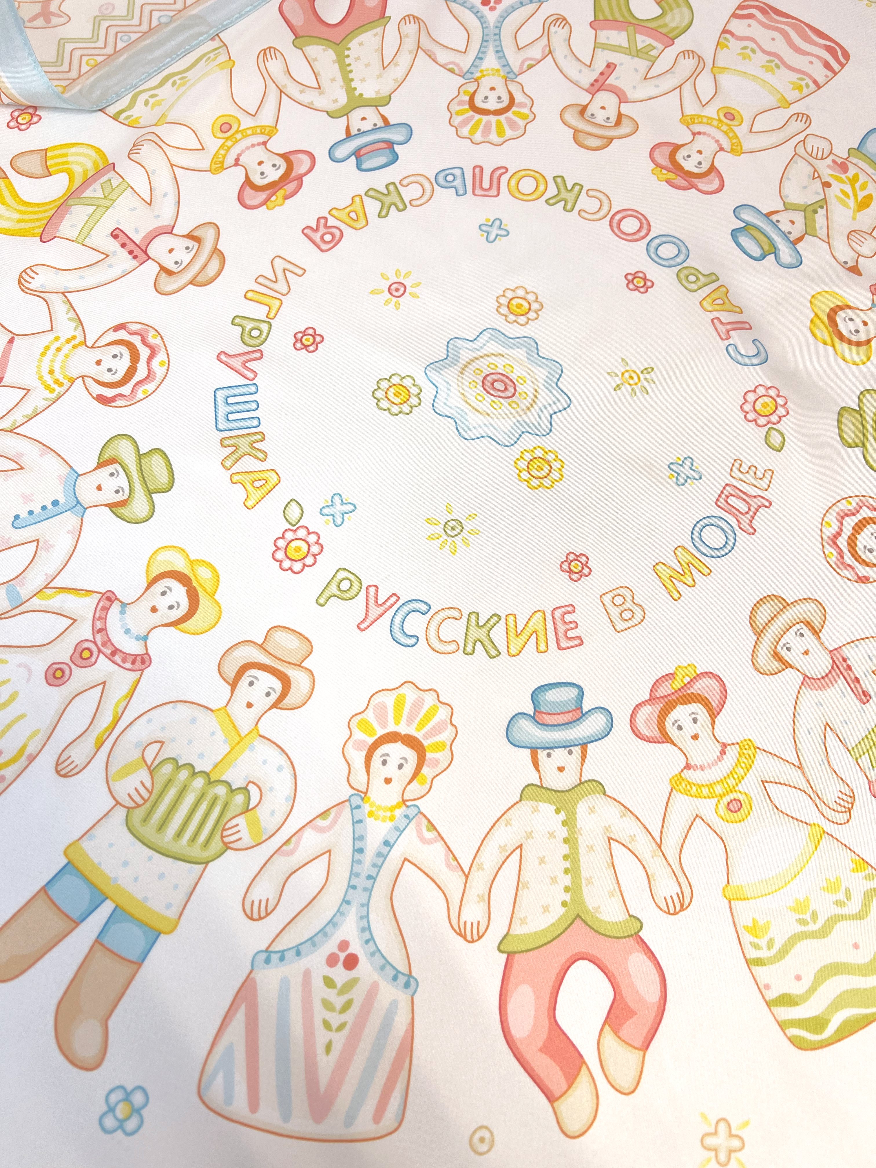 Нежный платок «Старооскольская игрушка» воплощает панораму прекрасных фигурок, выполненных в потомственных канонах лепки Оскольского края. Это бело-глиняные расписные образы барышень и кавалеров, крепких семей, затейливых зверей и зданий, фигурки бравых воинов, поражающих великолепием военной амуниции. Центральная композиция представляет хоровод танца «Пересек», связанного с танцевальной культурой Белгородской земли.