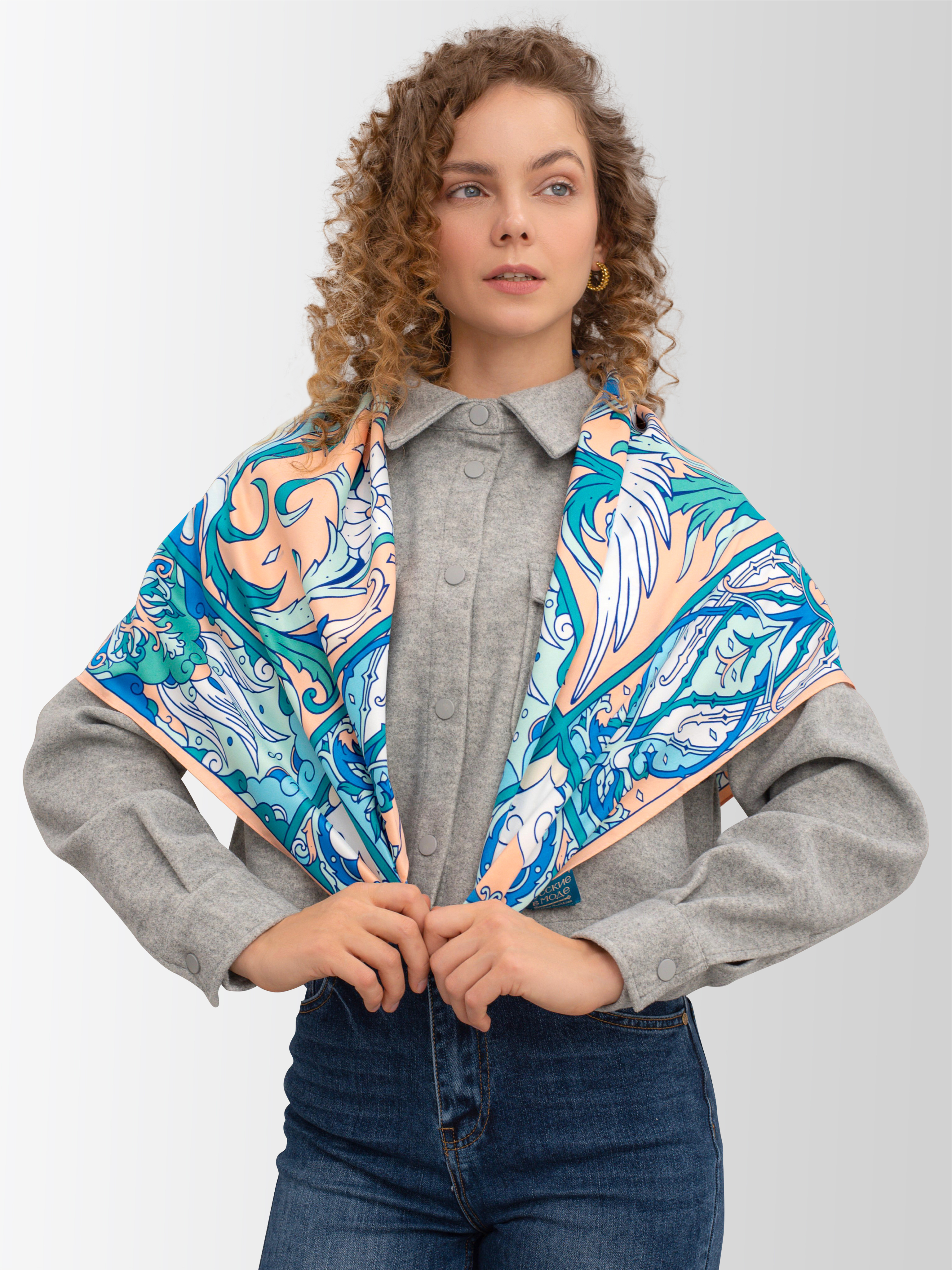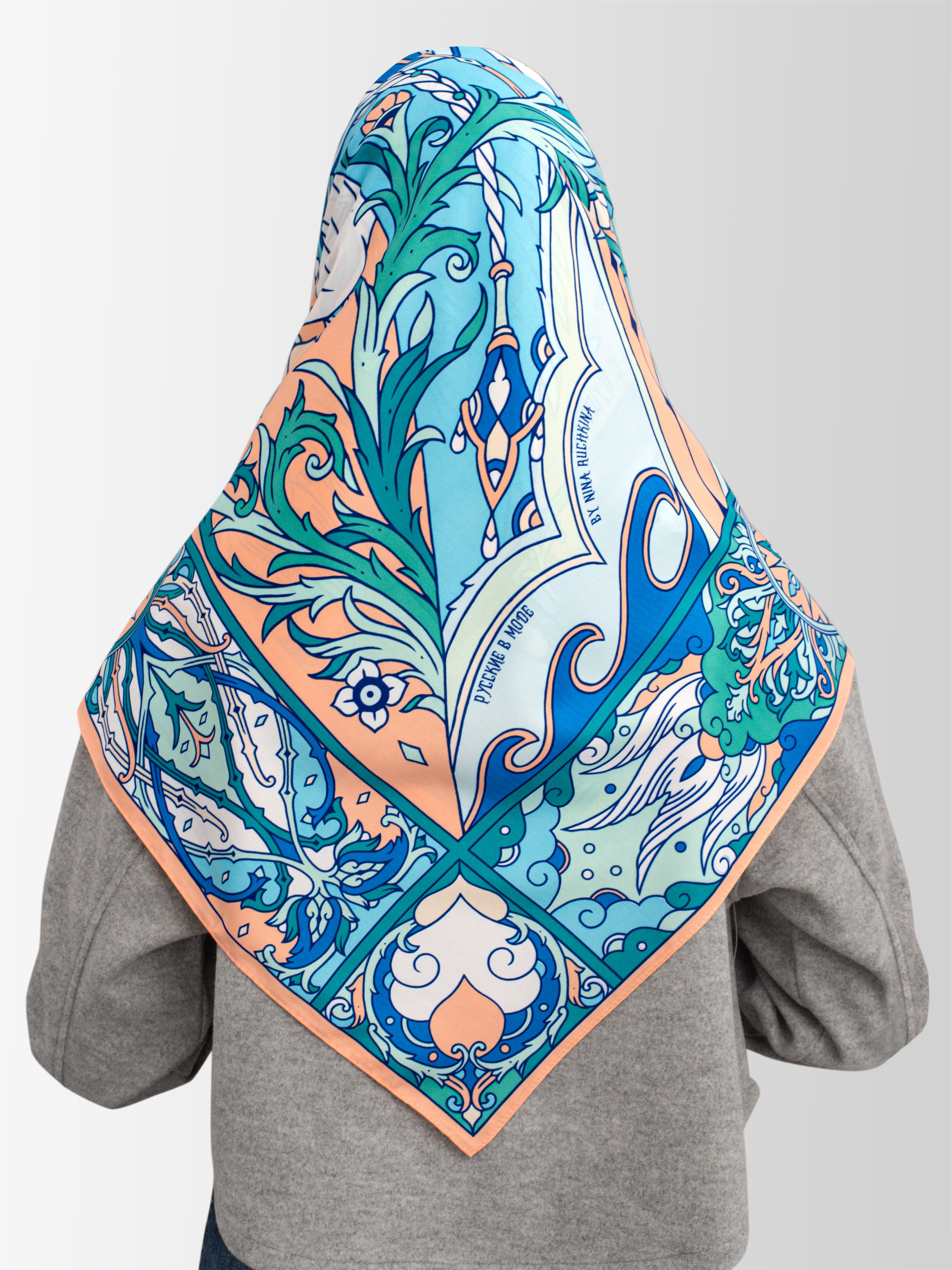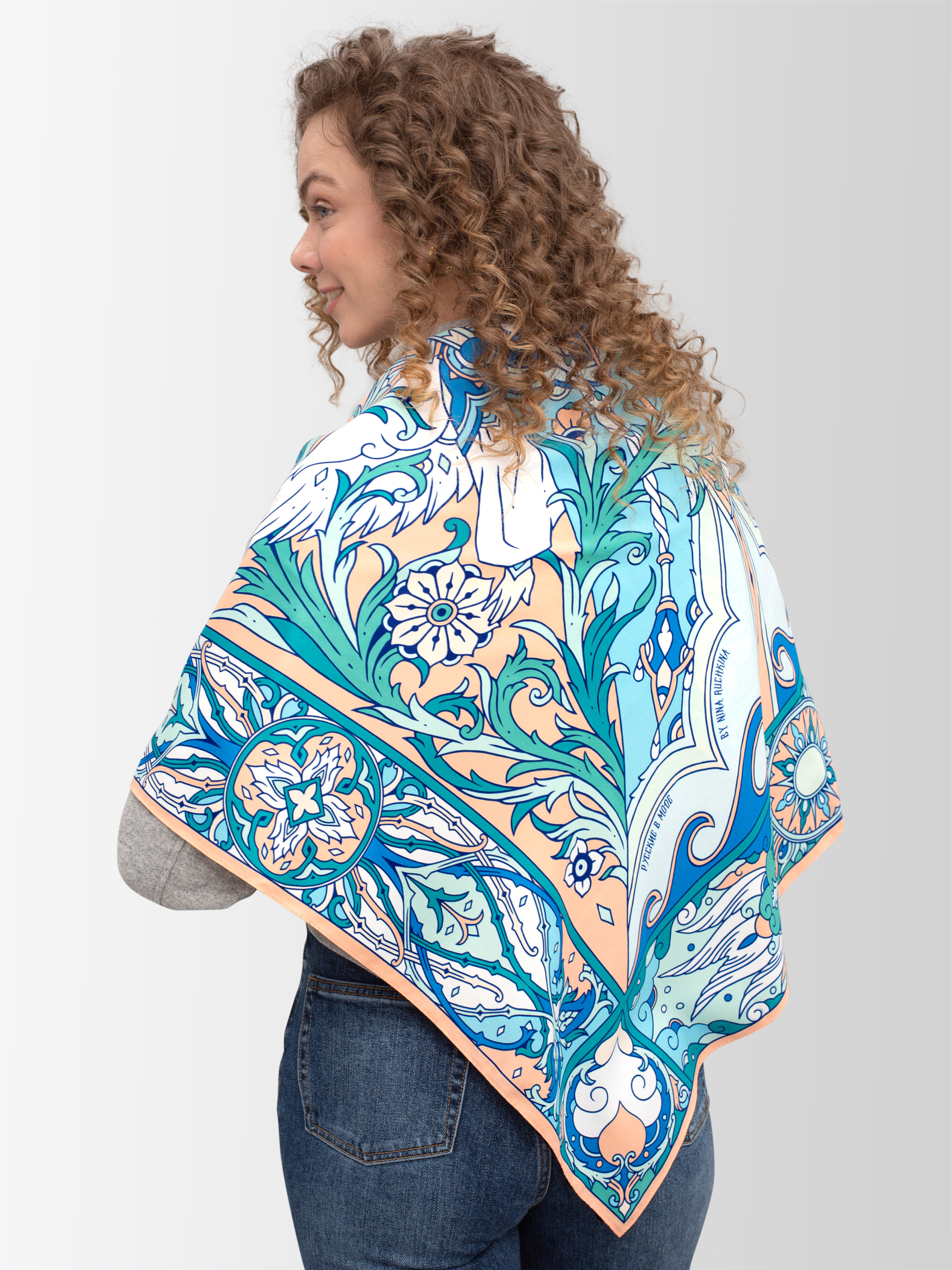 Этот платок вызвал восторг у девушки с каштановыми волосами и карими глазами, а сказочный сюжет - у её маленькой дочки. Удивительное свойство платков Нины - они идут совершенно разным типам женщин и девушек. Очень рекомендую к покупке!