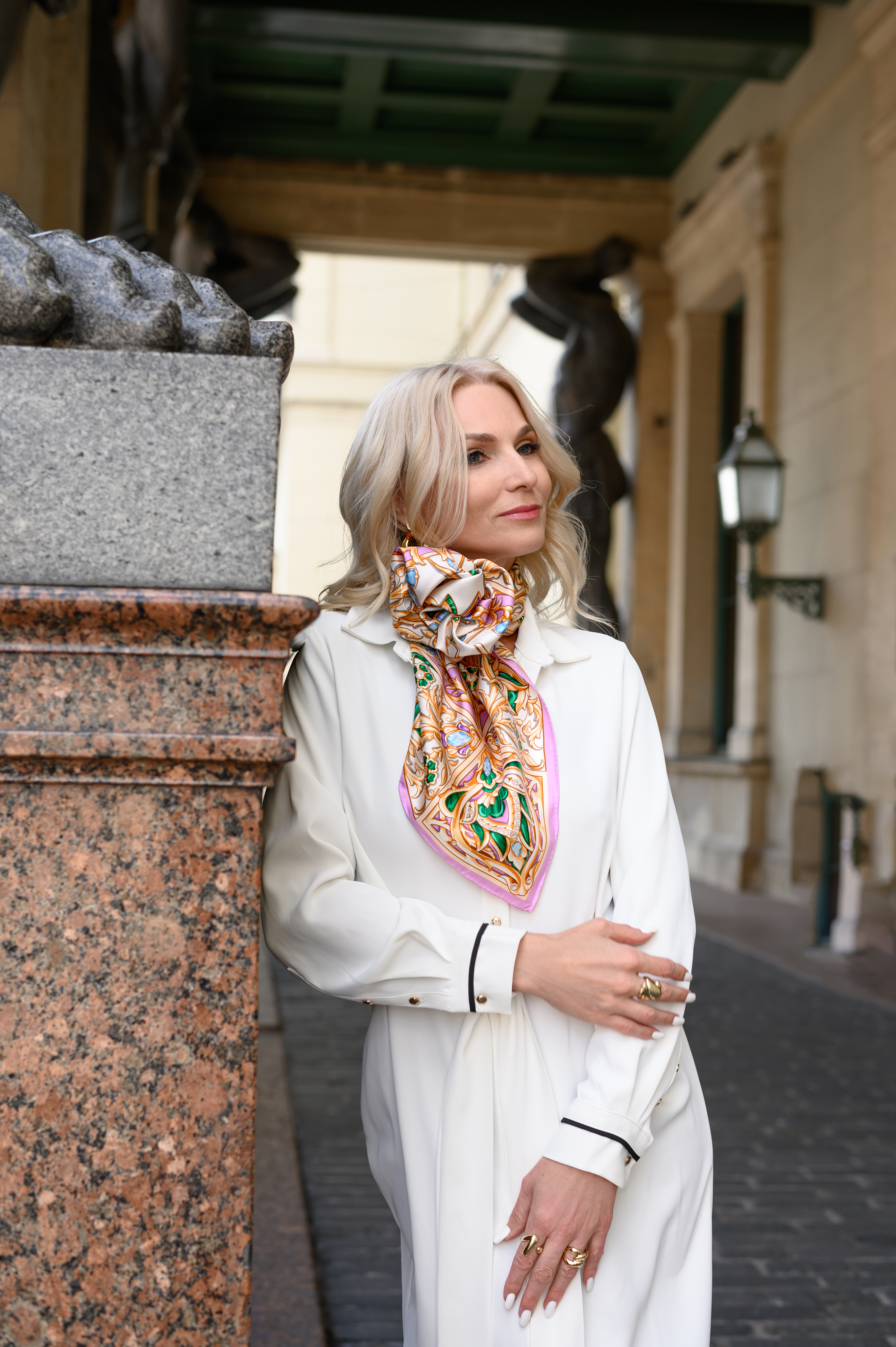 Платок «Уральские арабески» выполнен в гармоничном сочетании золотого, изумрудного, аметистового цветов. Элегантный и женственный, он станет роскошным дополнением к любому образу и прекрасным дипломатическим подарком.
