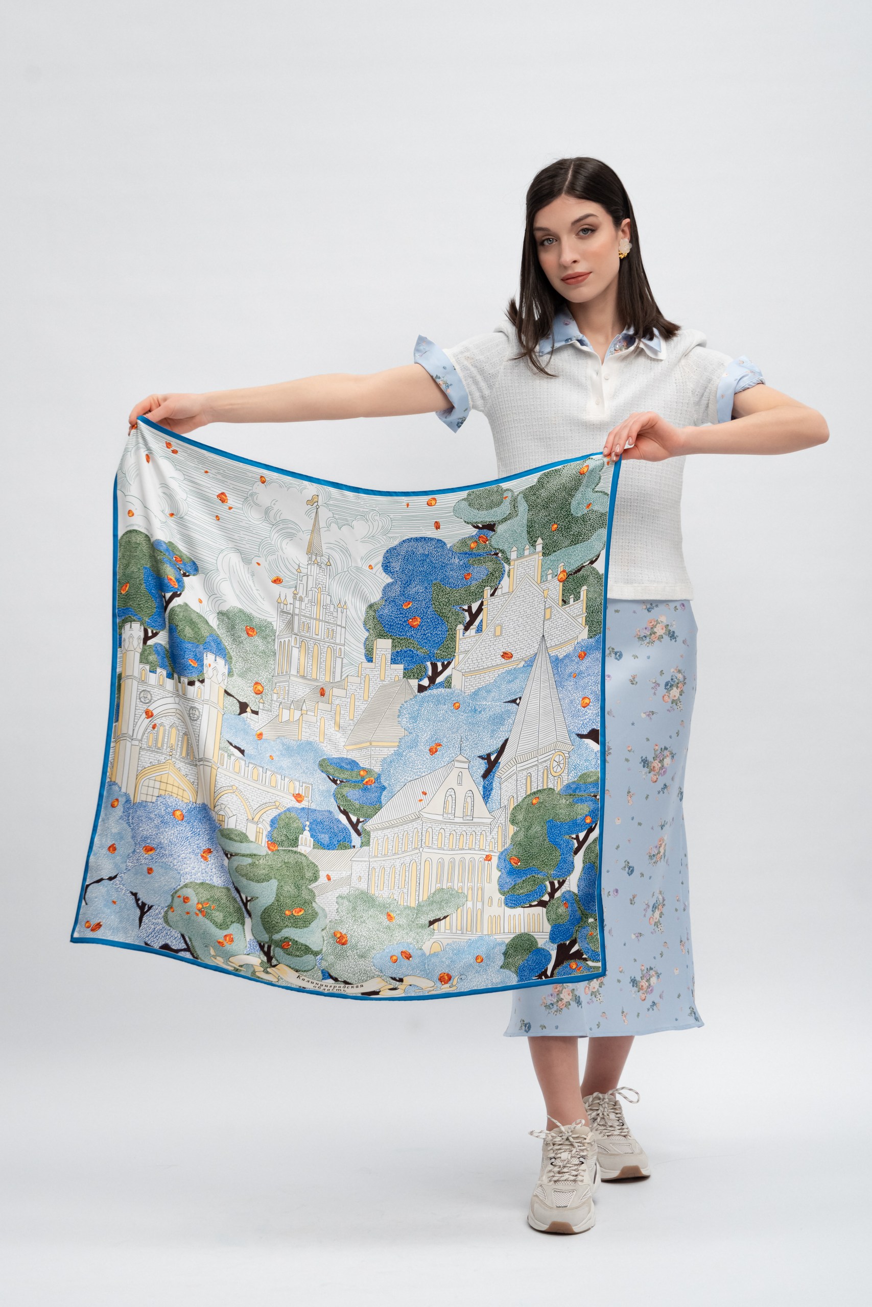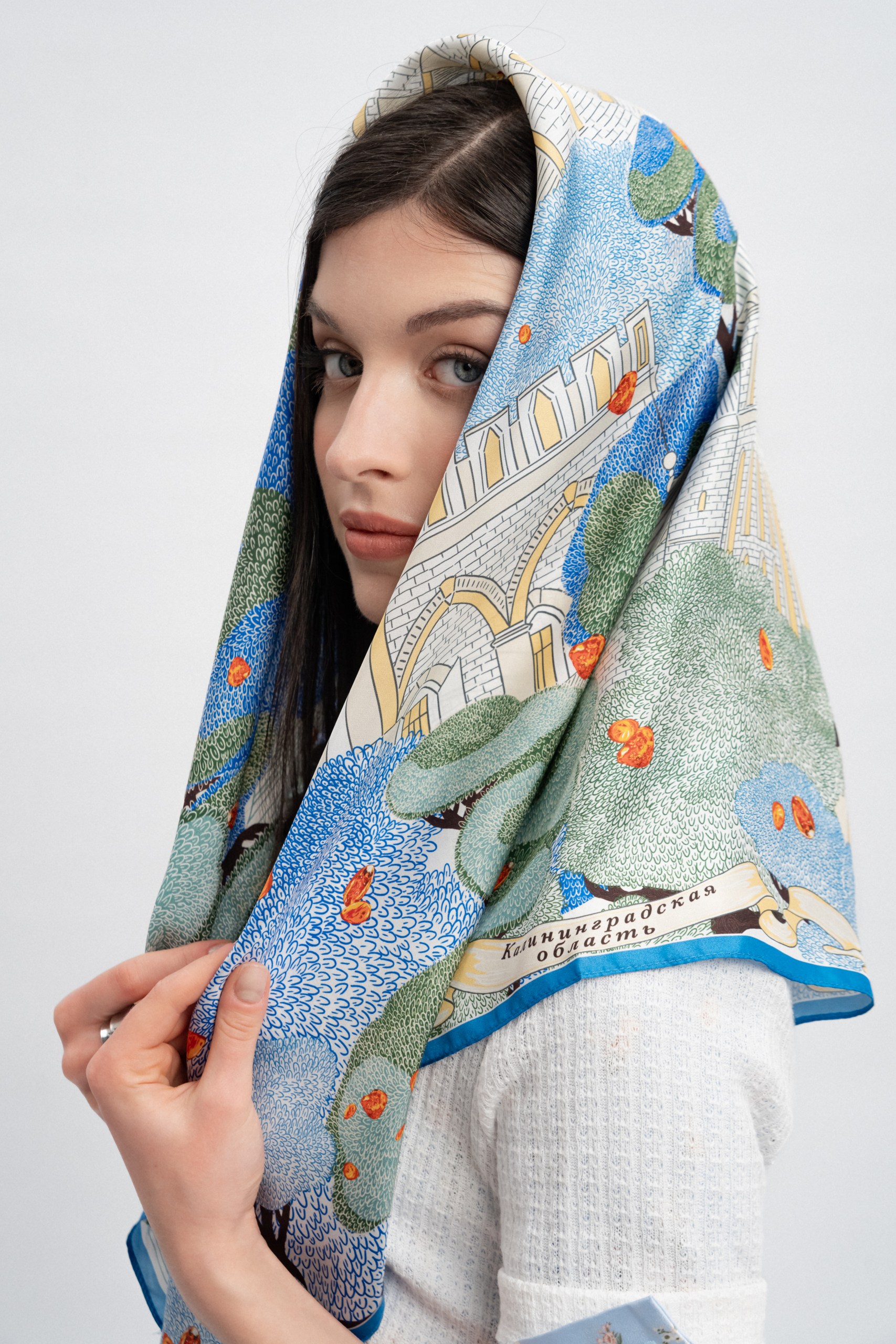 Композиция платка воплощает художественное обобщение исторического образа самого западного региона России — Калининградской области.