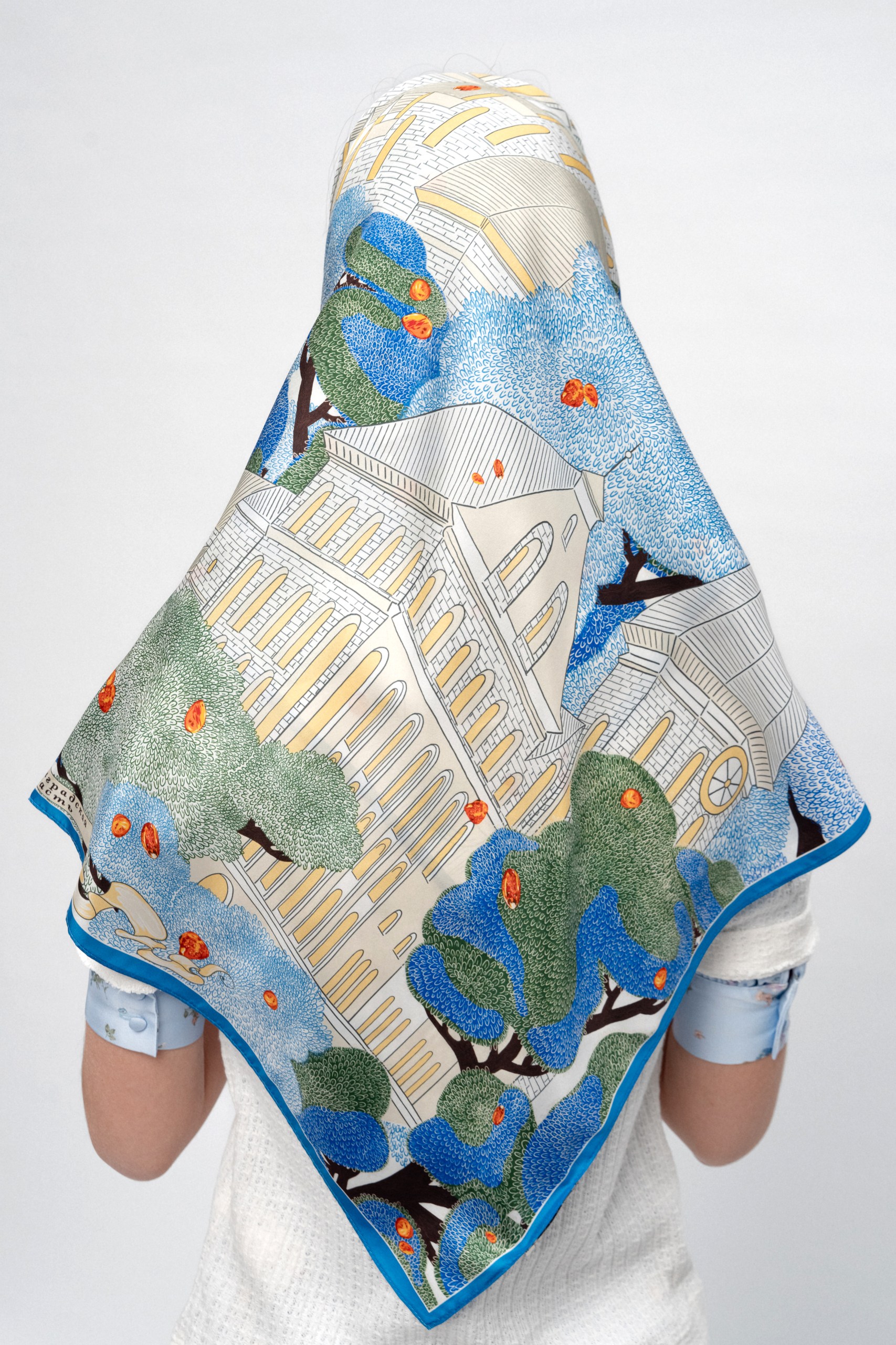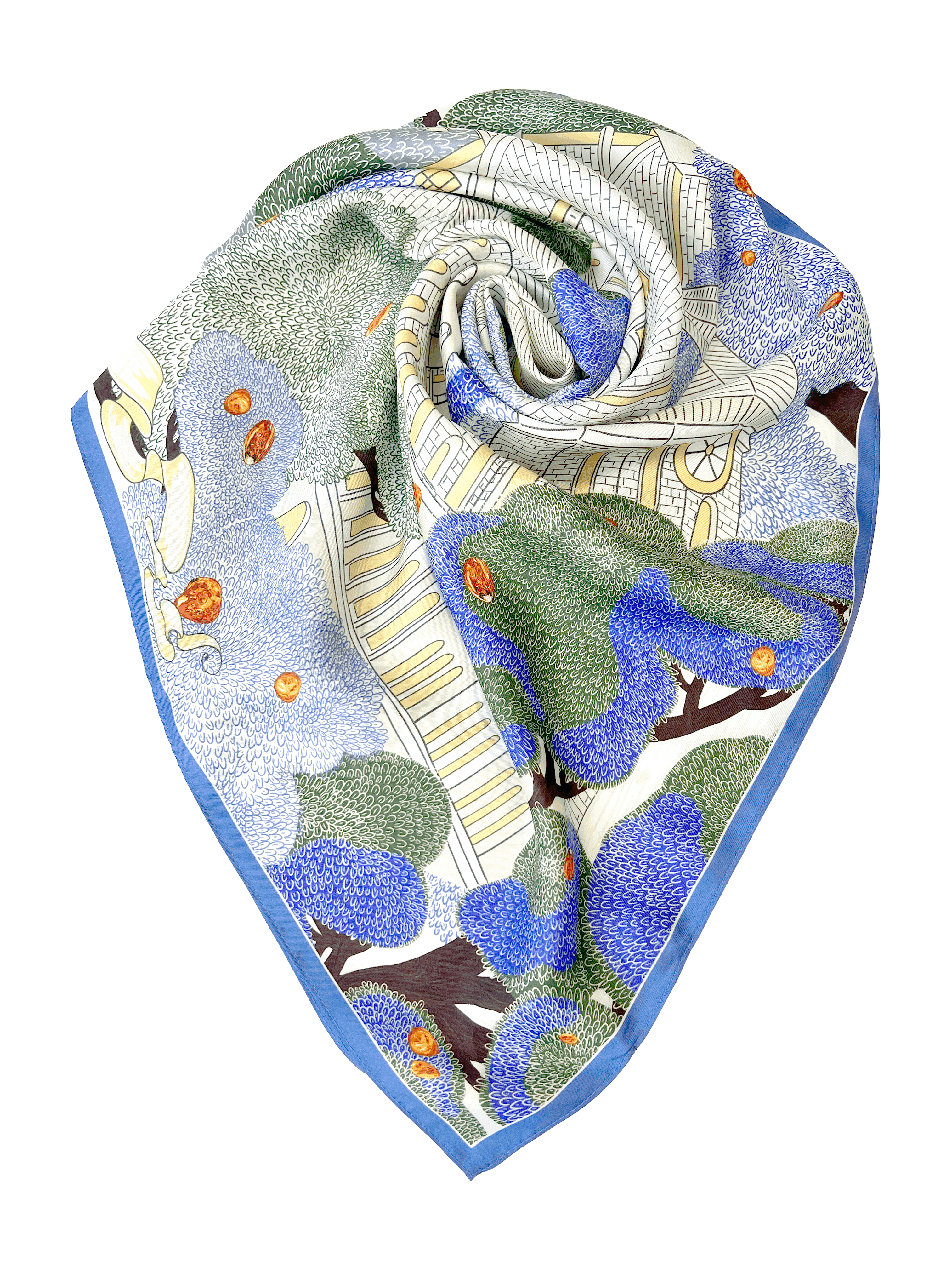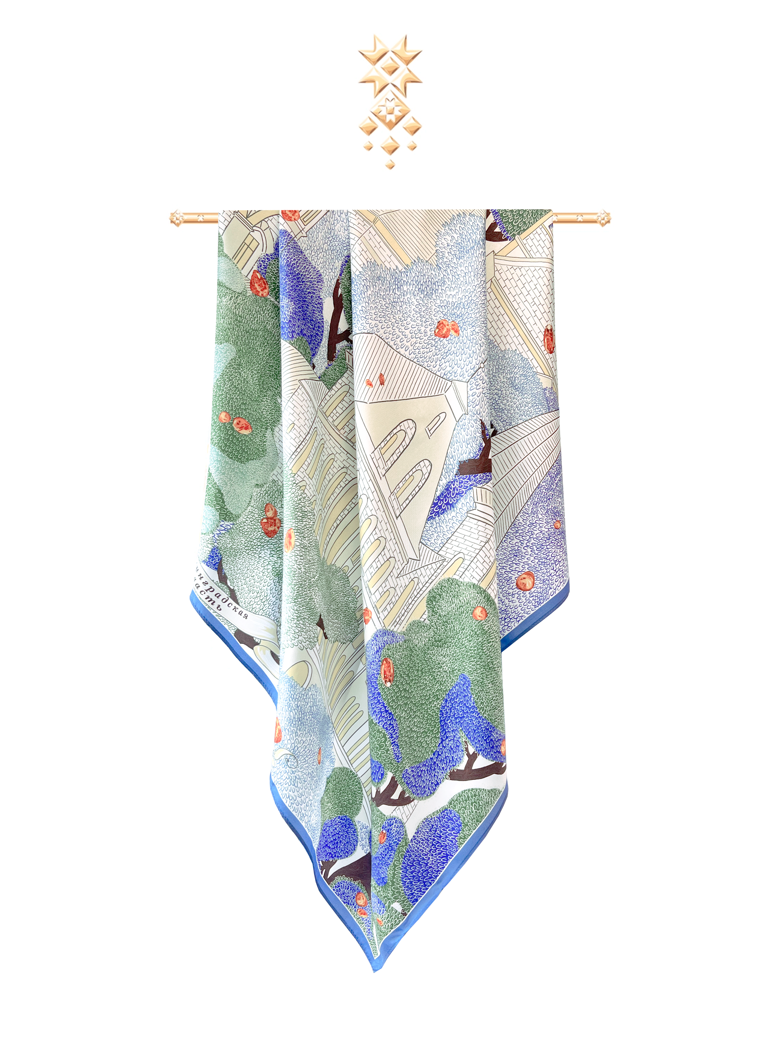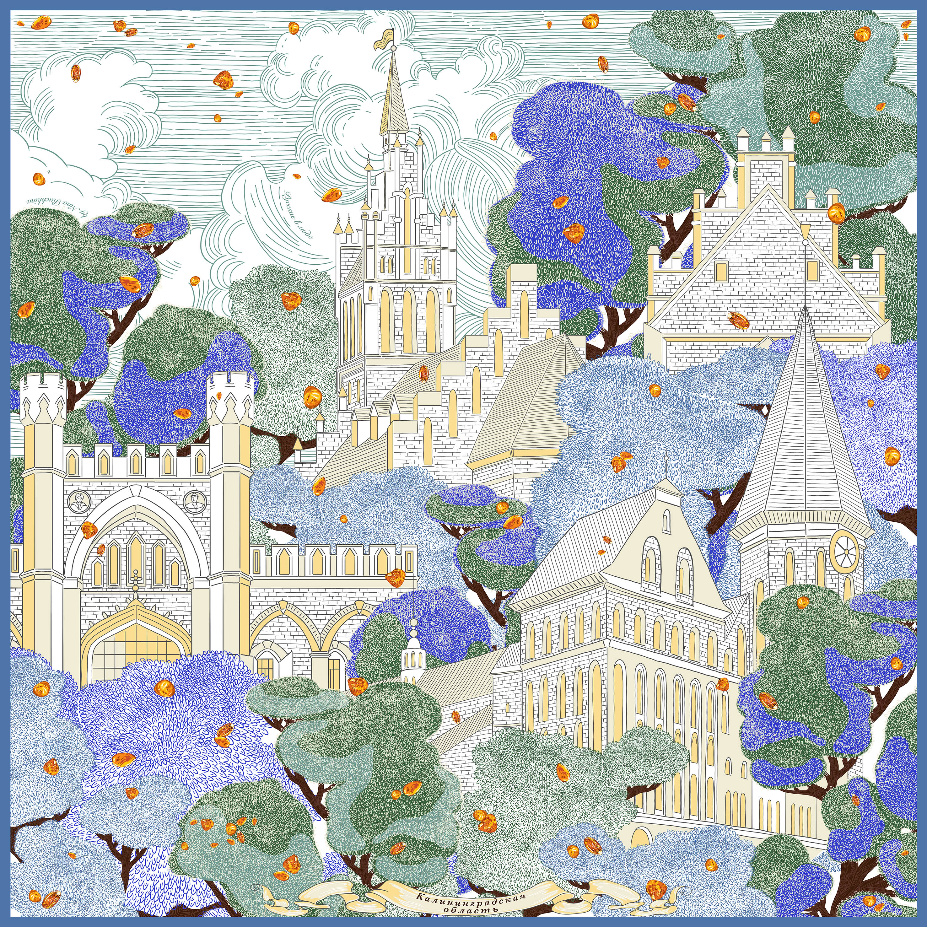Далее разворачиваются городские ансамбли XIX-начала XX вв., среди которых знаменитые Росгартенские ворота, Кирха памяти королевы Луизы (Областной театр кукол), возведенная в стилистических чертах романики и модерна. Изысканная архитектура органично вписана в зеленый ландшафт с пышными кронами деревьев, создавая настроение умиротворения и созидания. Декоративный мотив платка представлен россыпью янтаря, чье крупнейшее месторождение находится в Калининградской области, известной как «Янтарный край России».