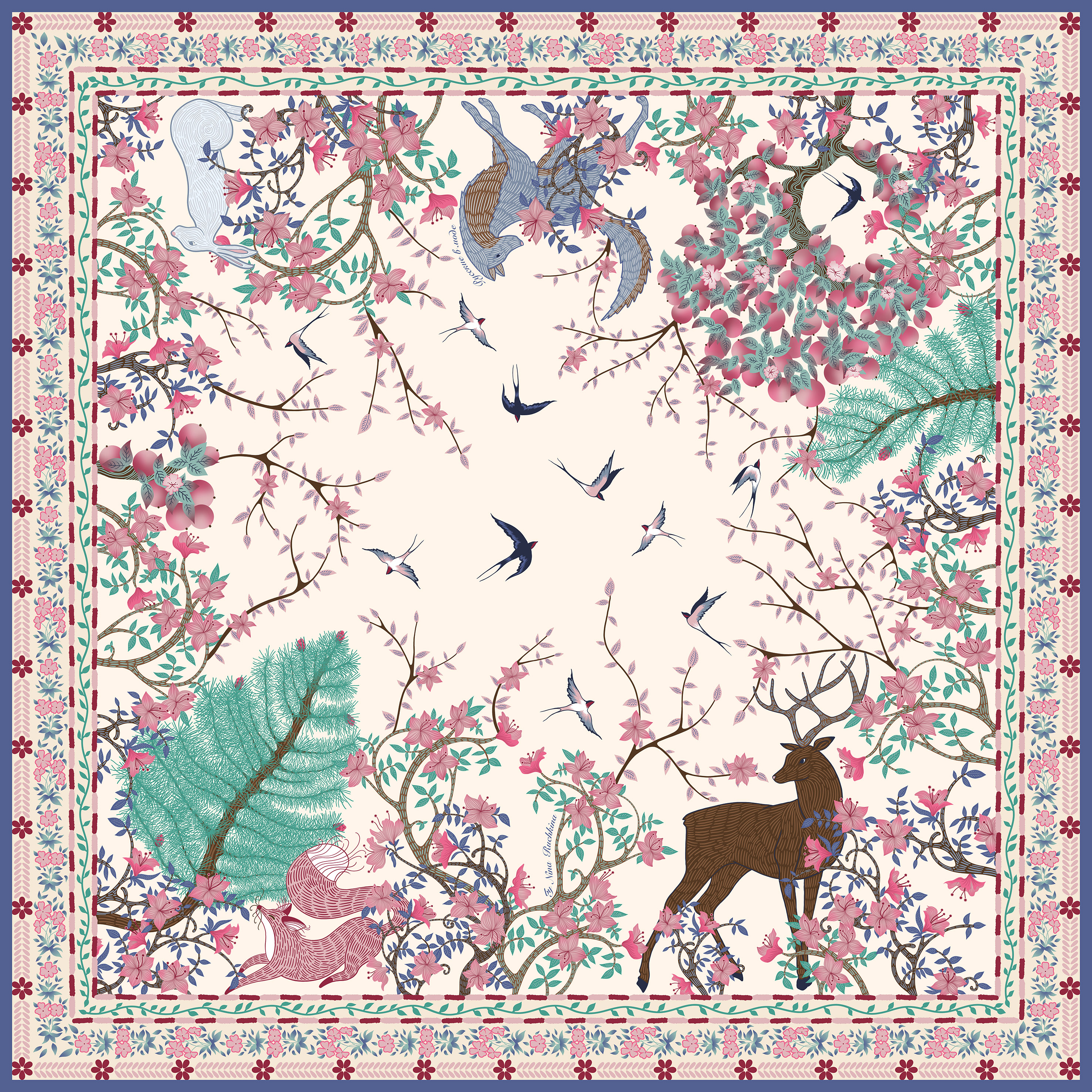 Вокруг раскинулись плодоносящие кустарники, хвойные деревья, цветы и бутоны, создавая настроение благоденствия. Образы лисицы, зайца, волка, оленя – ценные представители фауны региона и герои народного фольклора – выполнены в декоративной изящной манере. Утонченная палитра платка решена в сочетании мягких оттенков бежевого и розового цветов, с включением деликатных колористических акцентов.