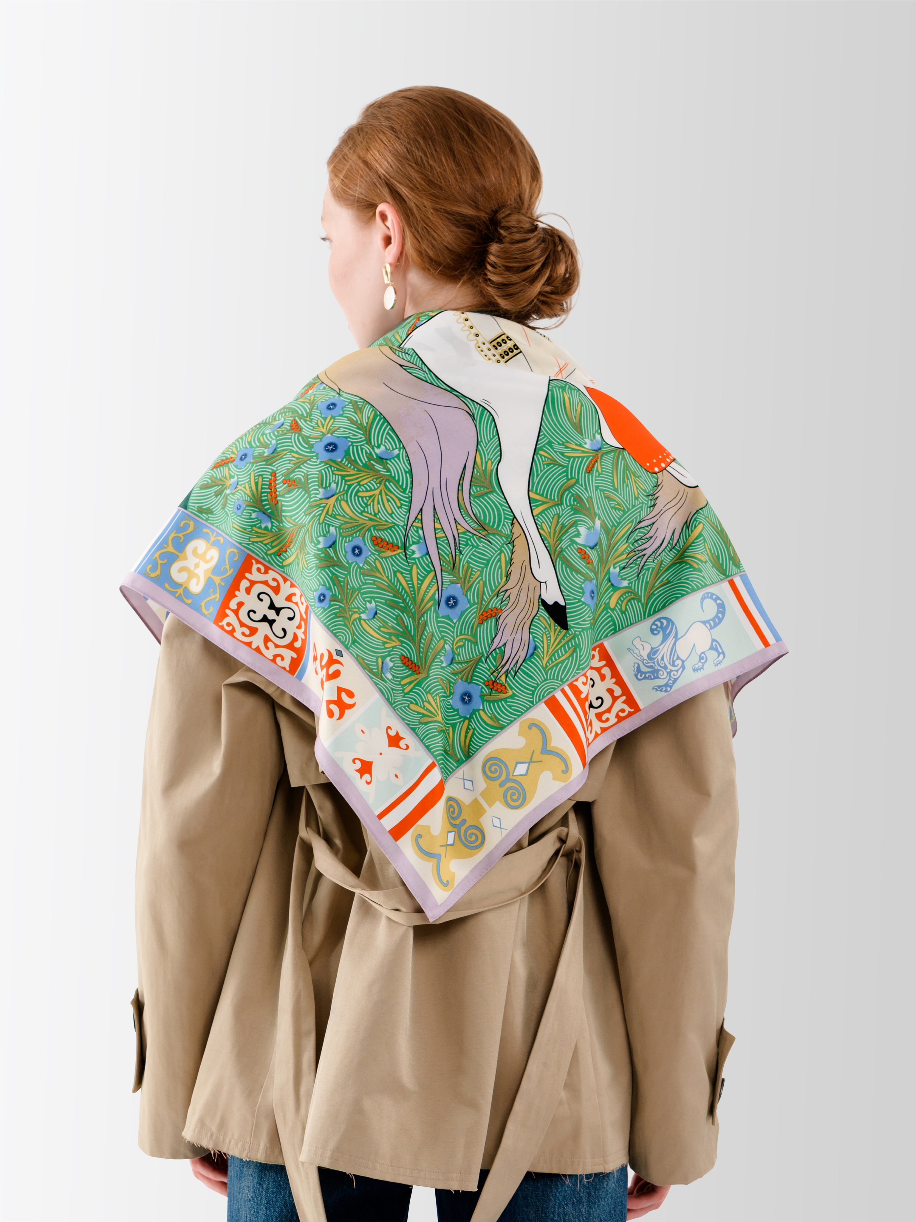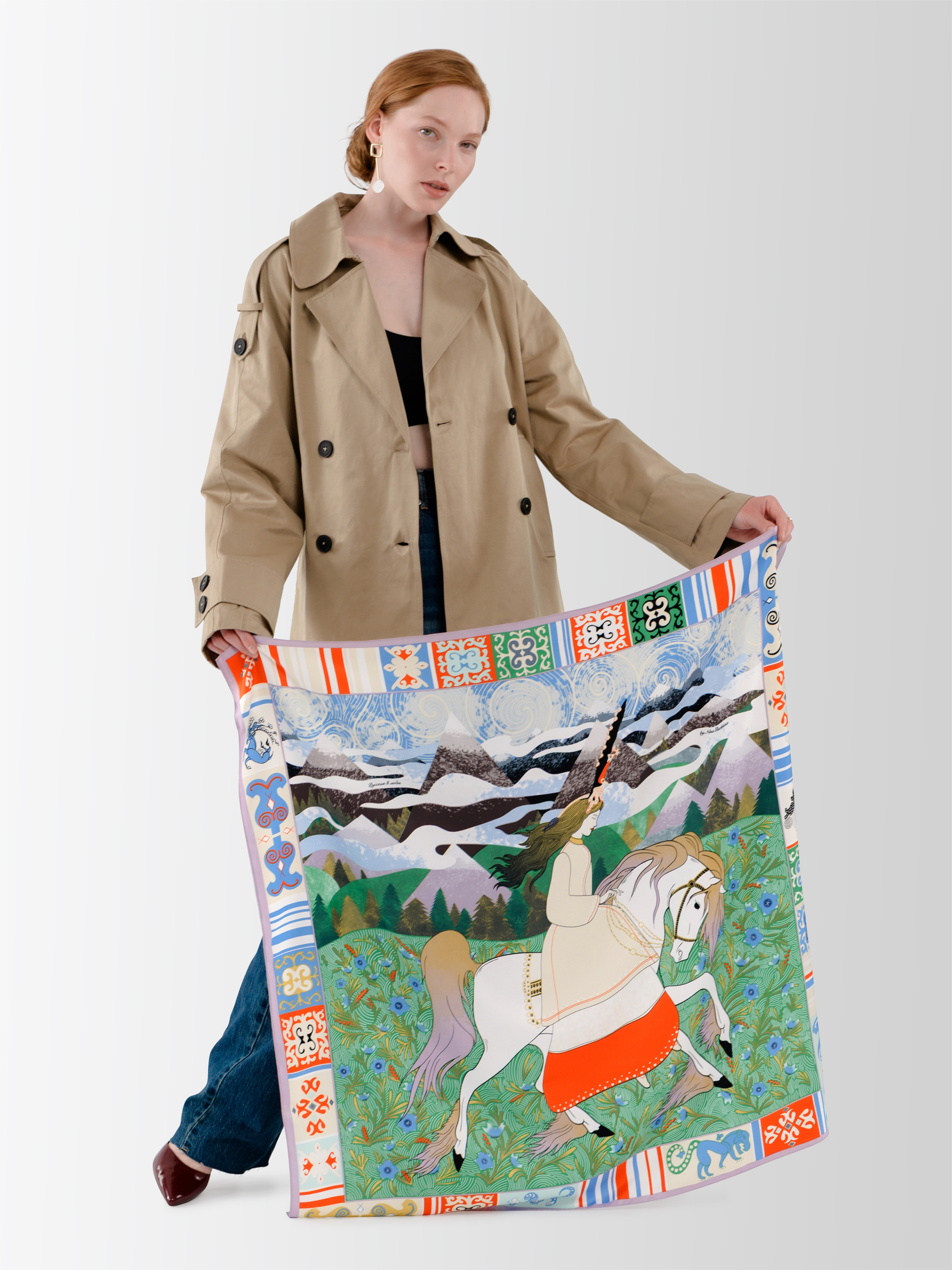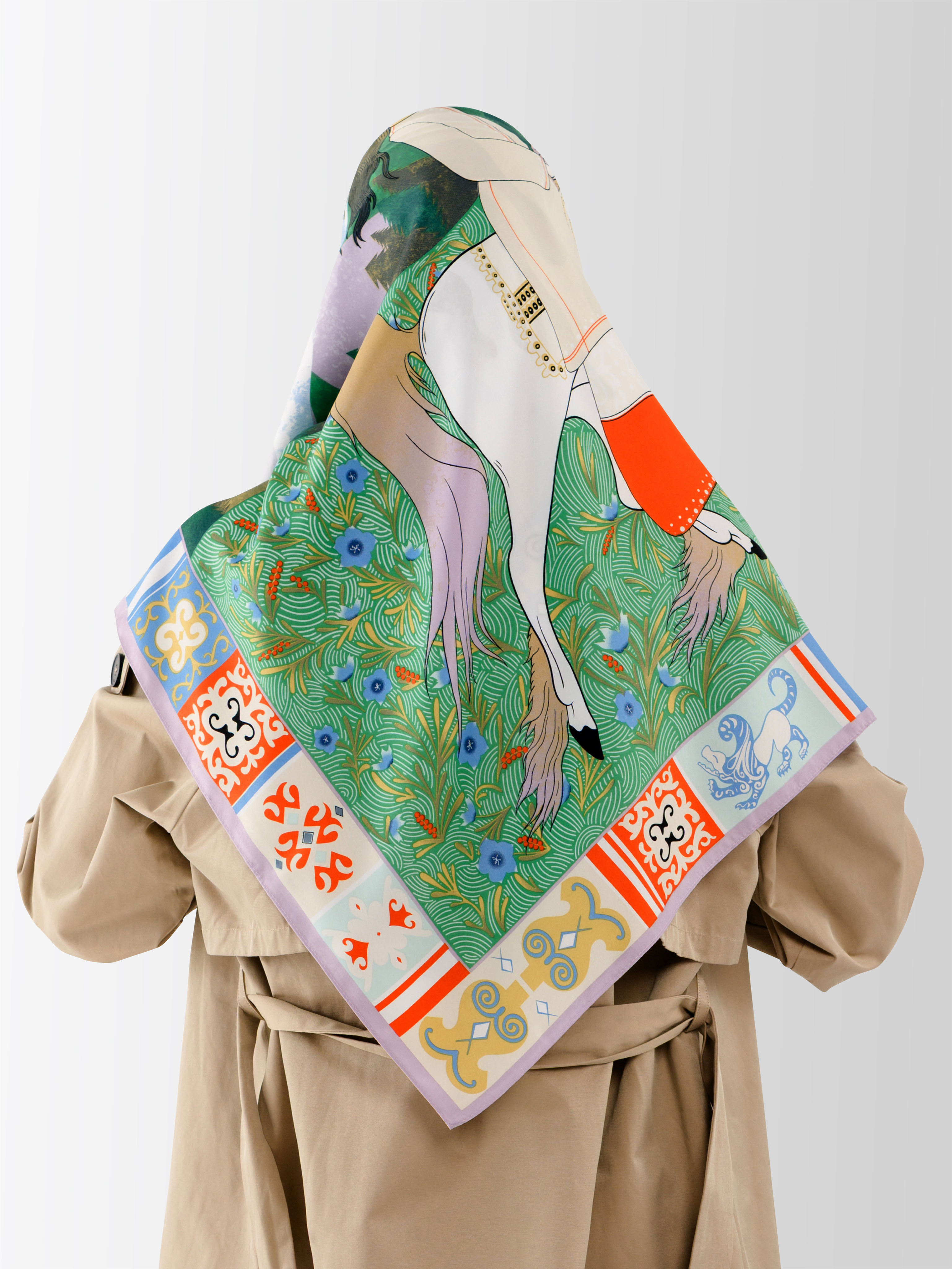 На платке представлено метафоричное воплощение женской силы, связанной с мифологией Алтая. Согласно алтайским представлениям, каждая женщина — дочь Великой Матери – Умай Эне и подобно ей наделена способностью преображать мир. Образ вобрал в себя черты Алтайской принцессы, отсылающие к реальным археологическим находкам.