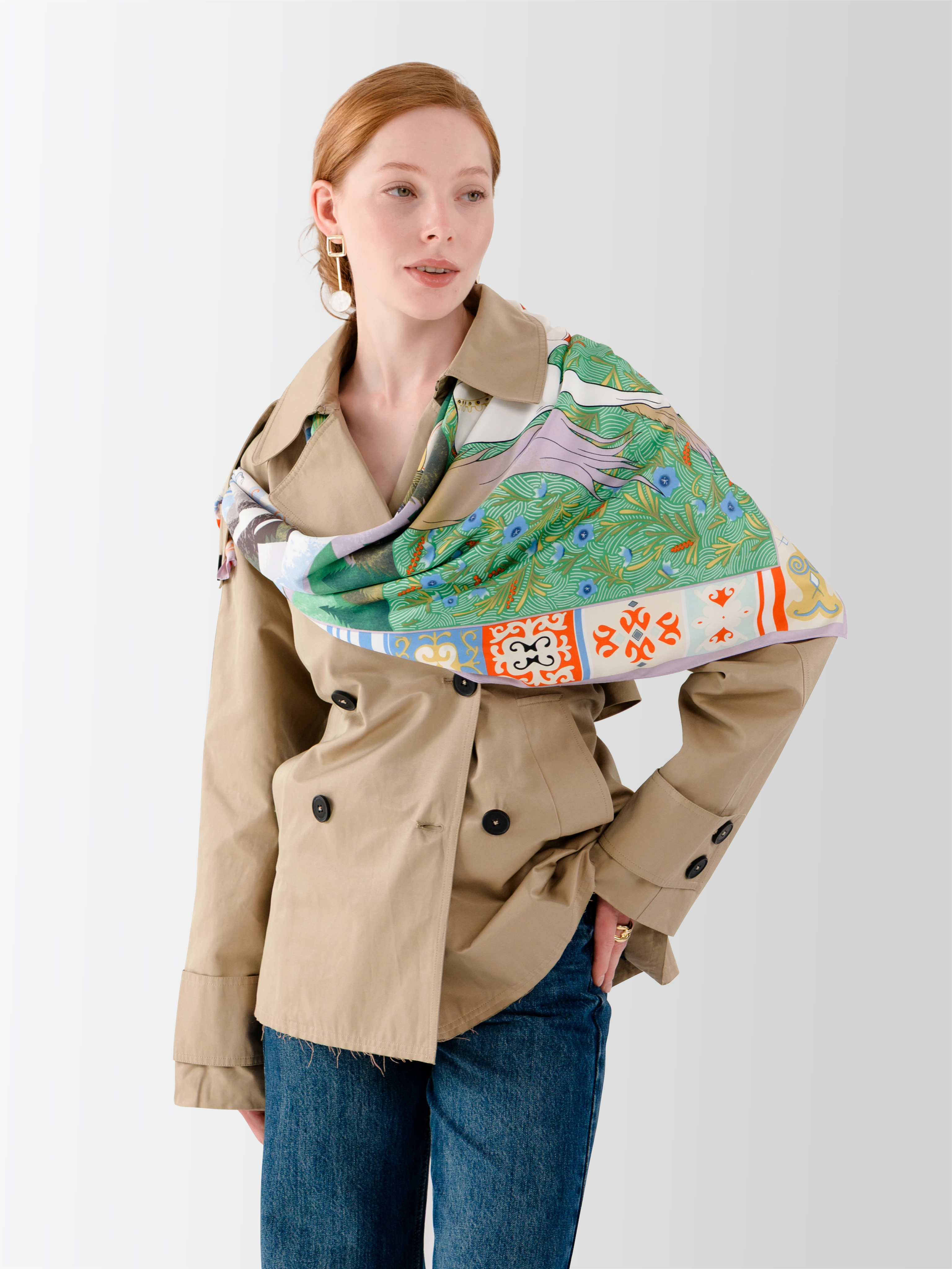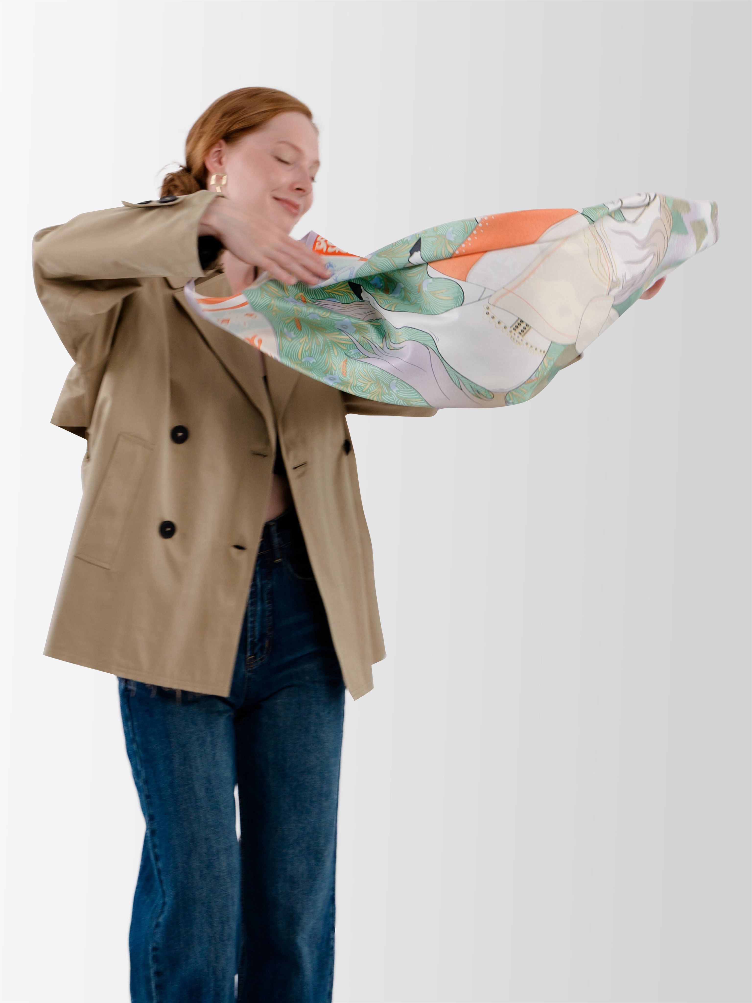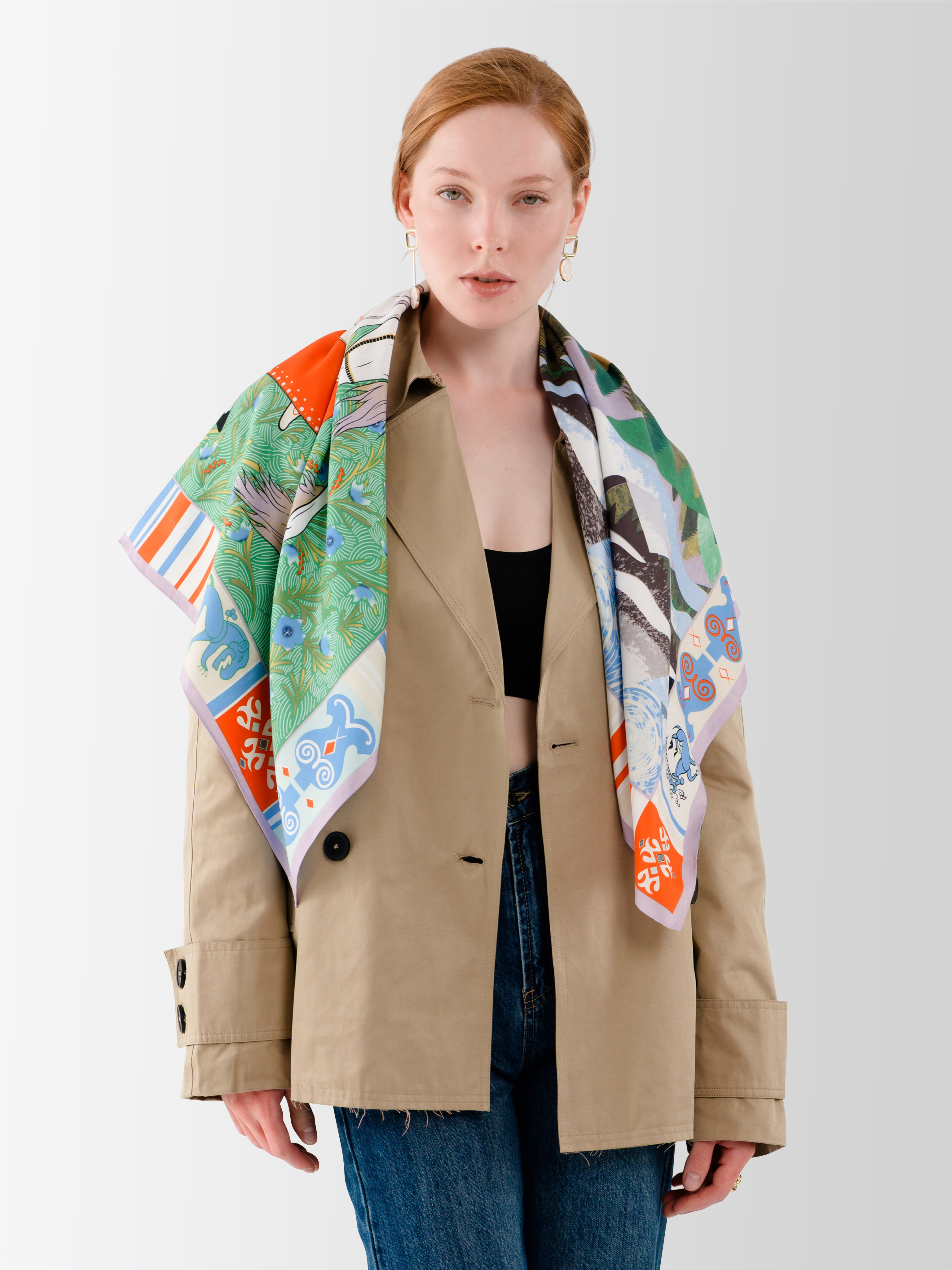 На платке представлено метафоричное воплощение женской силы, связанной с мифологией Алтая. Согласно алтайским представлениям, каждая женщина — дочь Великой Матери – Умай Эне и подобно ей наделена способностью преображать мир. Образ вобрал в себя черты Алтайской принцессы, отсылающие к реальным археологическим находкам.