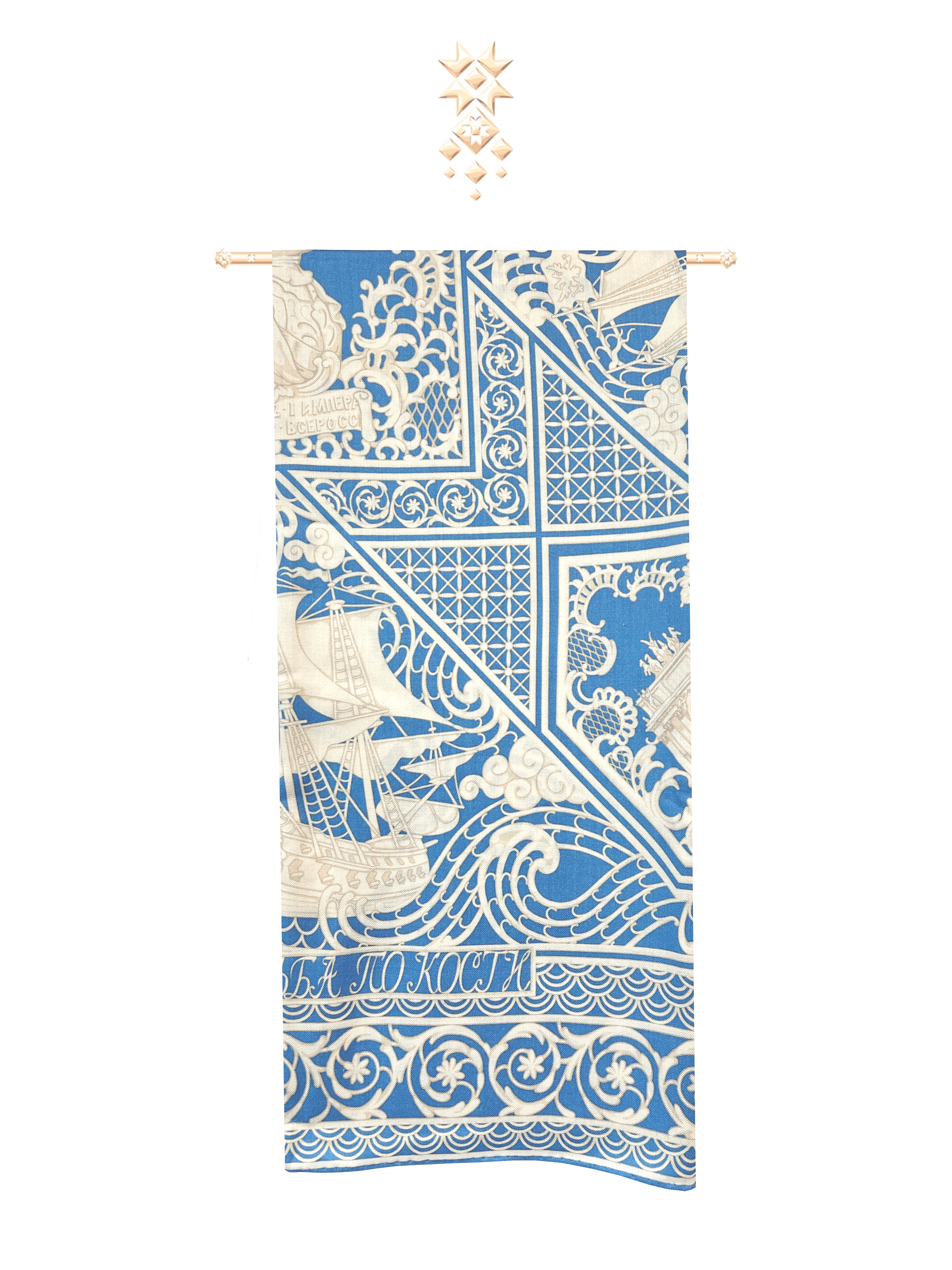 Тематика аксессуара - Петровский Флот. В центре - декоративная резная пластина в пышном обрамлении с профилем великого русского самодержца Петра I. По углам - резные вставки с узнаваемыми архитектурными шедеврами Петербурга разных времён: «Нарвские триумфальные ворота», «Здание Главного адмиралтейства», «Троицкий собор Александро-Невской лавры», «Исаакиевский собор». Дополняют композицию петровские фрегаты, раскачивающиеся на волнах ажурного кружева.