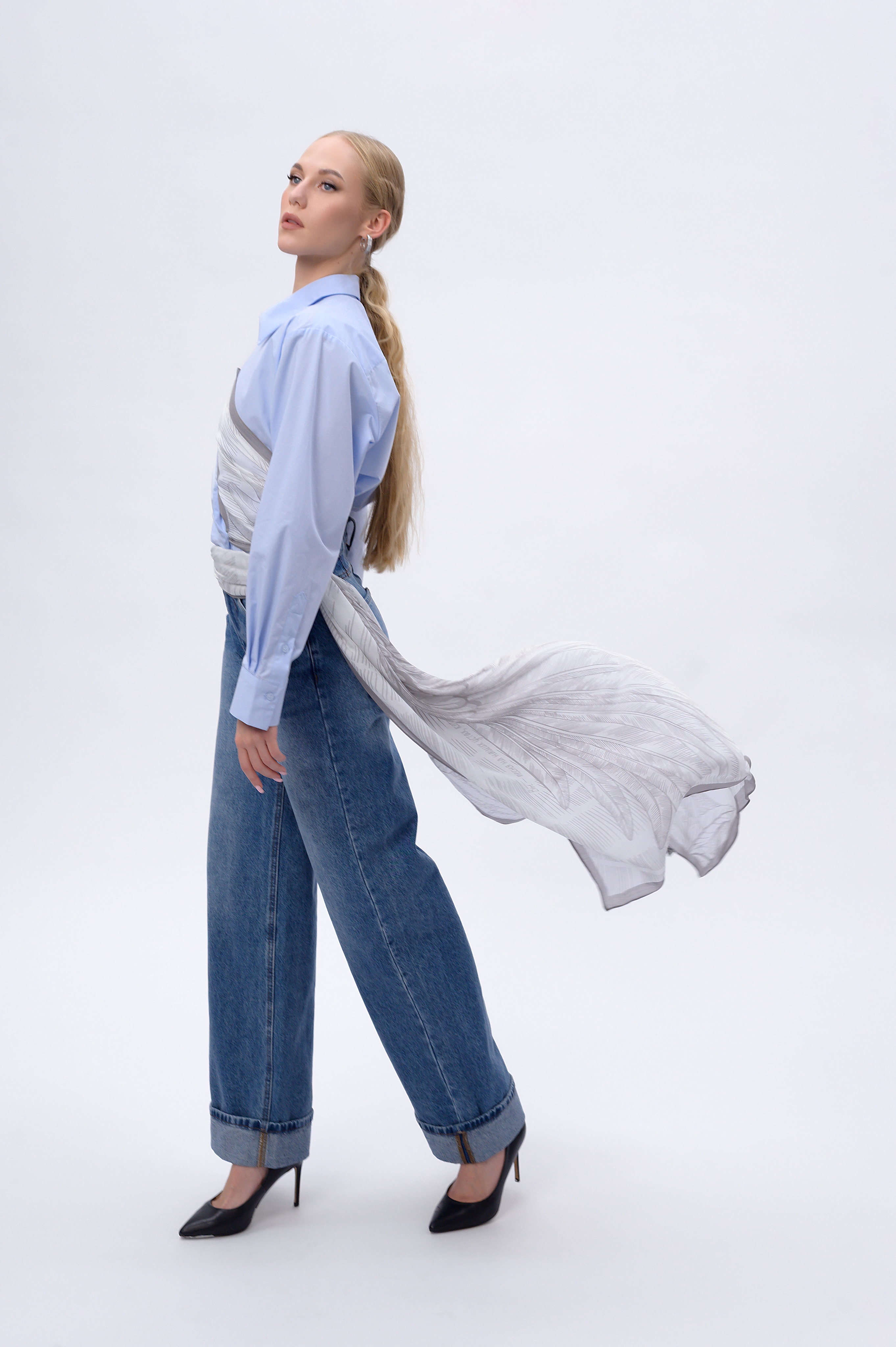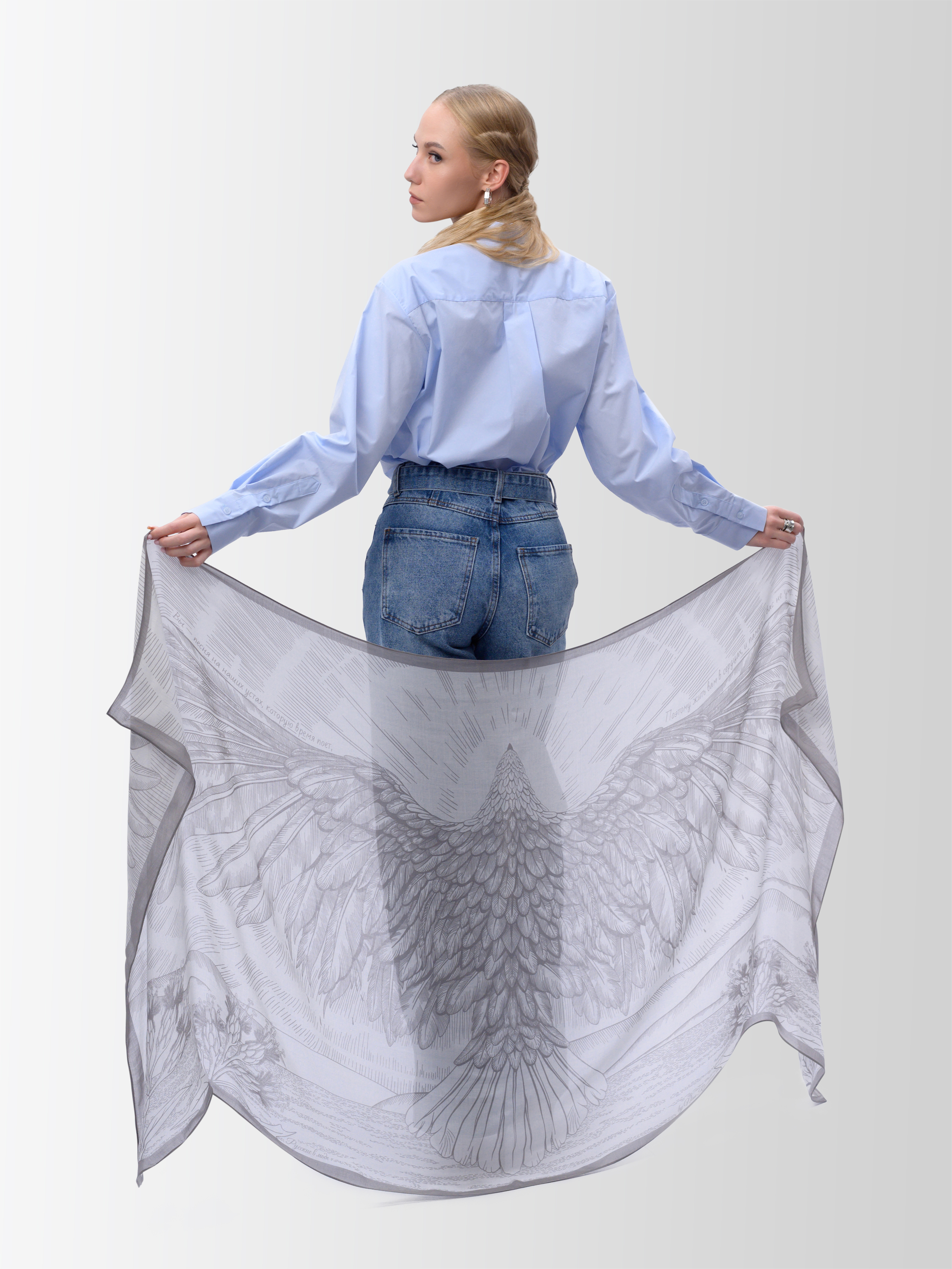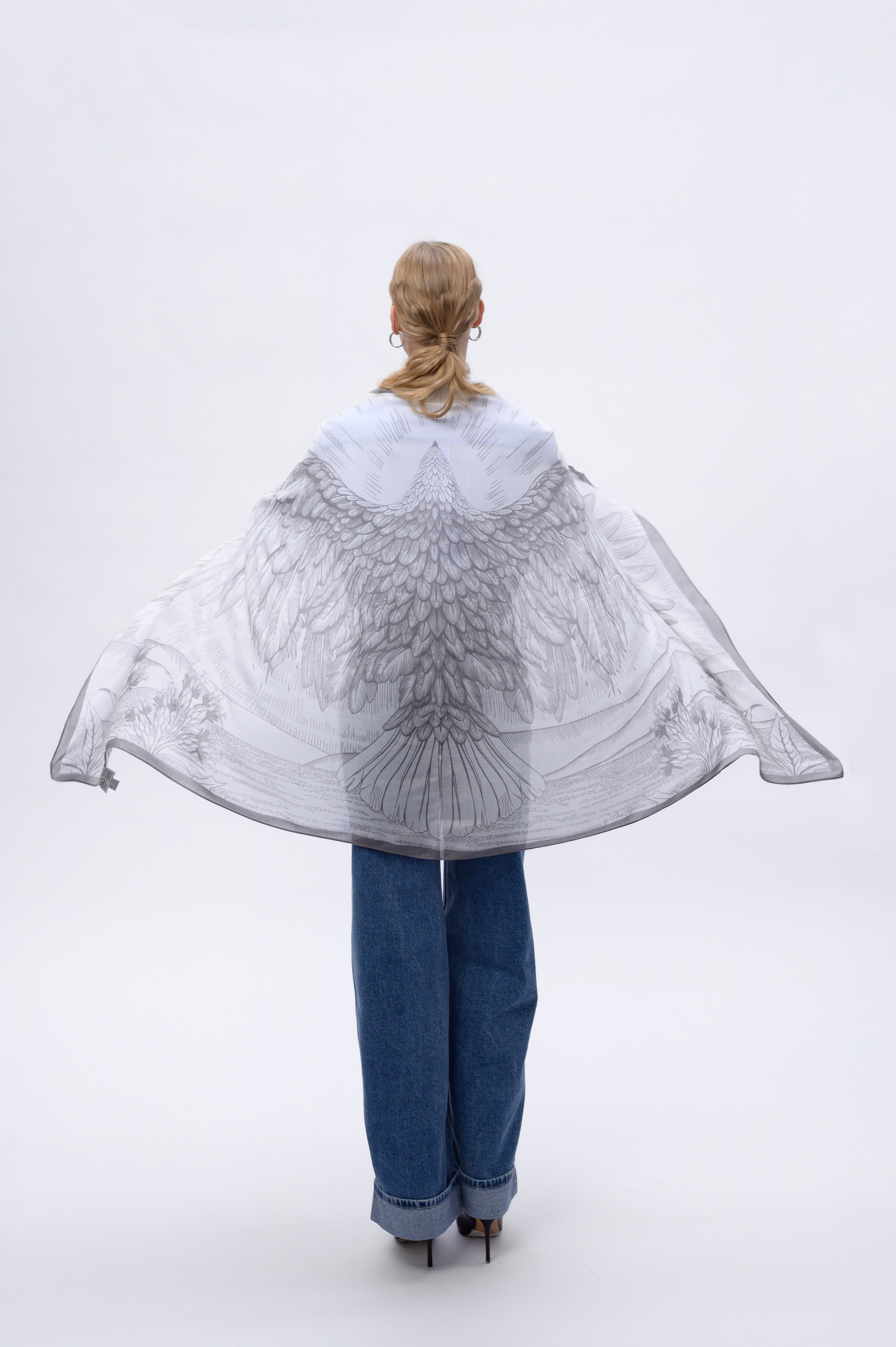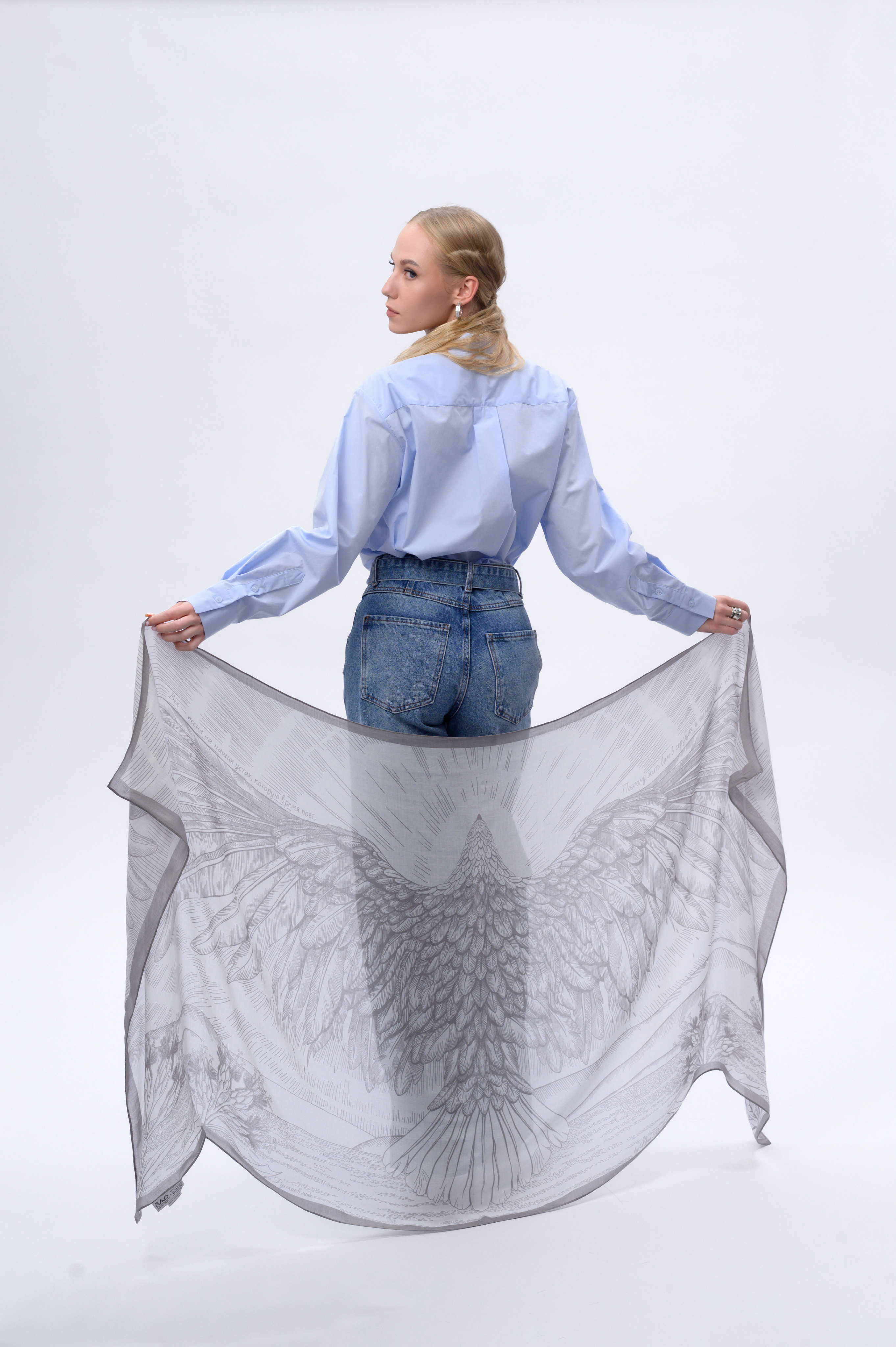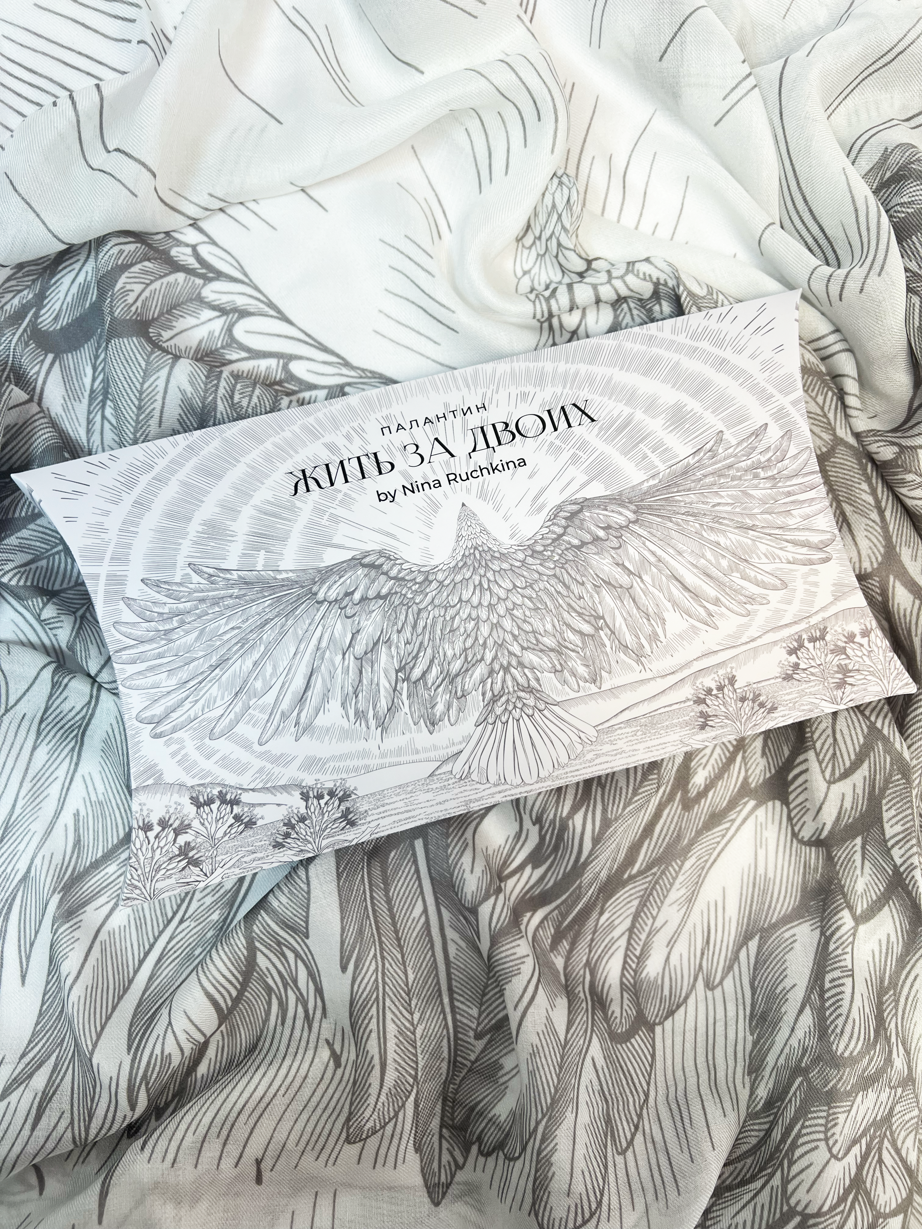 На палантине распахнутые два крыла орлана подобны нежным объятиям тех, кто навсегда остался в наших сердцах, стал немеркнущей гордостью России. Крылья, как руки наших верных Сынов Отечества, которые всегда спасут, уберегут и укроют от всех невзгод, горя и бед. Поэтому и нужно продолжать жить и показывать всем пример, как надо ценить эту Жизнь. Ведь именно за нее наши Сыны отдали свои жизни».